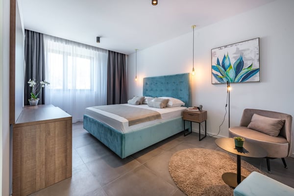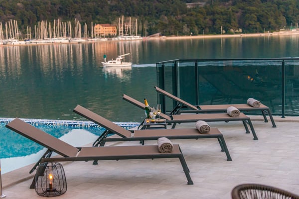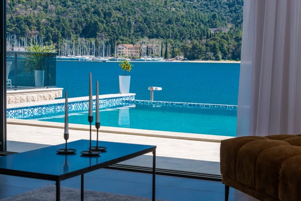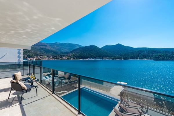 Welcome to the seafront luxury Villa Ocean Blue I, located in the small coastal town of Slano, just 30 km away from Dubrovnik Old Town and only a few steps from the azure blue Adriatic sea. Slano is a lovely town where you can enjoy water sports, rent a boat to explore the beautiful islands, and enjoy the peaceful holiday atmosphere. Villa Ocean Blue I is truly a magical place to spend your vacation, relishing the incredible view of the turquoise bay right in front of you and having complete privacy on a sunbathed terrace. It can host up to 12 guests which makes it perfect for families and friends vacationing together. This modern, newly built holiday house spreads on 350 square meters of the interior, featuring five en-suite bedrooms, and a modern open-plan kitchen with a gorgeous colourful living and dining area from which you can step onto the sunny terrace and the infinity swimming pool. Mesmerizing views through the house and an abundance of natural light coming in make the harmonious space flow and give the much-needed sense of serenity. Outside on the terrace, you can enjoy al fresco dining or an afternoon siesta on one of the comfortable sunbeds. One of the en-suite bedrooms is set on the ground floor, along with an additional bathroom with a walk-in shower and a laundry room. Through the indoor stairs, you will reach the first floor with three more luxurious en-suite bedrooms, each fully equipped and carefully decorated, and air-conditioned, with two of them featuring sea-facing terraces. The top floor comprises a lovely suite with two single beds, a private bathroom, and a living area with a modern kitchen open to a large, private terrace with a lounge area and lovely views of the bay. Different levels of Villa Ocean Blue I ensure enough privacy for each guest, while the ground floor open space area and the terrace provide the opportunity of getting together to relax by the pool or having a delicious meal. The villa is fully air-conditioned, equipped, and has parking in the villa's garage. There's no doubt your vacation will be an unforgettable adventure in our seafront Villa Ocean Blue I!