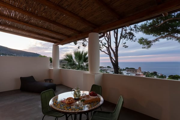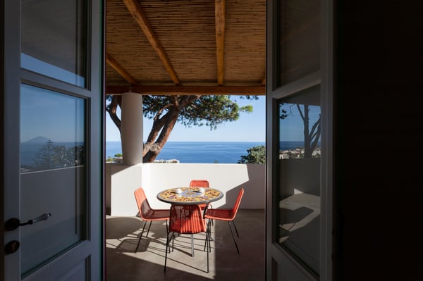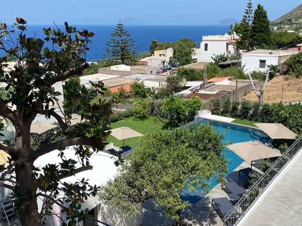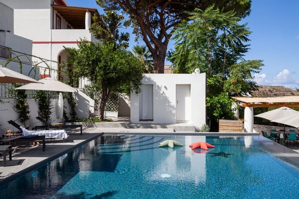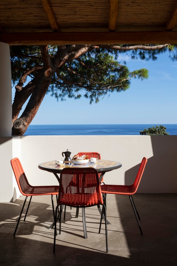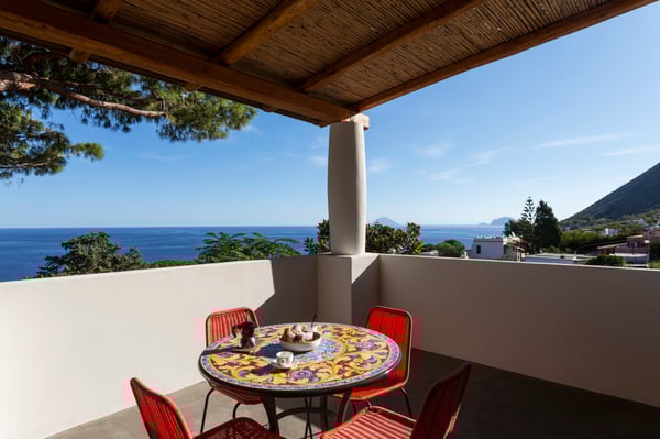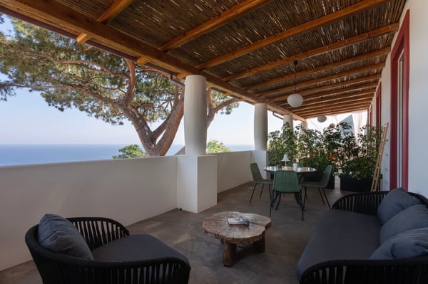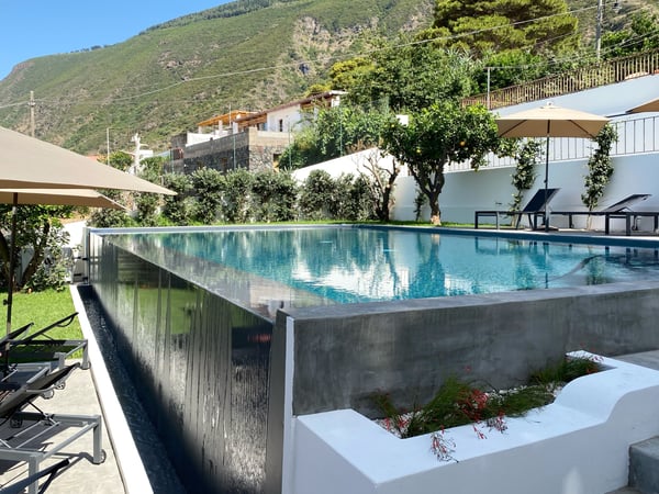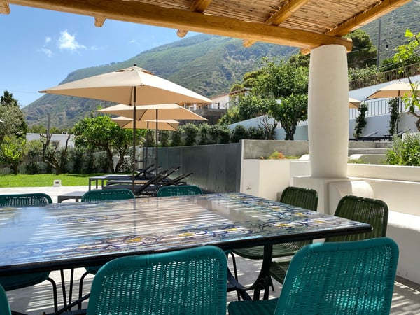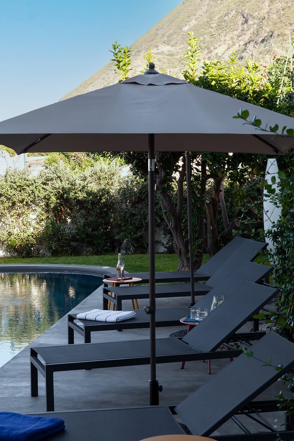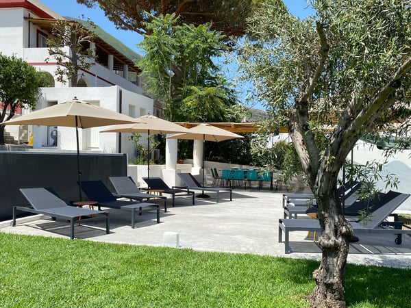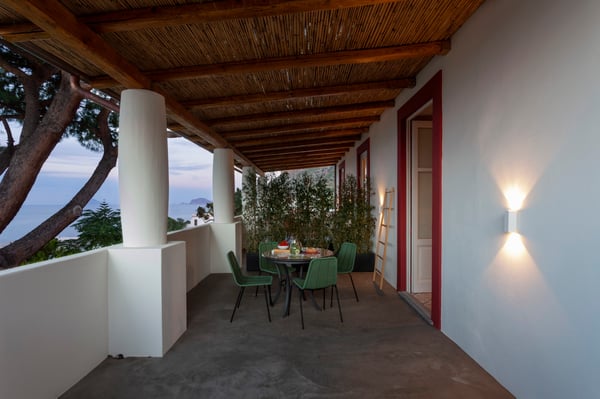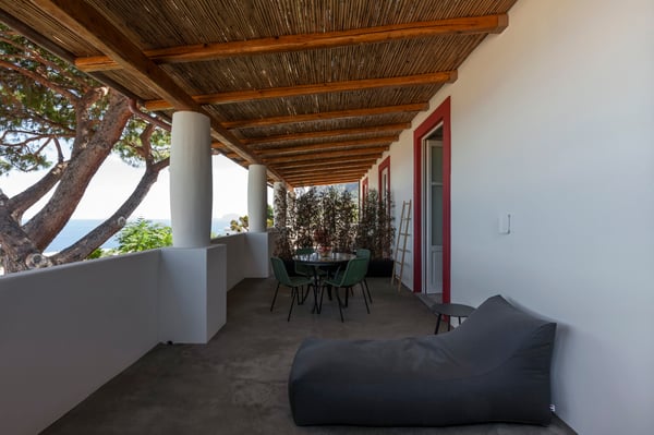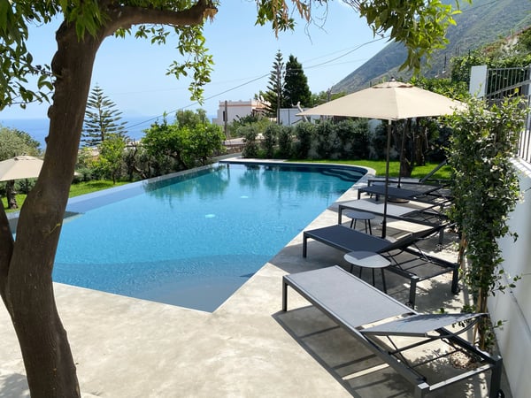 La Segreta has an important history: former barrack of Carabinieri, its architecture reflects past glories. But that’s not all: a local inhabitant told us that during some researches on Malfitan houses he came across a testimony that would see La Segreta also as a former convent of nuns. Whether it’s true or not, we like to think that La Segreta has witnessed many stories and we can’t wait to add yours. The villa (360 square meters) on two levels is divided into three private suites (Aria, Acqua and Terra) and a living area of 90 square meters. Aria and Acqua are on the upper floor, with direct access to the terrace and its superb sea view; Terra and the living area are on the lower floor, both with direct access to the Aeolian porch and the garden. Each suite (90 square meters) consists of two double bedrooms, two finely decorated bathrooms with shower, and a living room with a small kitchen equipped with dedicated kitchenware for light meals; the warm and welcoming living area consists of a main kitchen, a lounge, a dining room and a bathroom. Upstairs, Aria, with its pink and green shades, amazes with the sophisticated tub in the main bedroom, perfect for enjoying a relaxing bath, while Acqua offers new perspectives with its hand-crafted desk overlooking the island of Panarea. Both Aria and Acqua have direct access to a wide terrace, where you can sunbathe in total privacy, have a coffee sitting at the hand-painted lava stone tables, protected by the branches of a beautiful maritime pine, or enjoy a sea-view aperitivo at sunset. Downstairs, Terra, cozy and unusual, has a personality of its own; its two bedrooms, full of well-balanced contrasts induce a restoring but creative sleep. Terra has direct access to the porch and the garden. La Segreta is a hymn to open-air lifestyle. The Aeolian porch is the perfect choice for breakfast while enjoying the stunning view over the rooftops to the blue of the sky and the sea. It leads to the garden, where citrus plants and fragrant flowers frame the infinity pool, twelve meters long and six meters wide. The pool area is equipped with a pergola for alfresco dining. Perfectly integrated into the vegetation, two small buildings house the technical and laundry room. CIN: IT083043A182MXMT52