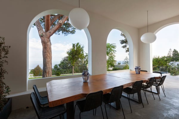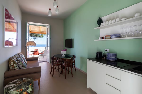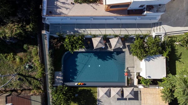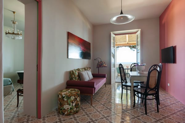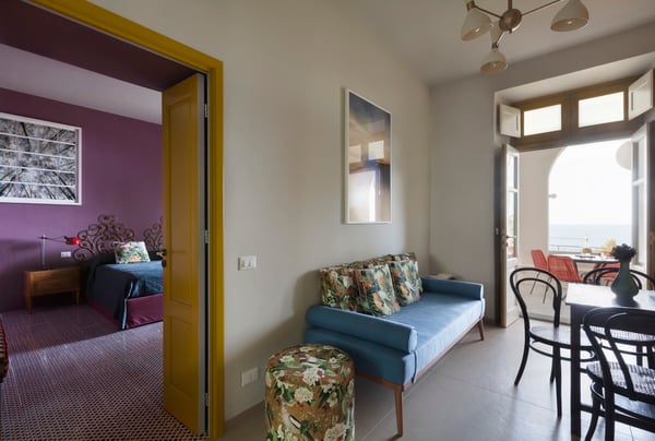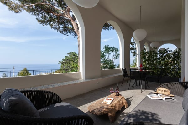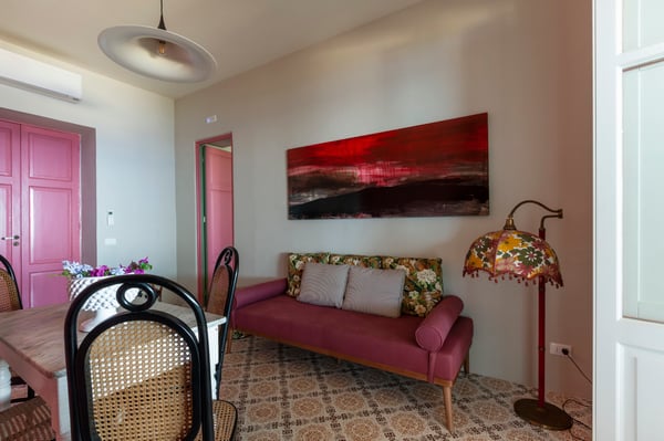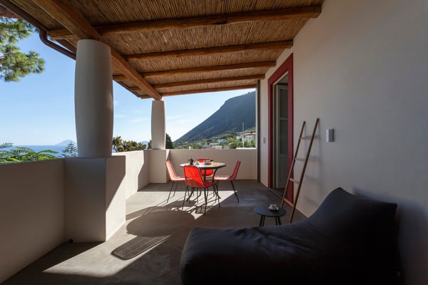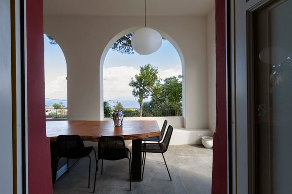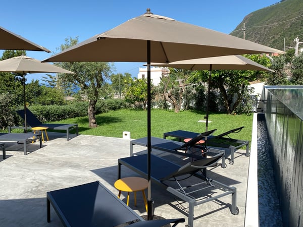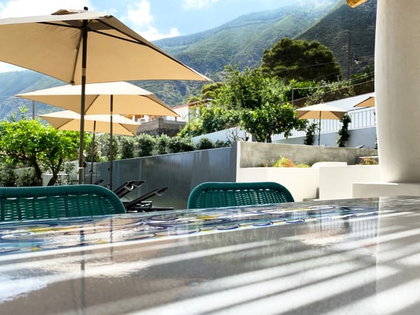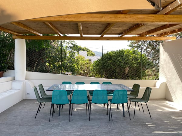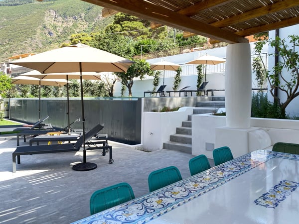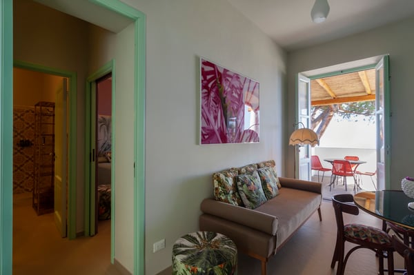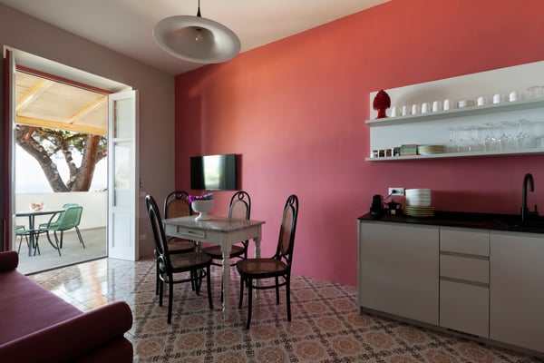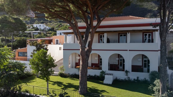 La Segreta has an important history: former barrack of Carabinieri, its architecture reflects past glories. But that’s not all: a local inhabitant told us that during some researches on Malfitan houses he came across a testimony that would see La Segreta also as a former convent of nuns. Whether it’s true or not, we like to think that La Segreta has witnessed many stories and we can’t wait to add yours. The villa (360 square meters) on two levels is divided into three private suites (Aria, Acqua and Terra) and a living area of 90 square meters. Aria and Acqua are on the upper floor, with direct access to the terrace and its superb sea view; Terra and the living area are on the lower floor, both with direct access to the Aeolian porch and the garden. Each suite (90 square meters) consists of two double bedrooms, two finely decorated bathrooms with shower, and a living room with a small kitchen equipped with dedicated kitchenware for light meals; the warm and welcoming living area consists of a main kitchen, a lounge, a dining room and a bathroom. Upstairs, Aria, with its pink and green shades, amazes with the sophisticated tub in the main bedroom, perfect for enjoying a relaxing bath, while Acqua offers new perspectives with its hand-crafted desk overlooking the island of Panarea. Both Aria and Acqua have direct access to a wide terrace, where you can sunbathe in total privacy, have a coffee sitting at the hand-painted lava stone tables, protected by the branches of a beautiful maritime pine, or enjoy a sea-view aperitivo at sunset. Downstairs, Terra, cozy and unusual, has a personality of its own; its two bedrooms, full of well-balanced contrasts induce a restoring but creative sleep. Terra has direct access to the porch and the garden. La Segreta is a hymn to open-air lifestyle. The Aeolian porch is the perfect choice for breakfast while enjoying the stunning view over the rooftops to the blue of the sky and the sea. It leads to the garden, where citrus plants and fragrant flowers frame the infinity pool, twelve meters long and six meters wide. The pool area is equipped with a pergola for alfresco dining. Perfectly integrated into the vegetation, two small buildings house the technical and laundry room. CIN: IT083043A182MXMT52
