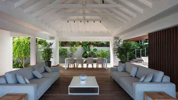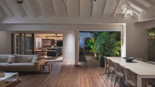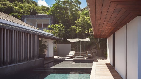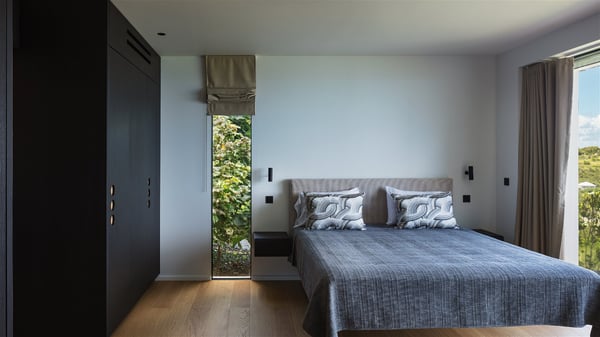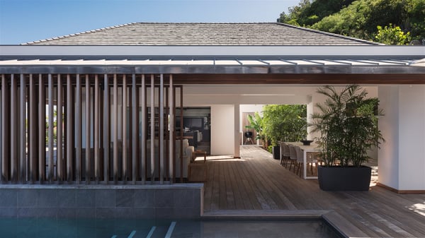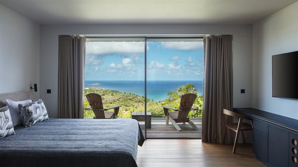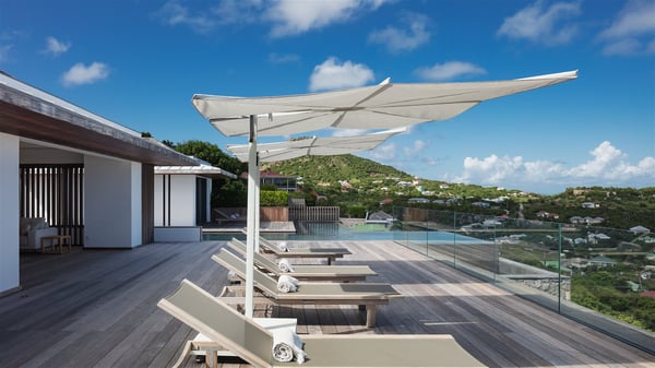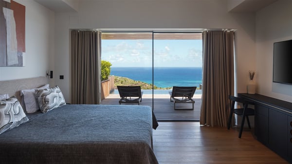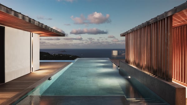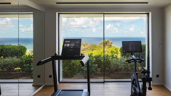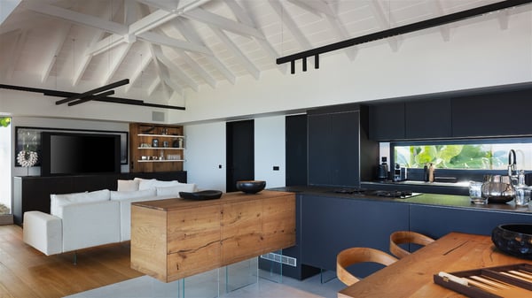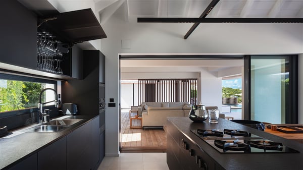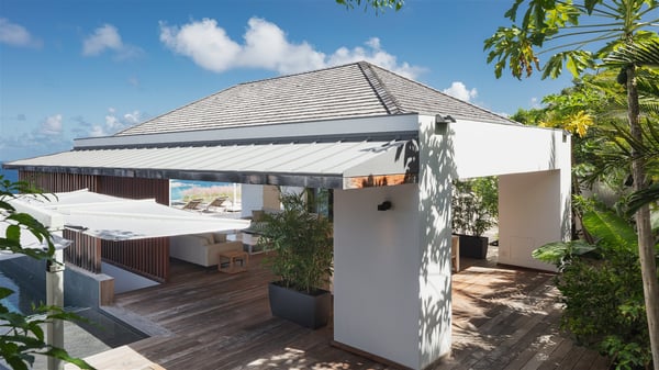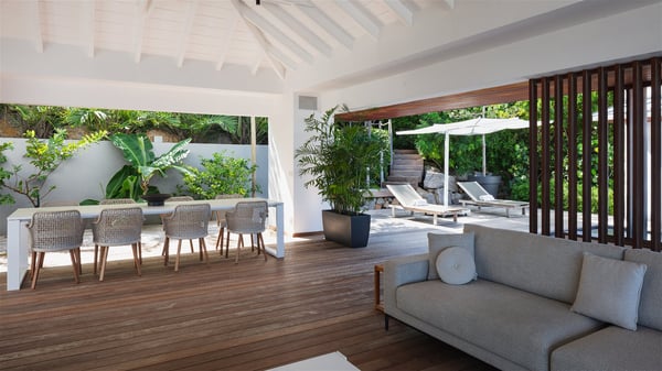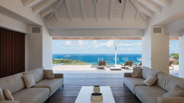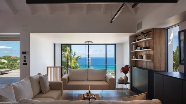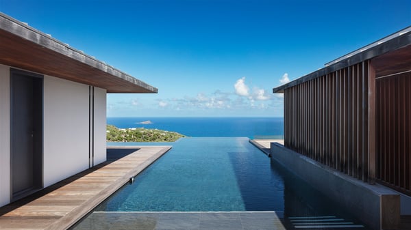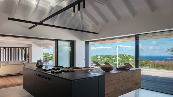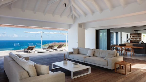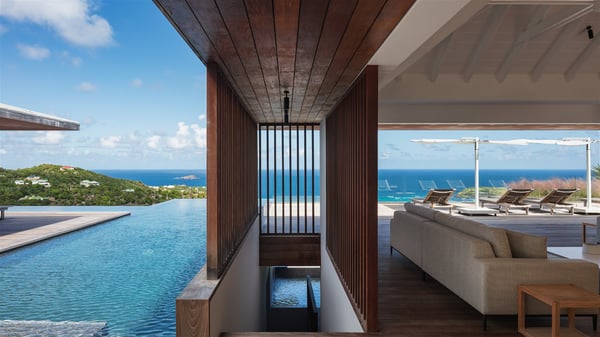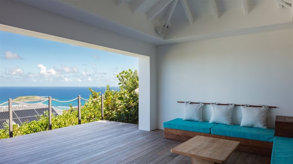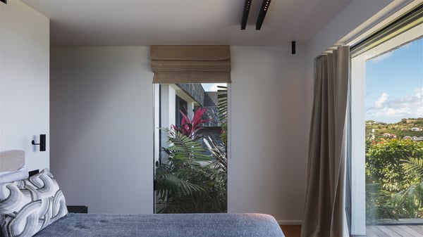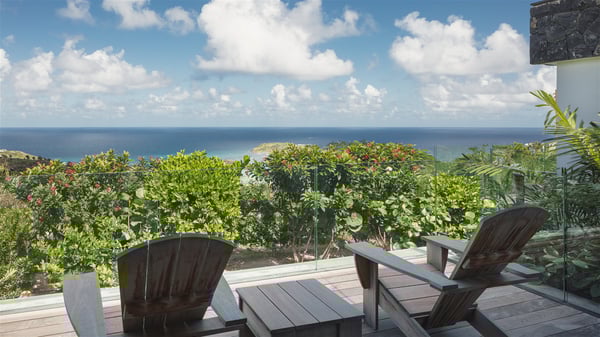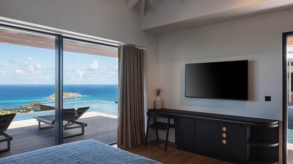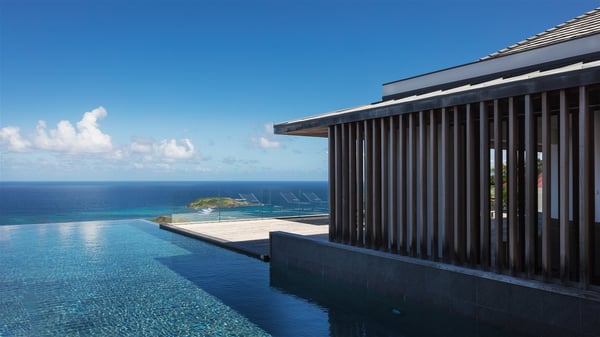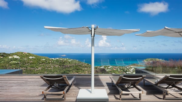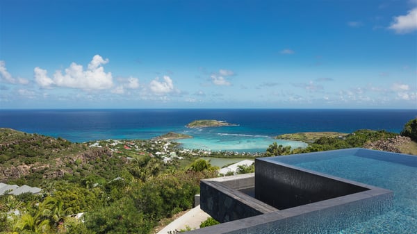 The holiday villa rental Aloha is a prestigious property located in Vitet facing an amazing ocean view. Modern in design and luxuriously equipped, this vacation home with an infinity heated pool and a fitness room offers upscale amenities in a refined setting. Between sea and sky, villa Aloha welcomes up to eight guests in its four bedrooms for a dream stay in St-Barths. A double-story villa, Aloha is an architectural gem set into the hillside. Its views over the ocean, Turtle Island and Grand-Cul-de-Sac lagoon are breathtakingly beautiful, and you’ll marvel at them from the bright living room furnished with a large, comfy sofa. The fully-equipped kitchen is located in the same space and can accommodate your private chef for any private event. You'll love dining al fresco under the covered terrace around the large dining table, close to the outdoor living room, also sheltered from the sun in the gentle trade winds. The whole setting is relaxing and quiet, for a unique and unforgettable stay with friends or family. Villa ALOHA’s terrace is located on the main level and offers breathtaking views over the sparkling ocean. Across the outdoor space, you’ll find the beautiful infinity heated pool, glistening in the Caribbean sunshine. You'll love relaxing in this idyllic scenery on the fine deckchairs under the shade of the parasols by the pool, sipping a cocktail in utmost quiet. An ajoupa is also available at the rear of the property in a very private atmosphere. In front of the spectacular view, you’ll experience delightful moments of contemplation in the majestic and exotic beauty of the Caribbean. Villa Aloha consists of four air-conditioned bedrooms with en-suite bathrooms. On the main level, the master bedroom opens onto the terrace with swimming pool and ocean views, in a refined decor and a quiet ambience. The other three bedrooms are located on the lower floor and also offer luxurious amenities. Sports lovers will appreciate the well-equipped fitness room also at your disposal during your stay on this lower level. Facing a spectacular view over the ocean and the lagoon of Grand-Cul-de-Sac, the vacation rental ALOHA is the ideal location for an unforgettable 8-people stay in St-Barths.