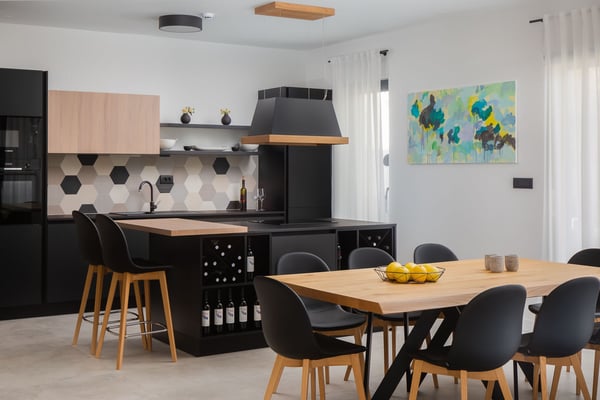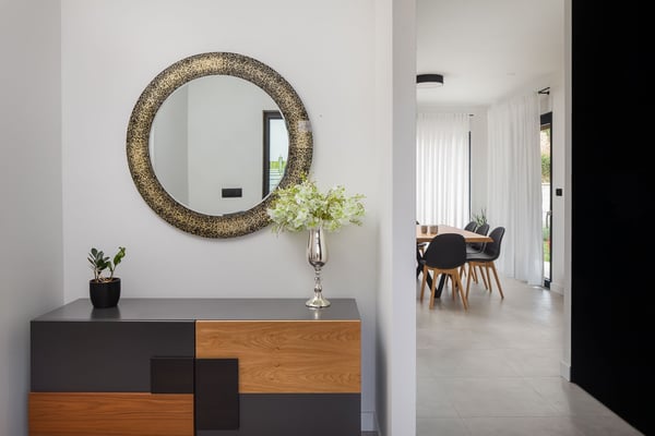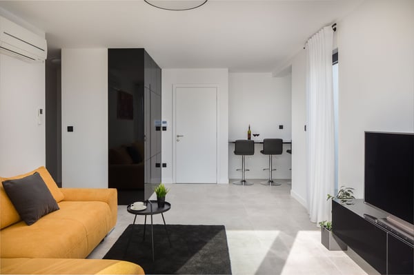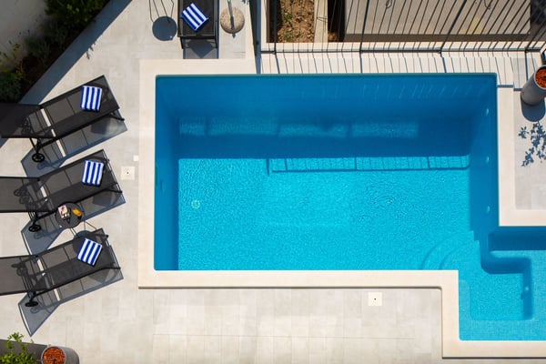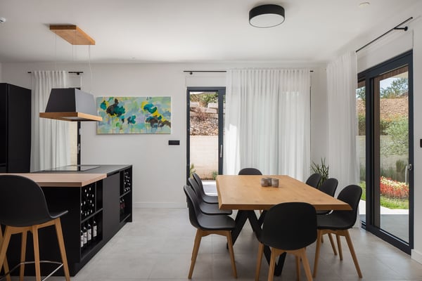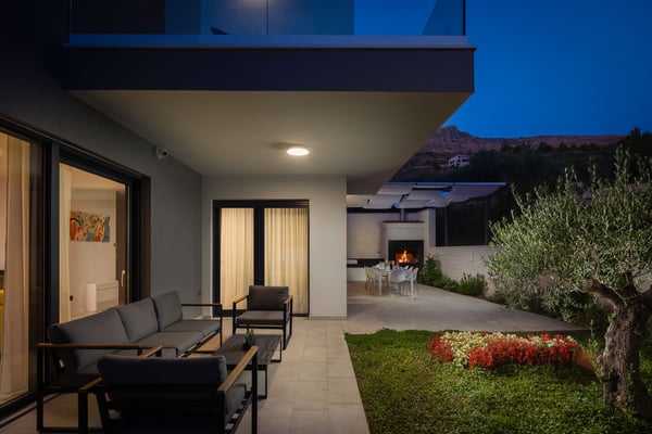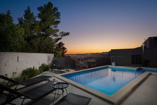 The magnificent Villa Marinero in Podstrana is a brand new holiday home perfect for ten guests in the vicinity of Split. Just a short drive to the center of Split and only a few minutes walking to the beach, this villa is an excellent starting point to explore the beautiful towns of Central Dalmatia and privately enjoy the Mediterranean surroundings in a contemporary estate. Villa Marinero Split spreads on 300 square meters of indoor space and 150 square meters of outdoor area and can accommodate ten guests. On three floors, there are five double en suite bedrooms, two kitchens, two spacious living areas with a flat-screen TV, a swimming pool with outdoor dining and barbecue, a sauna, and a Jacuzzi with a magnificent view on the top floor. Upon entrance, you will find private covered parking for the guests and a room with a sauna and shower on the ground floor. From here, you can go up to the first floor using the inner staircase or an elevator that goes to all floors, which is suitable for elderly or disabled guests. The first floor opens to a stylish, fully equipped kitchen in a lovely combination of black and wooden elements. A spacious living area with a large sofa, TV and expansive glass doors and windows directly views the pool terrace and the garden. You can exit to the deck with a beautiful pool and an alfresco dining space with a barbecue from this area. You can spend your days enjoying the traditional Dalmatian food or relaxing in the pool during the hot summer afternoons. Cozy sunbeds around the pool and an outdoor shower guarantee maximum comfort. This floor features one guest toilet. There are four trendy double bedrooms on the second floor with en suite bathrooms and TVs. Each room is air-conditioned. One of the bedrooms has a balcony with a lovely view of the olive trees behind the house. The most beautiful view is definitely from the top-floor terrace with a Jacuzzi. This floor features a fifth double bedroom with an en suite bathroom, a small elegant kitchen, and a living room exiting onto a wonderful terrace with a Jacuzzi. From here, you can enjoy complete privacy and the view of the glowing lights of the town and the sea in the evening. Villa Marinero Split will most definitely fill all your senses with magnetic energy and provide a relaxing vacation in a modern and luxurious environment just outside Diocletian's town of Split.