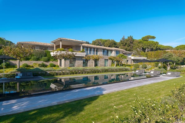 Nestled just a short stroll from St-Tropez, Villa Opale is near the stunning beaches of "Pampelonne," "des Salins," and "Canoubiers Bay. This sumptuous six-bedroom + three-staff bedroom villa, meticulously crafted by a renowned architect, boasts a harmonious blend of fine materials, high-quality wood, and expert dry masonry, and a beautifully landscaped garden, adorned with numerous olive trees. Upon entering the villa on the first floor, you'll encounter a fully furnished living room, complete with a 75"plasma screen and a functional fireplace. On one side, the dining room showcases a generous table for up to 18 Guests, and the well-equipped kitchen features a cold room and an additional table for six. On the opposite end, the opulent and luxurious master bedroom features a spacious dressing room and an exquisite bathroom. The entire floor opens up to a covered terrace, an alfresco dining area, and a summer lounge that overlooks the heated pool. The ground floor houses five VIP bedrooms (including one designed for children) and two utility rooms, all with their own bathrooms and restrooms. The ground floor also includes a private library, an extensive wine cellar, a secure garage for two cars, as well as bicycle and scooter storage (in addition to the 10 external parking spaces).