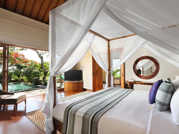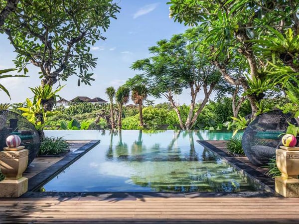 Built as a multi-generational family home, the villa has been lovingly crafted and designed by an award-winning Balinese architect to provide an oasis of calm. Shanti is the perfect name for this one-of-a-kind, seven-bedroom villa, set in the gentle hills of Nusa Dua in southernmost Bali, thirty minutes from the airport. It means peace in Sanskrit, which suits the serene hilltop sea view setting, and reflects the harmony between contemporary design and traditional heritage that is the hallmark of Popo Danes, its famed Balinese architect. You can now enjoy the experience of staying at this exclusive residence the next time you’re in Bali. At the villa’s social heart, you will find the showstopping, stately living pavilion. Dining under the ornate chandelier hanging from the soaring vaulted roof on a royal wooden table by Ibu Melati for fifteen makes every mealtime a special occasion. Add to that, the delicious food cooked by the private chef, and this may just become your favorite part of the villa. Oriental carpets spread on the living room’s polished black terrazzo floors lead onto a 16-metre infinity pool facing the ocean beyond the trees. This awe-inspiring sense of space continues in the seven large suites spread across three-bedroom pavilions flanking the main house, overlooking the sprawling grounds and the ocean beyond. Four-bedroom suites have their own private plunge pool and relaxation balé, making it the perfect choice for large groups who would like to gather together in the evening but will also appreciate their own personal space to retreat to. Your experience will be enriched by the welcoming villa staff who relish helping every guest make the most of their stay. The Shanti Residence is particularly suited for large family gatherings or reunions. It Is also a spectacular venue for special celebrations and weddings. Hard though it may be, to leave this alluring private residence, the gravitational pull of Bali’s most beautiful white beaches, and all the attractions of the Nusa Dua resort enclave a short drive away, may prove irresistible. You can reach one of Bali’s finest beaches, the white sand Geger Beach within minutes. Bali National Golf Resort is also nearby for a game of golf. The Elite Concierge can arrange a luxury car and driver on request (extra charge) for you to venture out. Wherever you may roam, however, you will always love coming back home to the spectacular Shanti Residence.