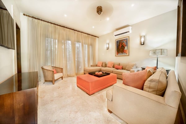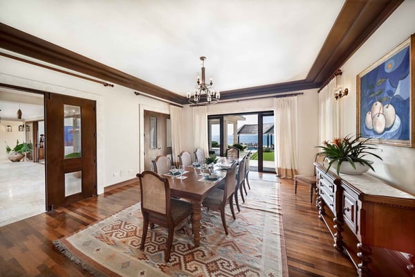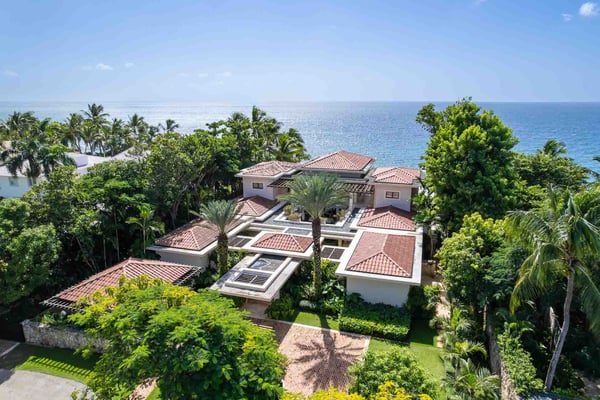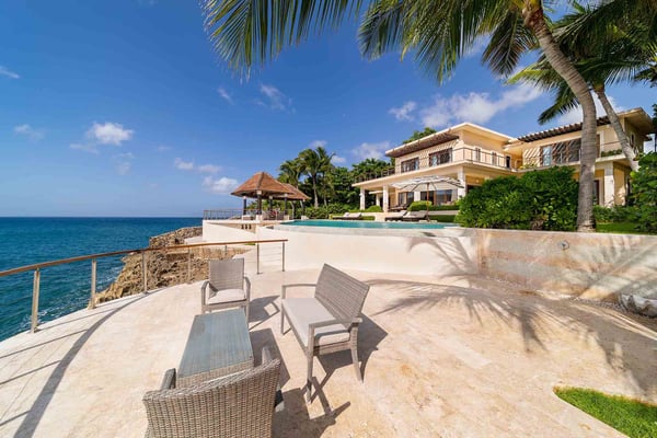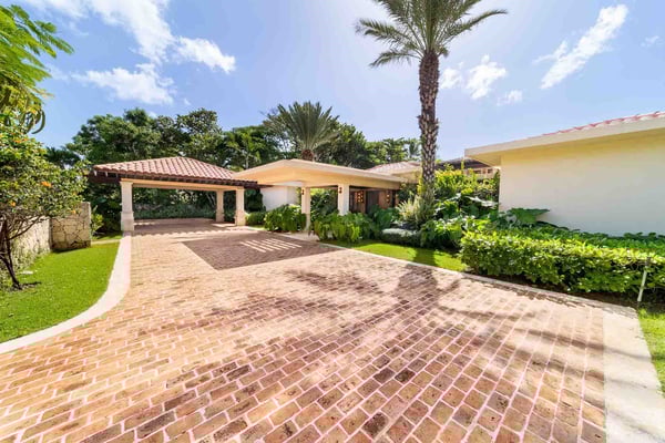 All guests must register with the Casa de Campo Concierge office, and for a small daily fee ($30 per adult per night & $15 per child per night), are granted access to resort areas and amenities. Casa de Campo Resort facilities and amenities include golf courses ($), the fitness centre ($), racquet center ($), restaurants ($) and bars ($). Contact Rental Escapes for more information about pricing. Nestled along the shores of the Caribbean Sea in Casa de Campo, this elegant oceanfront villa offers a serene escape with five bedrooms, a charming gazebo, and a refreshing swimming pool. The timeless design effortlessly blends indoor and outdoor spaces, allowing guests to immerse themselves in the beauty of the ocean views. The gazebo provides a perfect setting for alfresco dining, while the air-conditioned living and dining rooms inside offer a sophisticated retreat. The living spaces are thoughtfully designed to exude comfort and elegance, and the bedrooms promise a restful stay with stunning ocean panoramas. This villa is an exquisite combination of relaxation and luxury, ensuring an unforgettable experience in Casa de Campo.