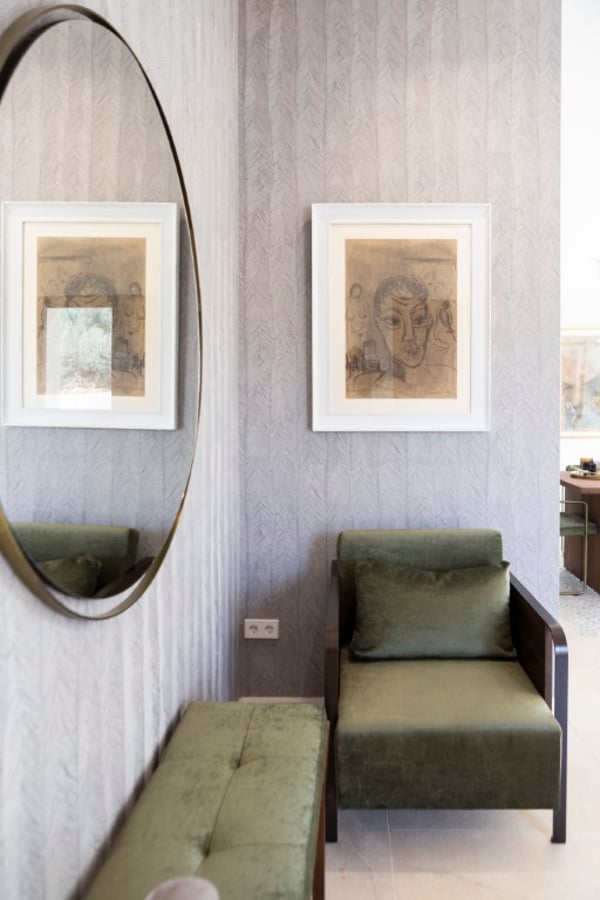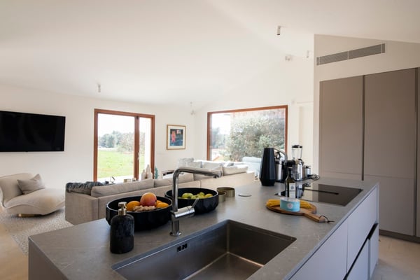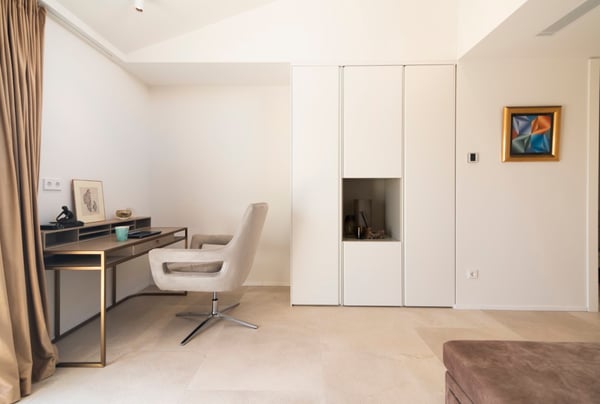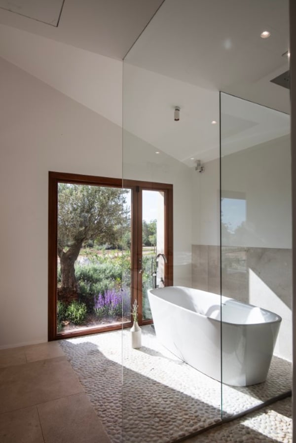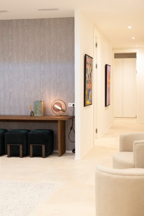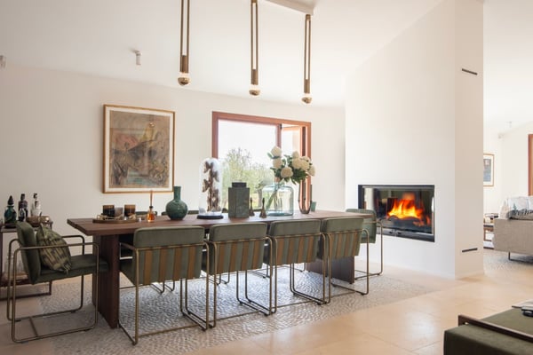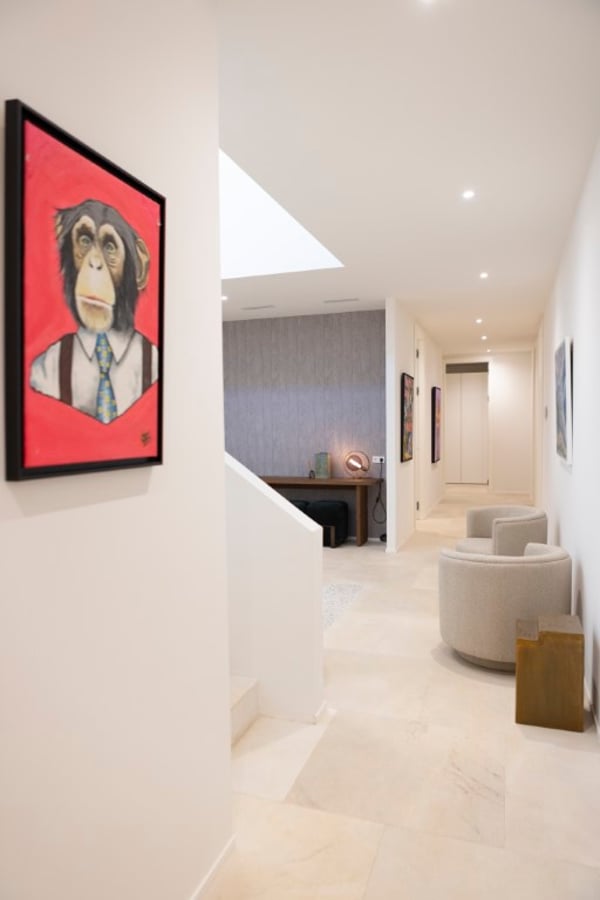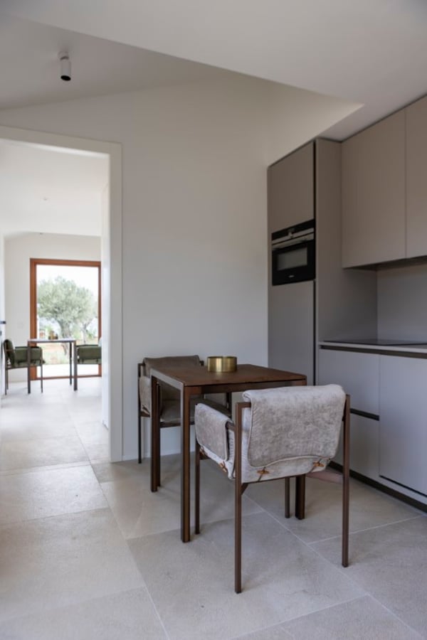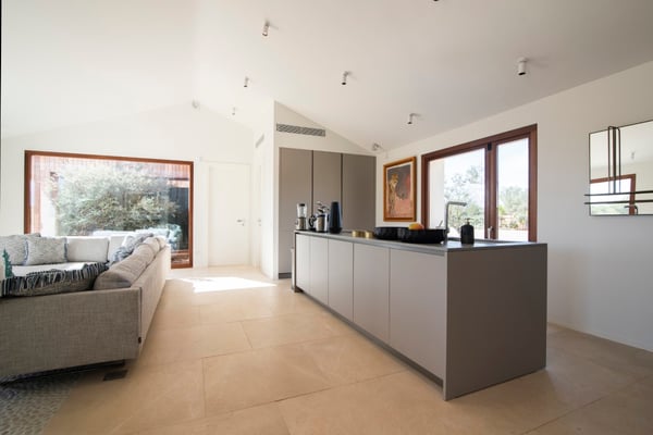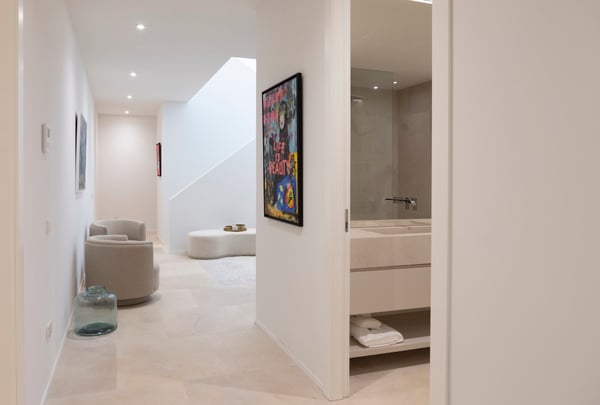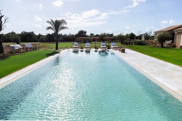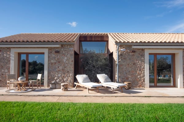 This stunning luxury 2-story modern villa is in a beautiful natural setting in the Southeast of Mallorca, a Mediterranean island that calls for wellness and relaxation with its turquoise blue waters, secret coves, golden sand beaches, beautiful green foliage, mountains, picturesque villages, and an entertaining capital city. The luxurious villa on a 5 hectares lot offers magnificent panoramic views of Sant Salvador while maintaining privacy and tranquility. Located close to picturesque historical villages in the center of Mallorca’s beautiful wine region, the villa totals a generous 950 m2. The high-class luxury villa with a total of 8-bedroom suites with ensuite bathrooms can host up to 16 people. The villa offers an atmosphere of exclusivity, and perfectly combines a modern style with a touch of typical Mallorcan countryside style. Elegant décor and deluxe amenities round up the special experience. Outside, set in a beautiful garden of 5 hectares, is a spacious heated infinity pool and a sun-filled terrace. The entry-level offers open-concept luxury with a bright dining and living area with a huge fireplace, that flows into a high-end kitchen. On the left side, there are three beautifully designed bedroom suites with ensuite bathrooms that feature direct outdoor terrace access. Tucked away from the living area on the right side, is the impressive and spacious master bedroom suite with an ensuite spa area, walk-in closet, and direct access to a private terrace. Three apartments are on the entry-level floor in a separate tract, each with a modern, fully equipped kitchen and a spacious bedroom suite with an ensuite bathroom. The lower floor boasts a lavish entertainment room, a creative workspace, a conference room, storage rooms with closets, a laundry room, and an additional spacious bedroom suite with a spacious bathroom. Huge stairways make for seamless movement between the two floors. Huge terraces surround the villa, beautiful patios, a secret cactus and olive garden area with a waterfall fountain, a BBQ fireplace, sitting benches and a water pond. The finca’s architecture blends indoors and outdoors to ensure openness and connection with nature while having privacy at the same time.