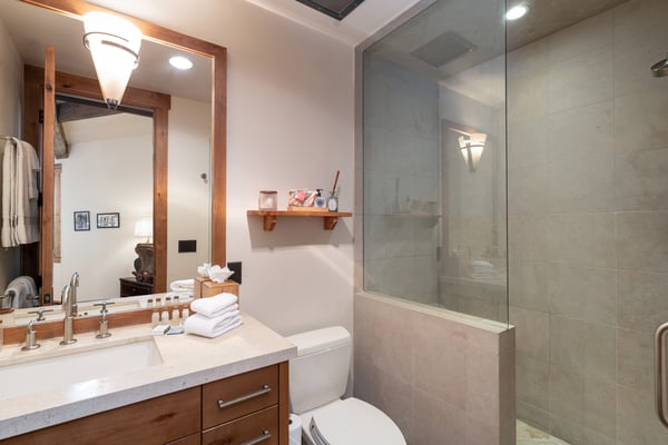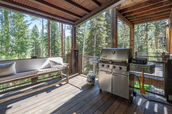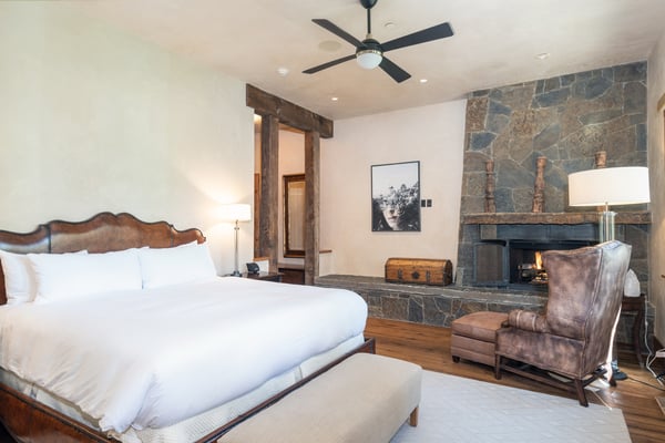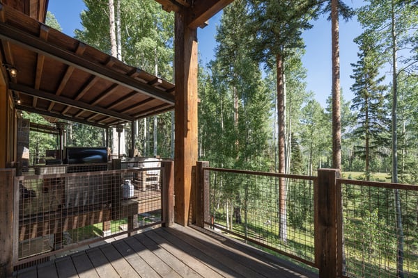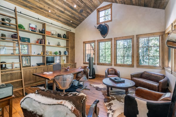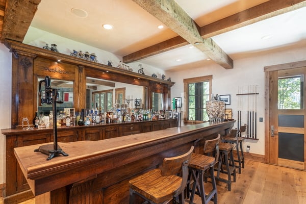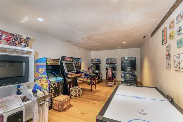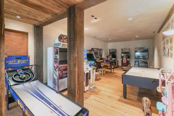 Rustic luxury reaches new heights at Robber’s Roost, an exquisite Mountain Village hideaway with five bedrooms, multiple living spaces, a gourmet kitchen, a full arcade, a billiards room, and a mother-in-law suite. Moments away from the bustling village core, the gondola, and downtown Telluride, this inviting ski chalet also places you steps away from some of the most popular ski runs in North America. All this, plus a private hot tub for warming up and winding down at the end of each day. Welcome to Robber’s Roost! With an eye-catching wood plank and stone facade, your mountain getaway begins the moment you arrive at the heated garage parking. Once inside, the main level great room certainly lives up to its name, with soaring vaulted ceilings, exposed wood beams, and sparkling floor-to-ceiling windows framing the soothing forest views. In the center of the room is a huge stone fireplace that adds warmth and welcome to the cavernous space, as well as plush sofas and armchairs for relaxing around the flames. Through the fireplace, you can see the formal dining room with seating for sixteen that leads into the chef-designed kitchen. In the center of the kitchen is a restaurant-worthy Thermadore gas range that’s surrounded by lots of options for sitting and socializing, including at the island bar, at the eat-in breakfast nook, or in front of the fireplace. There’s also lots more alfresco seating through the sliding glass doors out on the covered patio. In the primary bedroom suite, there’s a lush king-size bed, two leather side chairs, a stone-front fireplace, and a large HDTV, all sitting underneath a gorgeous exposed wood beam vaulted ceiling. In the ensuite primary bathroom, your private spa awaits, complete with a soaking tub, gigantic, glass-enclosed, step-in shower, and a double vanity sink. Four additional bedroom suites include king-size and queen-size beds, private balconies, HDTVs, and attached private bathrooms. The final bedroom suite is a bunk room, which includes a flexible layout of a twin-over-twin-size bunk bed and a full-over-full-size bunk bed, as well as an ensuite full bathroom with a step-in shower. Additional living spaces at Robber’s Roost include a popular game room, complete with multiple arcade games, an air hockey table, a pub-like bar, and a full-size pool table. There’s also an office/library space for when you need to get a little work done, and a completely separate mother-in-law unit with a living area and a kitchen, for those in your group who need a bit more personal space. At the end of the day, you may all wind up kicking back in the incredibly relaxing hot tub while you relive your day full of mountain adventures. The location of Robber’s Roost is close to perfect, placing you far enough away from the crowds so you can enjoy the soothing sounds of the wind whistling through the trees, yet close enough that you can take full advantage of the world-class ski slopes and the endless dining and shopping options in town. TMV BL# 011242