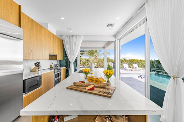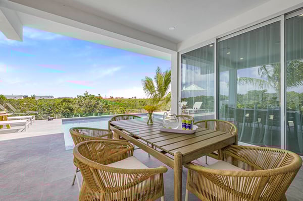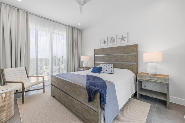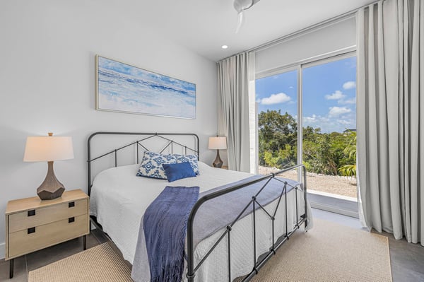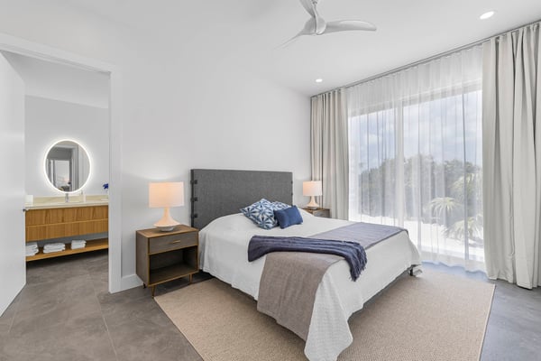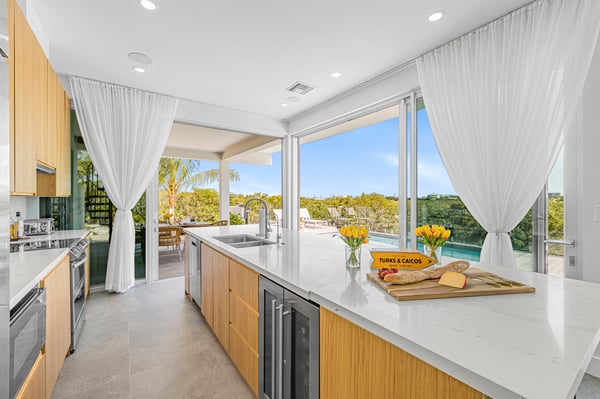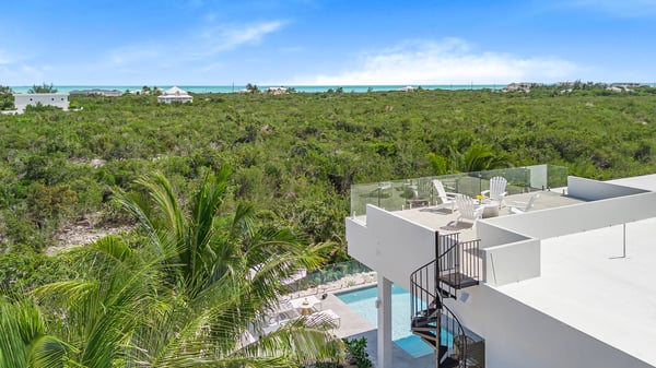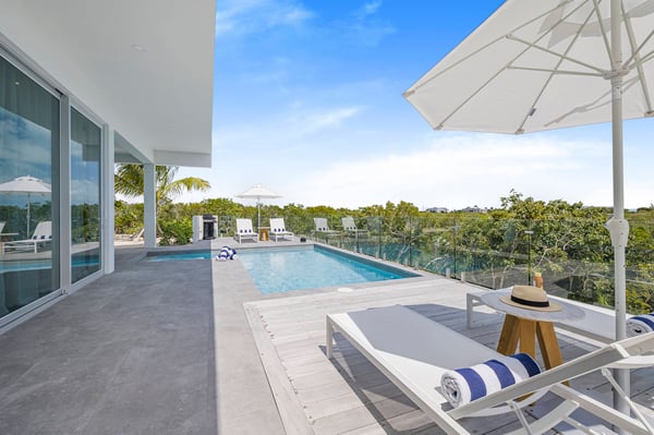 Caicos Breeze Villa is situated in the quiet Karaya Blue community in the Long Bay area, one street back from the ocean. This three-bedroom, three-bathroom villa is newly built, modern in design, and professionally appointed to make your visit to the island memorable. It’s perfect for a small group of friends, kiteboarders, and those looking to get away and explore life on the island. The kitchen is well-appointed with a large GE refrigerator and dishwasher, a Samsung induction cooktop, a Cavavin bar fridge, a Weber BBQ, and many additional tools to help your meal and beverage prep be a breeze. The living areas and patio are equipped with a Sonos system for an indoor/outdoor immersive music environment. Each bedroom has a king-size bed and a full complement of high-quality linens, and every washroom is equipped with double sinks and indoor/outdoor showers. The “Glass House” design embraces the indoor-outdoor use of space with a private pool just steps away. Enjoy a coffee early in the morning and catch the sunrise on the rooftop patio, where there is an ocean view. The villa includes all amenities for a perfect day at the beach, including beach chairs, an umbrella, towels, a Bluetooth speaker and a cooler for your use. You can use the beach path next to the villa, or drive to one of the many public accesses on the island (all the beaches in Providenciales are public). At night, experience the designated ‘Dark Sky’ environment and do some stargazing when the sun goes down, or enjoy some TV on the 75” flat screen television. For peace of mind, the villa is equipped with gated access, a security system that is monitored, cameras that monitor access points (not the pool or living areas for your privacy), and a small wall safe to store passports and valuables. For any kiters looking to stay close to the action, the villa also has a garage for gear storage.