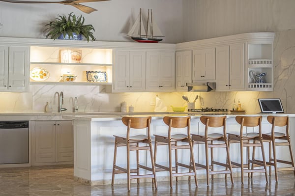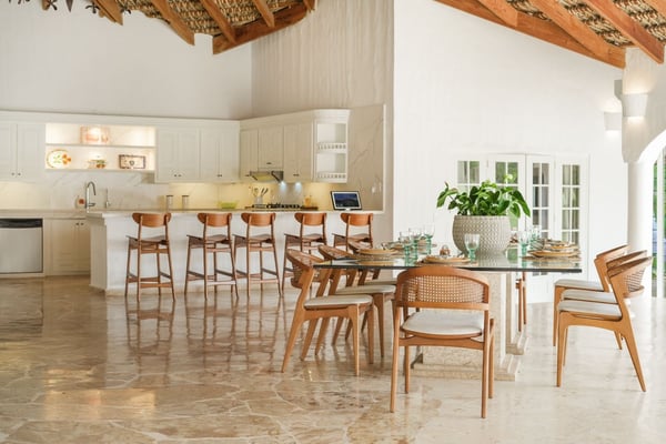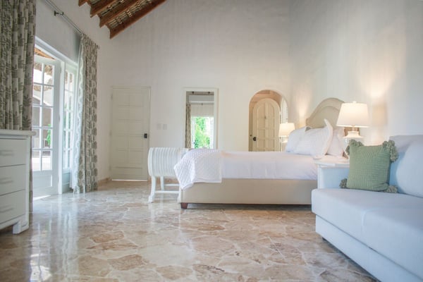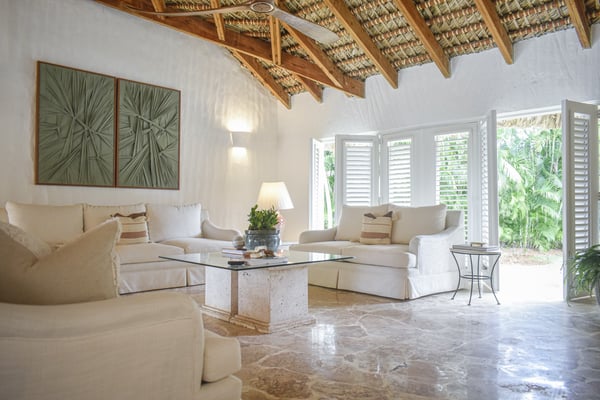 All guests must register with the Casa de Campo Concierge office, and for a small daily fee ($30 per adult per night & $15 per child per night), are granted access to resort areas and amenities. Casa de Campo Resort facilities and amenities include golf courses ($), the fitness centre ($), racquet center ($), restaurants ($) and bars ($). Contact Rental Escapes for more information about pricing. This beautifully remodeled villa is perfectly located just steps from Minitas Beach, Casa de Campo Resort’s exclusive private beach. Designed with tropical elegance in mind, the villa features spacious open living areas with cane roofs that allow natural light to flood the interiors, creating a warm and inviting ambiance. The layout seamlessly connects the central pool area with the indoor and outdoor spaces, offering a true Caribbean living experience. The open-concept living area includes a modern kitchen and an elegant dining room, ideal for family gatherings and entertaining. The villa is thoughtfully divided into two independent wings, each with two beautifully designed bedrooms, providing privacy and comfort for all guests. Outside, a charming gazebo overlooks the villa’s expansive back garden, which blends harmoniously with the lush green landscape of the golf course. This outdoor oasis is perfect for alfresco dining, relaxing, or simply soaking in the tranquil surroundings.