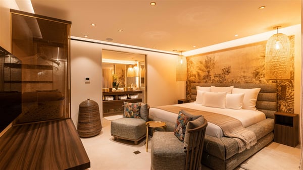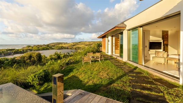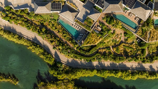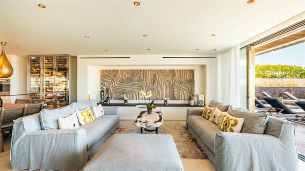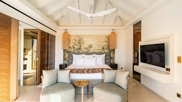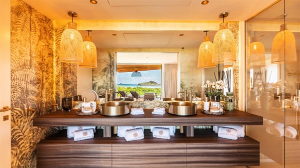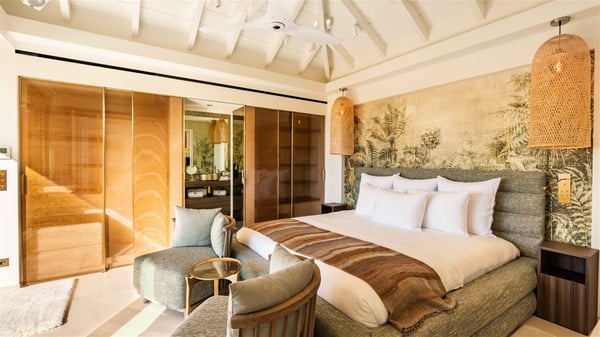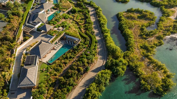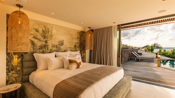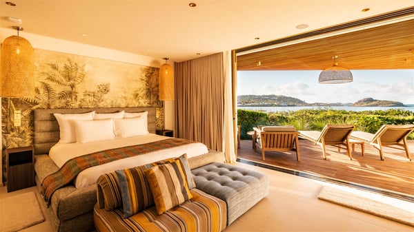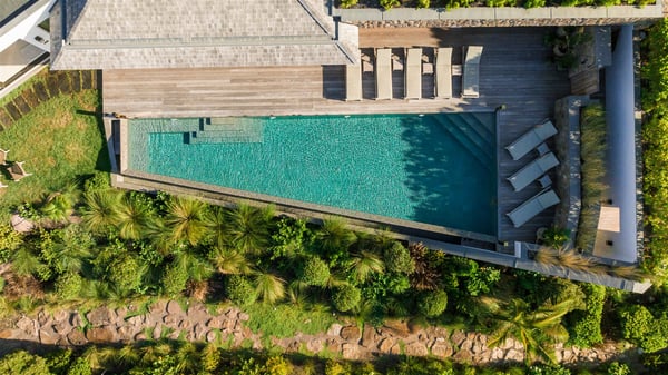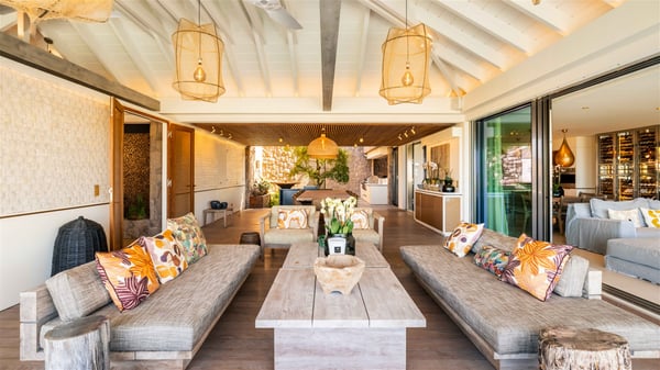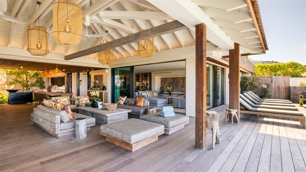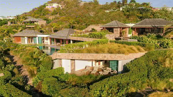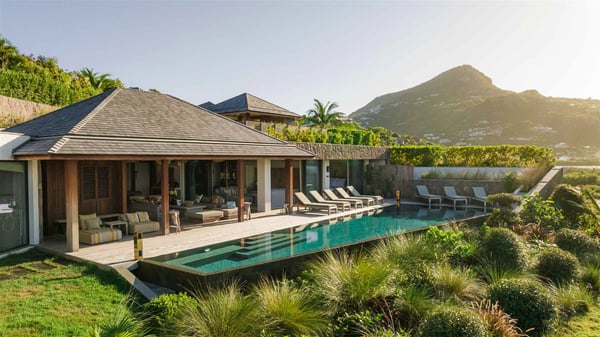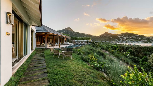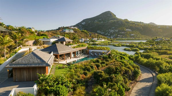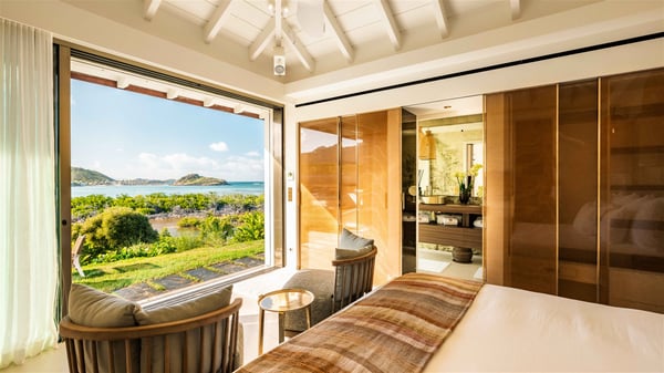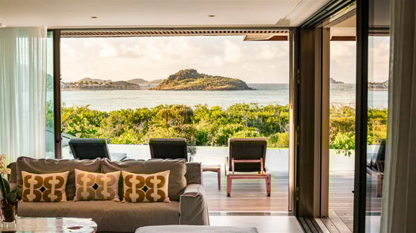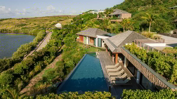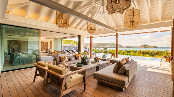 Lazuli is a luxurious four-bedroom vacation rental with a heated swimming pool, ideally located facing the Grand-Cul-de-Sac lagoon. Boasting an exceptional location, this spacious and bright holiday rental welcomes up to eight guests in a stunning setting for a unique stay in St-Barths. Built over several levels, villa Lazuli offers a majestic view of the crystal-clear waters of the lagoon and the infinite ocean. The large, air-conditioned living room lets the delightful light come in, creating a cozy indoor space perfect for relaxation sessions. There are sofas, armchairs, and coffee tables in the comfortable lounge, from which you can admire the view through the bay window. Close to it, you’ll find the fully-equipped kitchen with a dining area for eight, adjacent to the wine cellar. The dining room welcomes guests into a long space open at the front onto a second lounge with greige hints and raw wood under a perfectly designed framework, and at the back onto a lovely patio with charming vegetation and a barbecue. The pure, elegant, and soothing atmosphere provides a delightful feeling of calm and luxury for a highly privileged stay in St-Barths. At the front, the terrace of Villa Lazuli opens onto the crystal-clear lagoon of Grand-Cul-de-Sac and the property's lush vegetation. On the wooden deck, the long, 16-meter-long heated swimming pool with steps glistens under the Caribbean sun, the best place to enjoy delightful moments of relaxation admiring the stunning view. There are sun loungers near the pool, along with a few driftwood tables, making it the perfect place to sip a cocktail in a very private atmosphere. On the side of the pool, a few stones set in the grass lead to a charming area furnished with a coffee table and four armchairs for private conversations in a paradisiacal setting. The vacation rental villa Lazuliconsists consists of four air-conditioned bedrooms with en-suite bathrooms and dream lagoon views. Two of them are on one side of the lounge, the third is on the other side, and the fourth one is on a lower level accessible via a staircase, with a private terrace furnished with sun loungers. The decor is elegant, with wicker and fine pictures of colourful birds amidst the vegetation. Facing a breathtakingly beautiful view, villa Lazuli is a fantastic 8-person vacation rental with upscale amenities in utmost calm and luxury for an unforgettable stay in St-Barths.