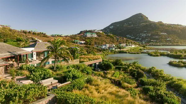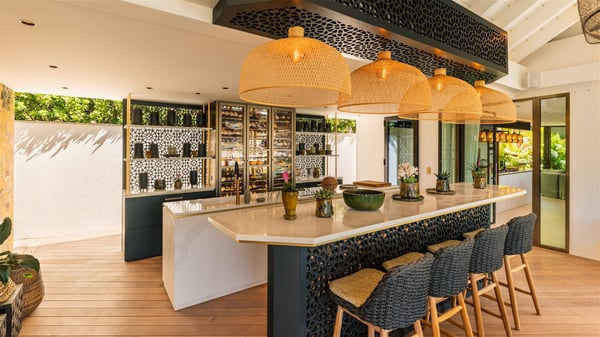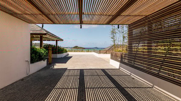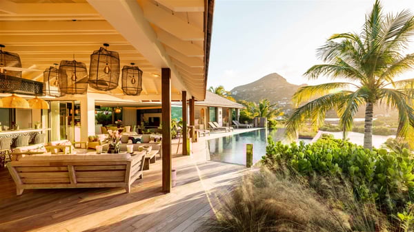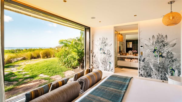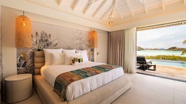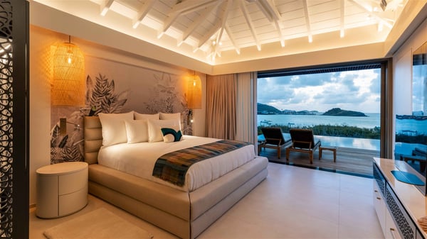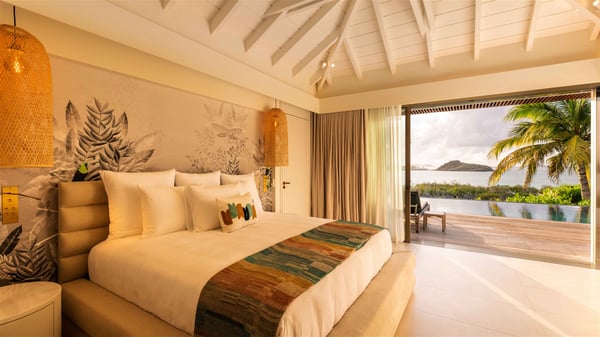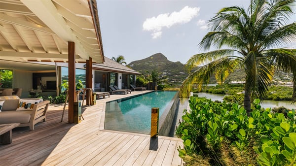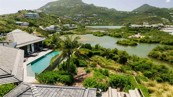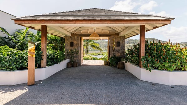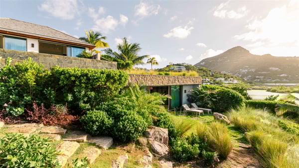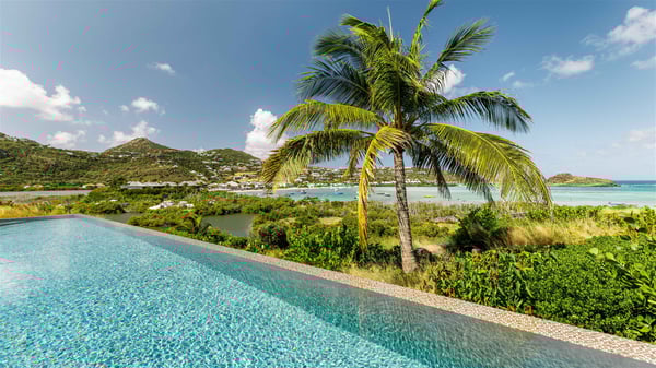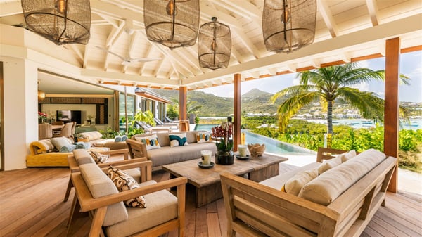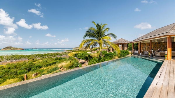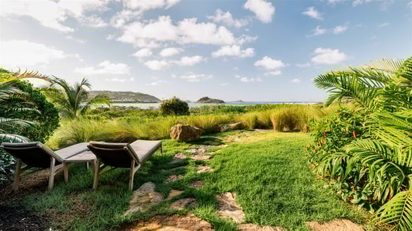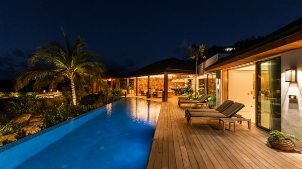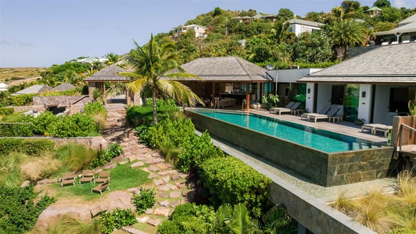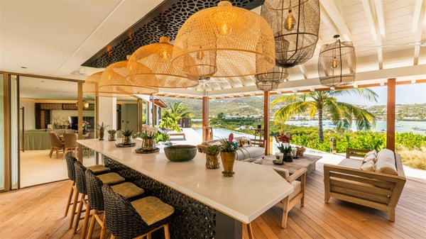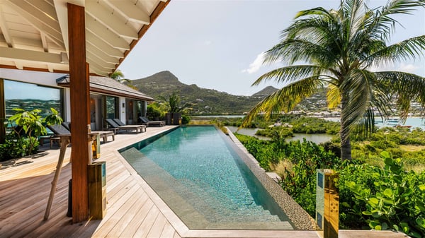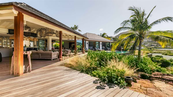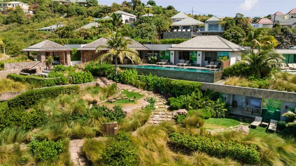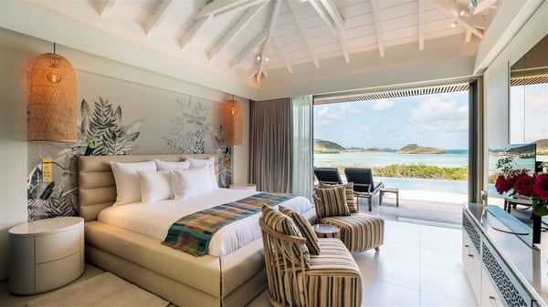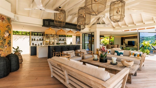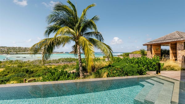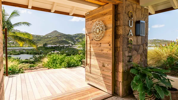 Villa Quartz is a sumptuous vacation rental in St-Barths, offering a breathtaking view over Grand-Cul-de-Sac. Spacious and bright, this three-bedroom property with a heated pool offers upscale amenities in a peaceful and paradisiacal environment. Overlooking the crystal-clear reflections of the lagoon, Quartz welcomes you for a fantastic six-people stay in St-Barths. Designed over multiple levels, villa Quartz offers large, airy spaces in a luxurious setting. The fully air-conditioned living room features a lounge area with an HD TV, soft benches, and a comfortable sofa covered with cushions, opening both onto the terrace with a swimming pool and at the back onto a charming, vegetal space. The dining room with a round table accommodates eight guests in a cozy decor, near the well-equipped kitchen with golden lights and forged pieces that bring a soothing ambiance to the whole. Next to this space, under a well-designed framework, the second lounge opens onto the terrace, where you’ll find a second kitchen with a wine cellar and bar with stools, decorated with captivating wrought-iron works. At the front of the holiday rental Quartz, the terrace welcomes guests around its 16-meter-long heated infinity swimming pool in a paradisiacal atmosphere. Sheltered under the eaves of the building, there are comfy sun loungers lining the pool and providing delightful spots for pleasant sunbathing or conversation sessions facing the stunningly beautiful view. You’ll also love sipping a cocktail marveling at the incredible beauty of the Caribbean. A few steps in the property's lawn lead to a charming area out of sight, in a quiet atmosphere and wild environment, amidst the amazing beauty of St-Barths. Villa Quartz has three air-conditioned bedrooms with king-size beds, HD televisions, and en-suite bathrooms. Two of them are near the living/dining area, and the third, with direct access to the garden, is on the lower level accessible via a lovely path through the property. The charming presence of wrought iron as well as botanical and animal prints create a delightful sensation of exoticism and refined luxury throughout the villa. In the heart of a beautiful, serene environment, the vacation rental in St-Barths Quartz is the perfect place for an ideal stay for six people in St-Barths.