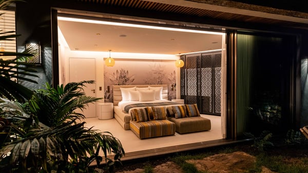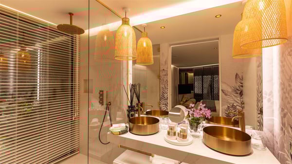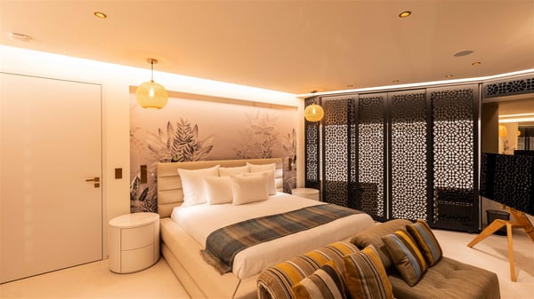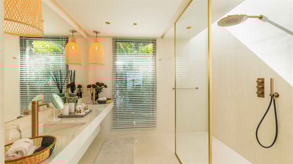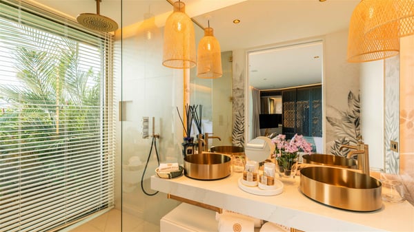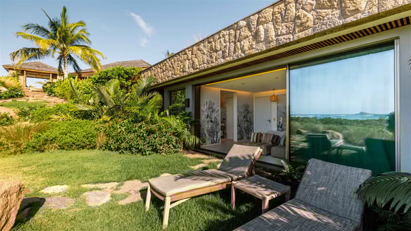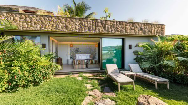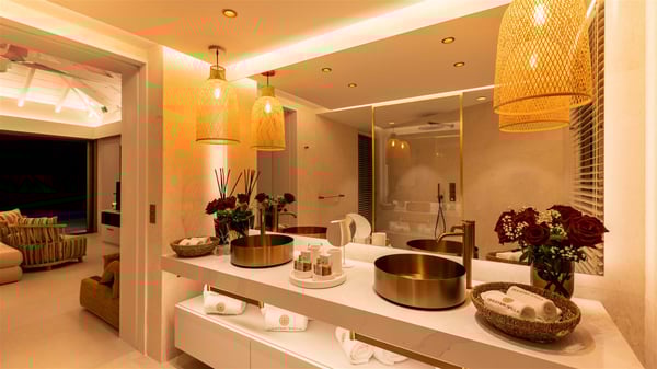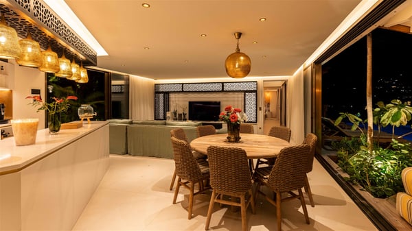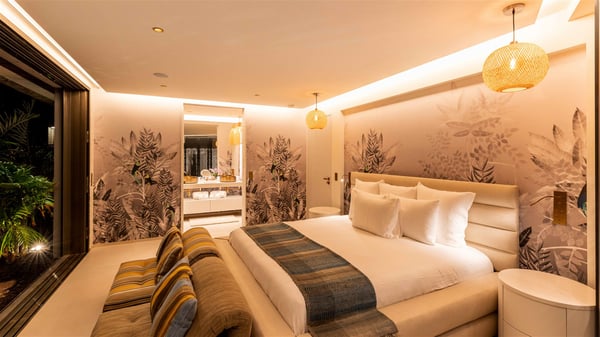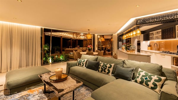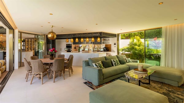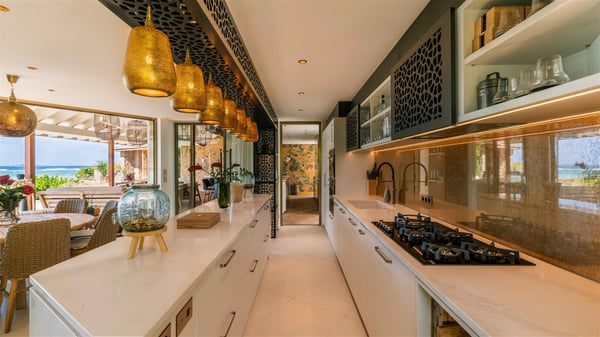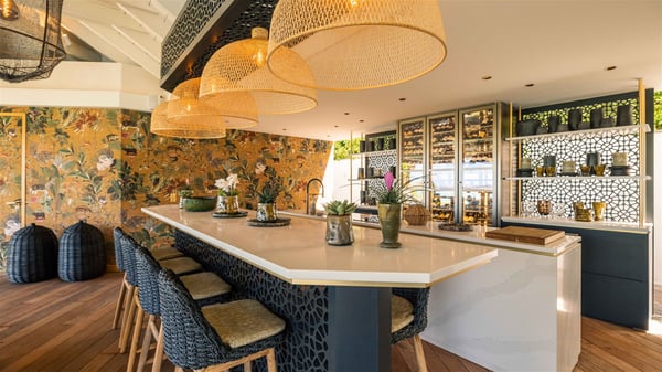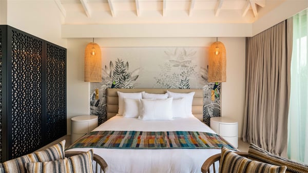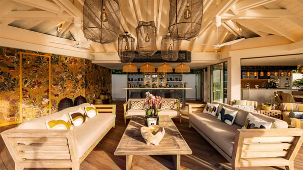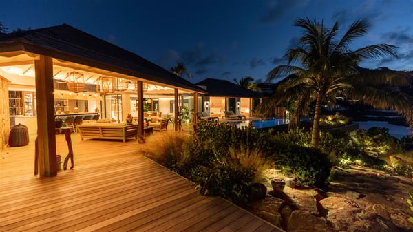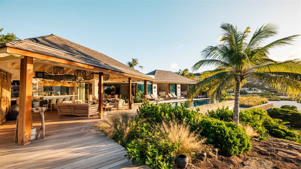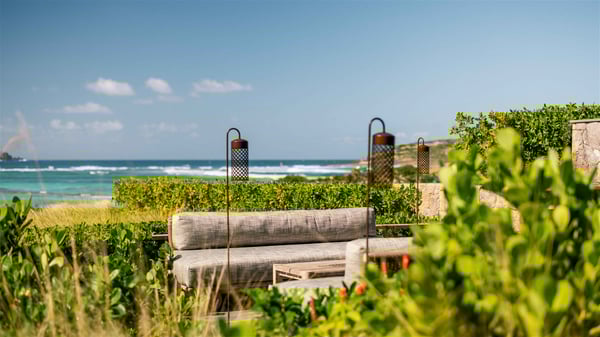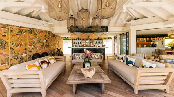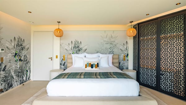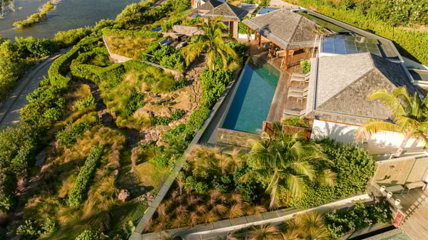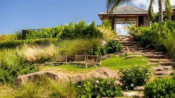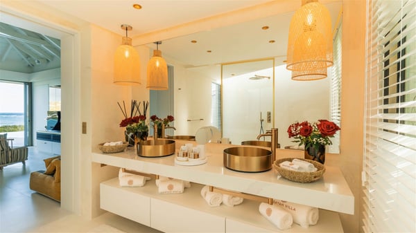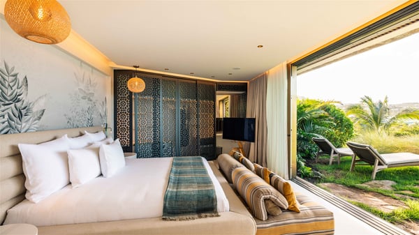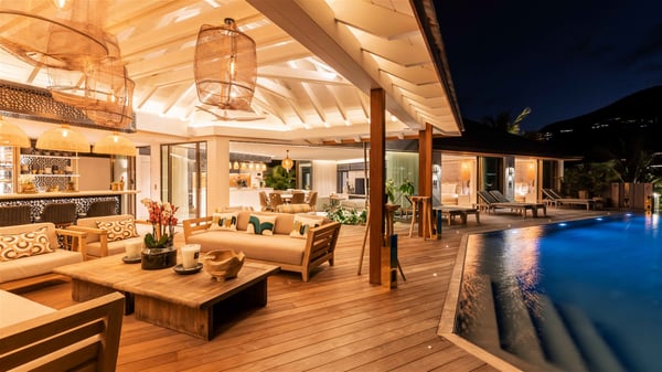Villa Quartz is a sumptuous vacation rental in St-Barths, offering a breathtaking view over Grand-Cul-de-Sac. Spacious and bright, this three-bedroom property with a heated pool offers upscale amenities in a peaceful and paradisiacal environment. Overlooking the crystal-clear reflections of the lagoon, Quartz welcomes you for a fantastic six-people stay in St-Barths. Designed over multiple levels, villa Quartz offers large, airy spaces in a luxurious setting. The fully air-conditioned living room features a lounge area with an HD TV, soft benches, and a comfortable sofa covered with cushions, opening both onto the terrace with a swimming pool and at the back onto a charming, vegetal space. The dining room with a round table accommodates eight guests in a cozy decor, near the well-equipped kitchen with golden lights and forged pieces that bring a soothing ambiance to the whole. Next to this space, under a well-designed framework, the second lounge opens onto the terrace, where you’ll find a second kitchen with a wine cellar and bar with stools, decorated with captivating wrought-iron works. At the front of the holiday rental Quartz, the terrace welcomes guests around its 16-meter-long heated infinity swimming pool in a paradisiacal atmosphere. Sheltered under the eaves of the building, there are comfy sun loungers lining the pool and providing delightful spots for pleasant sunbathing or conversation sessions facing the stunningly beautiful view. You’ll also love sipping a cocktail marveling at the incredible beauty of the Caribbean. A few steps in the property's lawn lead to a charming area out of sight, in a quiet atmosphere and wild environment, amidst the amazing beauty of St-Barths. Villa Quartz has three air-conditioned bedrooms with king-size beds, HD televisions, and en-suite bathrooms. Two of them are near the living/dining area, and the third, with direct access to the garden, is on the lower level accessible via a lovely path through the property. The charming presence of wrought iron as well as botanical and animal prints create a delightful sensation of exoticism and refined luxury throughout the villa. In the heart of a beautiful, serene environment, the vacation rental in St-Barths Quartz is the perfect place for an ideal stay for six people in St-Barths.