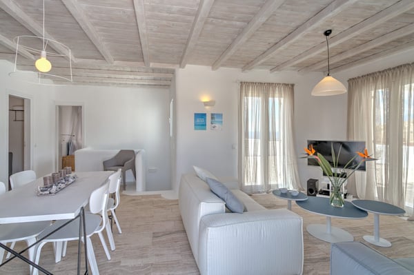 Mykonos Town (Chora): 10km Mykonos Airport (JMK): 11 km Ano Mera: 2km Psarou Beach: 6 km Super Paradise Beach: 7km northwest of Elia Beach.