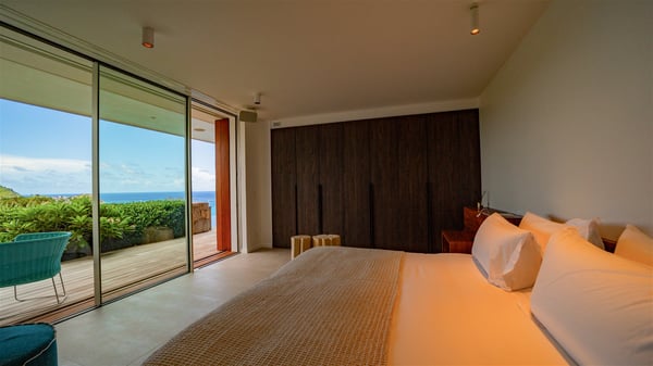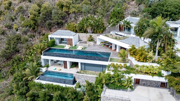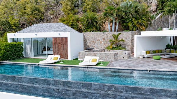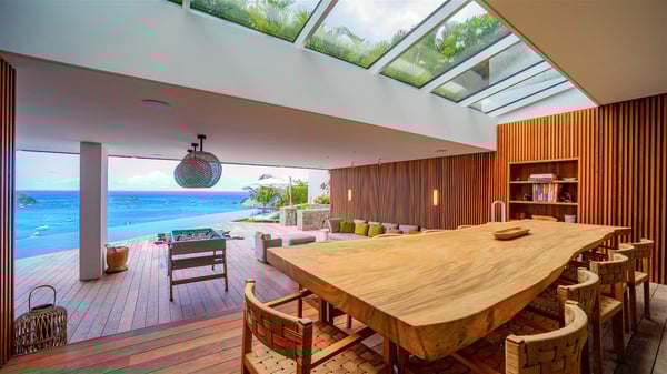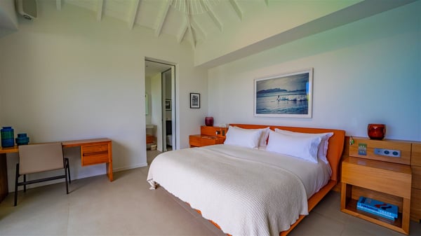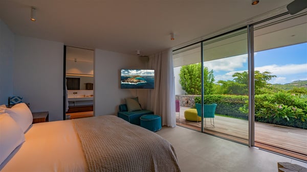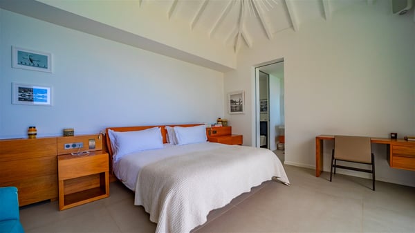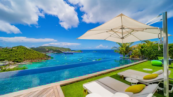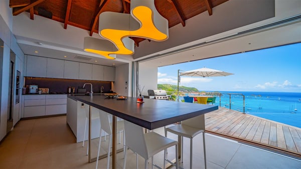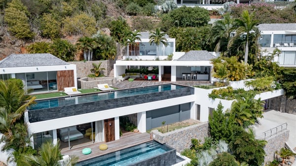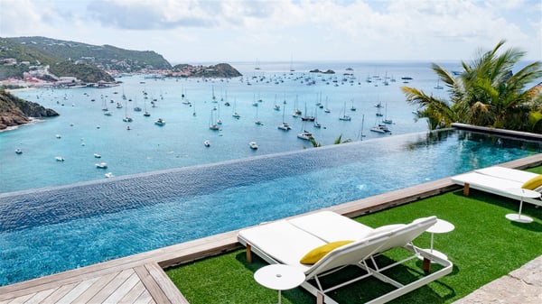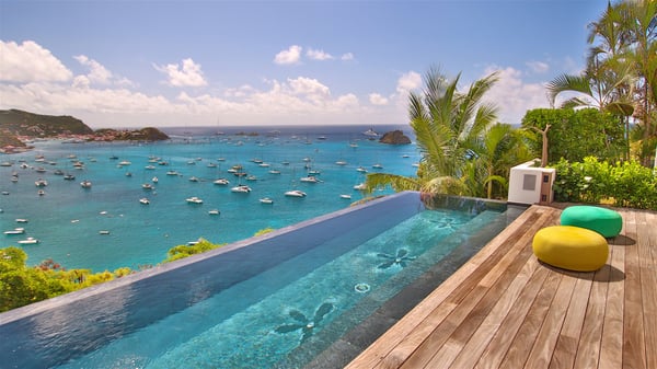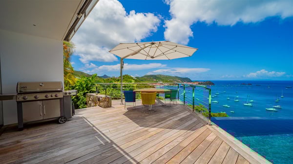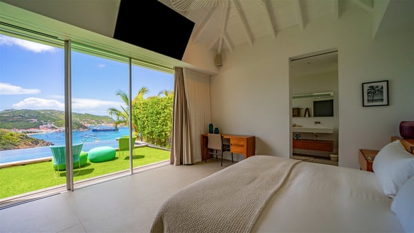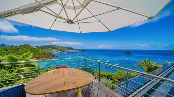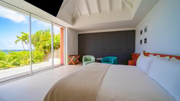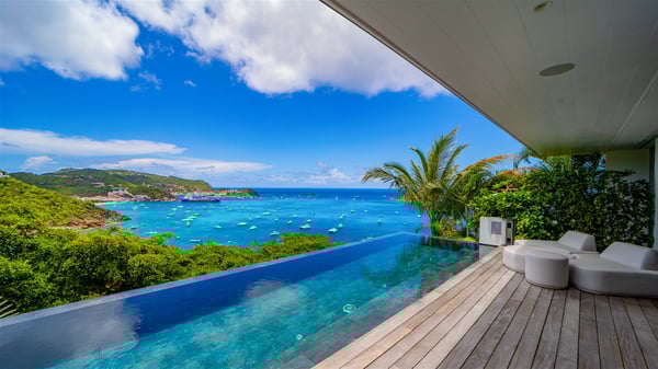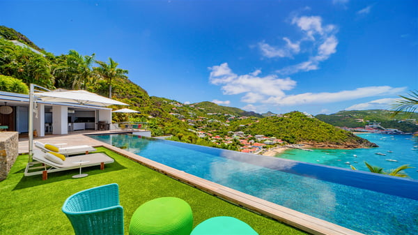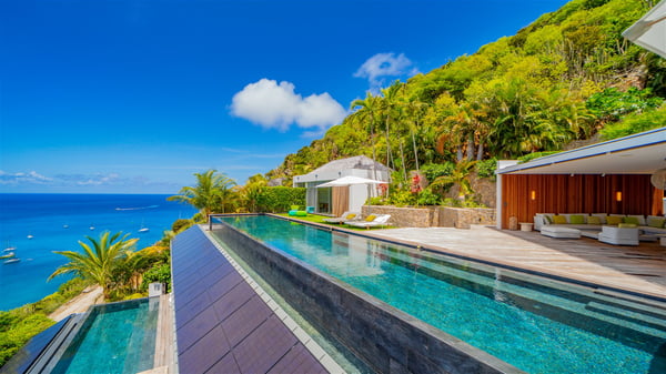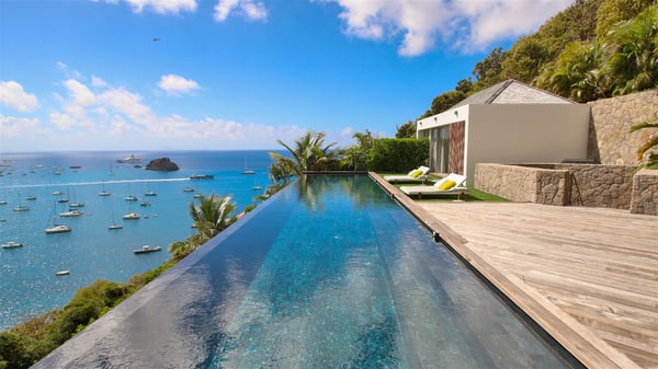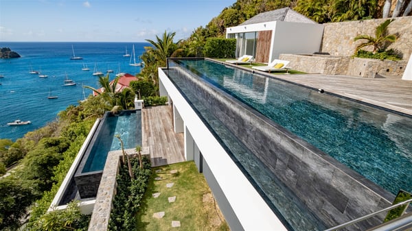 The villa rental Infra is a magnificent four-bedroom property located in Corossol, offering a breathtaking ocean view. With its two swimming pools and bright spaces amidst a lush environment, Infra is the perfect place for a unique stay for eight people in St-Barths. Designed over three levels on the cliffside, villa Infra overlooks the charming harbour of Corossol with its boats sailing on the sparkling waters. Its wide living area is divided into several comfortable zones, including a luxurious lounge with sofas and benches facing the stunning ocean view and the glorious sunset, a dining room with a raw-wood table for twelve guests, and a fully equipped kitchen with a dining area. The living room opens onto the main terrace with a swimming pool and a perfect horizon view, creating a paradisiacal atmosphere and a very private ambiance. A second lounge is located at the back, featuring comfortable sofas and a large HD screen for delightful movie nights. In the Caribbean beauty swept by the gentle trade winds, villa Infra is an ode to relaxation in the most luxurious setting. At the front, the terrace of Villa Infra offers a spectacular panoramic view. On the main level, the large heated swimming pool is equipped with comfortable loungers for pleasant sunbathing sessions. At the end of the terrace near the outdoor barbecue, you'll find a lovely table with colourful chairs under a parasol, perfect for talking over a coffee while admiring the glowing sunset. A second terrace with a smaller, heated swimming pool is on the lower level, accessible via a staircase, in the lush vegetation and palm trees with beautiful leaves. The vacation rental Infra consists of four air-conditioned bedrooms with beautiful sea views. All feature king-size beds, en-suite bathrooms, small desks or lounge areas, and open onto the terraces. One of them is on the main level with pool access, the second is on the upper level accessible via a staircase, and the other two are on the lower level near the second pool, accessible via a staircase from the main terrace. In an exceptionally beautiful setting, the villa rental Infra is the perfect place for a luxurious stay for eight people in St-Barths.