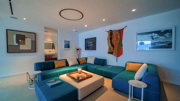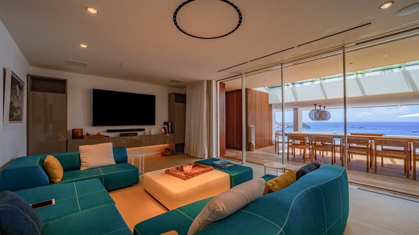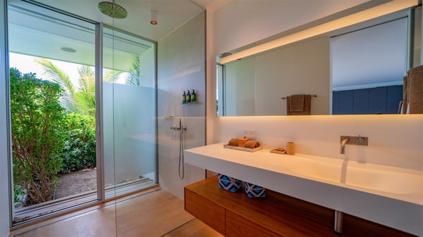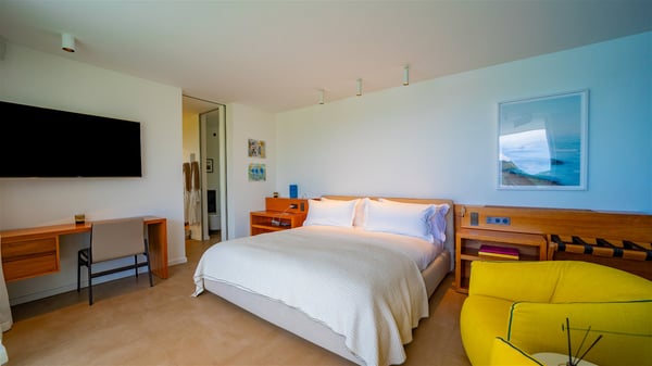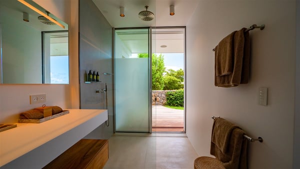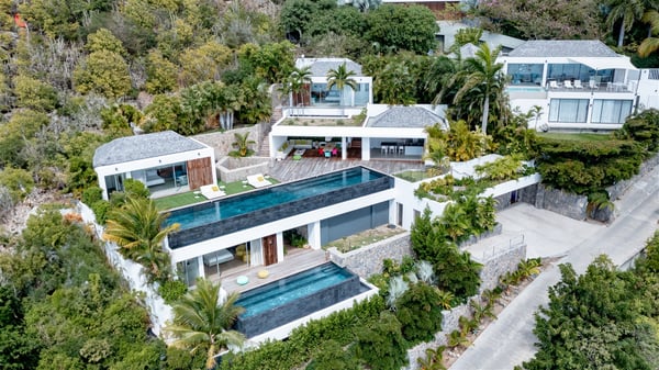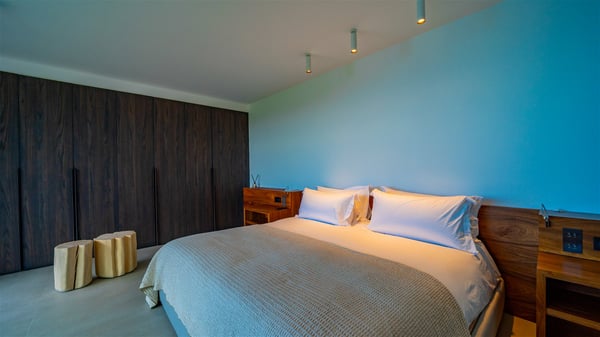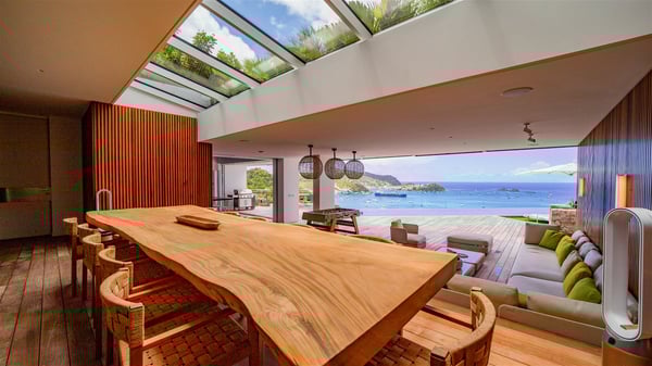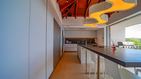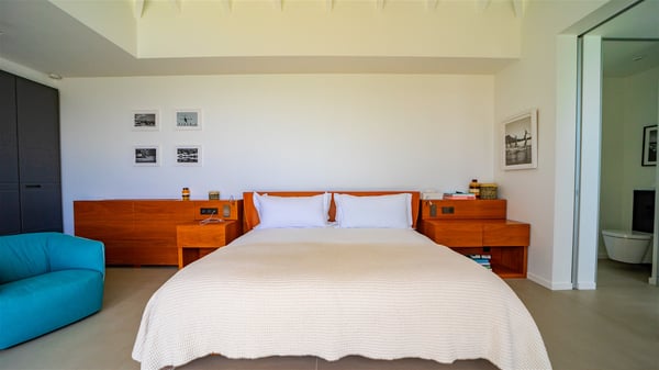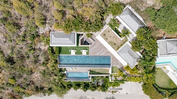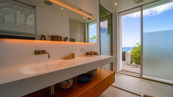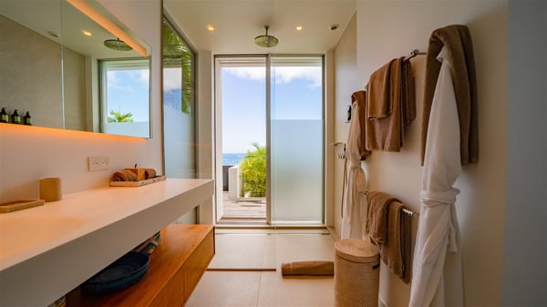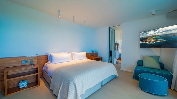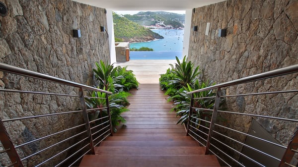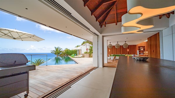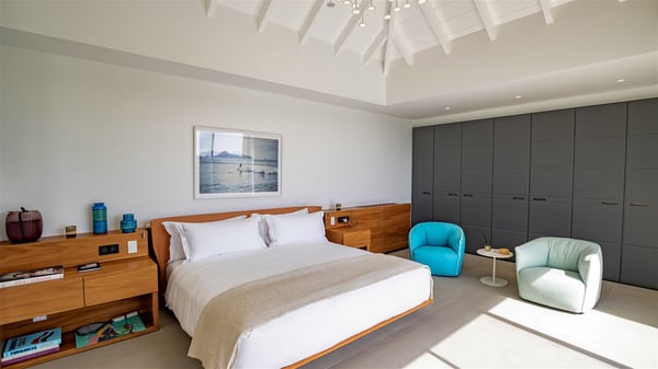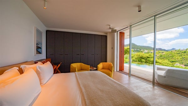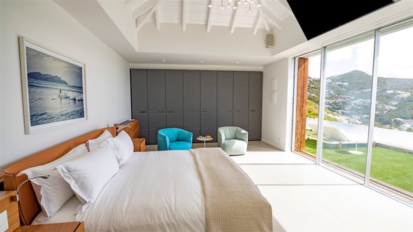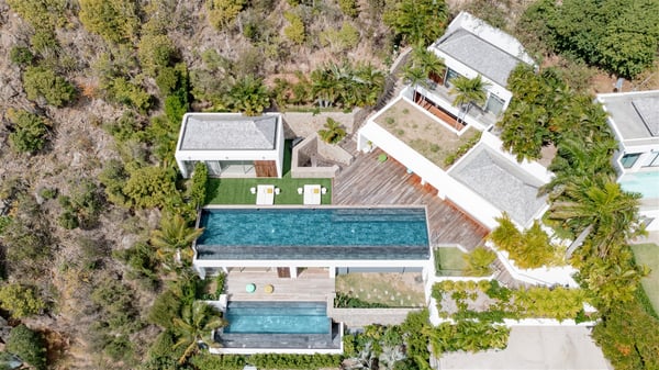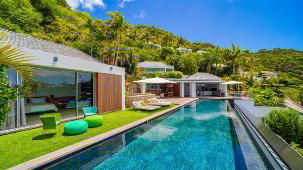 The villa rental Infra is a magnificent four-bedroom property located in Corossol, offering a breathtaking ocean view. With its two swimming pools and bright spaces amidst a lush environment, Infra is the perfect place for a unique stay for eight people in St-Barths. Designed over three levels on the cliffside, villa Infra overlooks the charming harbour of Corossol with its boats sailing on the sparkling waters. Its wide living area is divided into several comfortable zones, including a luxurious lounge with sofas and benches facing the stunning ocean view and the glorious sunset, a dining room with a raw-wood table for twelve guests, and a fully equipped kitchen with a dining area. The living room opens onto the main terrace with a swimming pool and a perfect horizon view, creating a paradisiacal atmosphere and a very private ambiance. A second lounge is located at the back, featuring comfortable sofas and a large HD screen for delightful movie nights. In the Caribbean beauty swept by the gentle trade winds, villa Infra is an ode to relaxation in the most luxurious setting. At the front, the terrace of Villa Infra offers a spectacular panoramic view. On the main level, the large heated swimming pool is equipped with comfortable loungers for pleasant sunbathing sessions. At the end of the terrace near the outdoor barbecue, you'll find a lovely table with colourful chairs under a parasol, perfect for talking over a coffee while admiring the glowing sunset. A second terrace with a smaller, heated swimming pool is on the lower level, accessible via a staircase, in the lush vegetation and palm trees with beautiful leaves. The vacation rental Infra consists of four air-conditioned bedrooms with beautiful sea views. All feature king-size beds, en-suite bathrooms, small desks or lounge areas, and open onto the terraces. One of them is on the main level with pool access, the second is on the upper level accessible via a staircase, and the other two are on the lower level near the second pool, accessible via a staircase from the main terrace. In an exceptionally beautiful setting, the villa rental Infra is the perfect place for a luxurious stay for eight people in St-Barths.