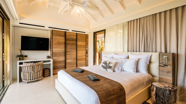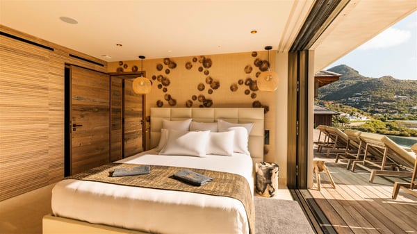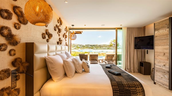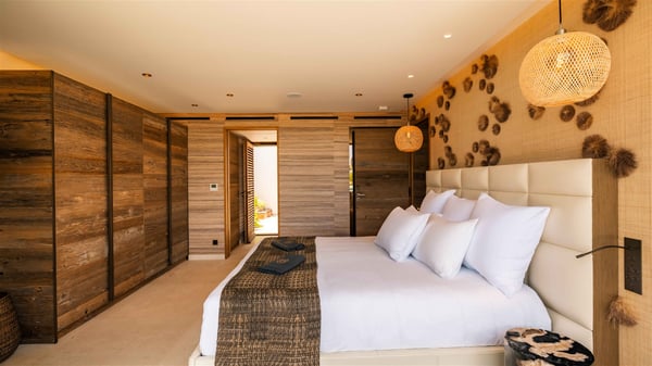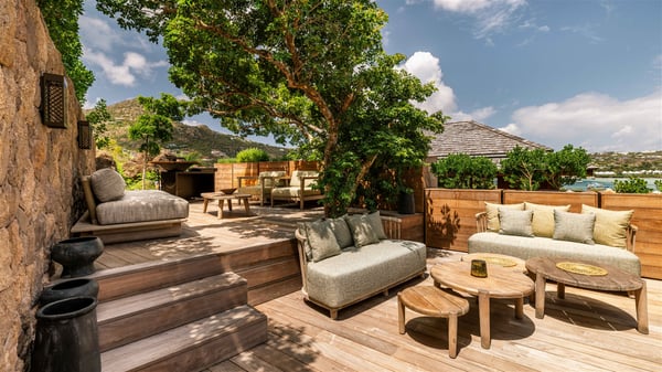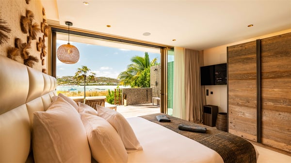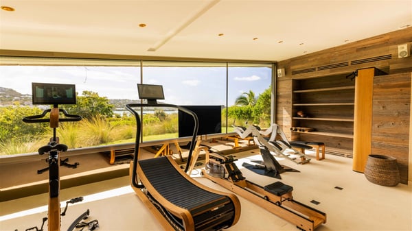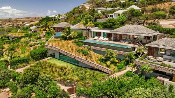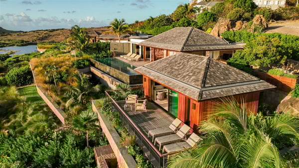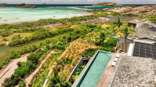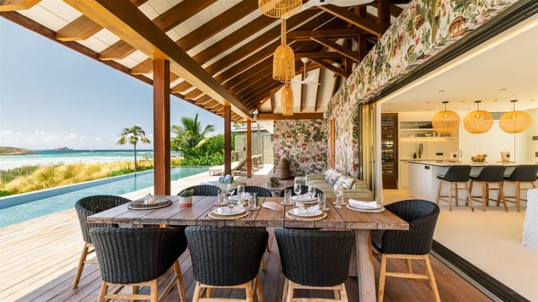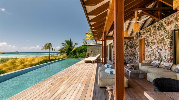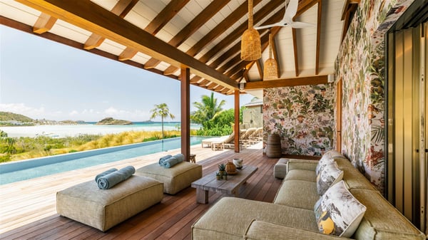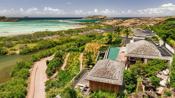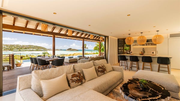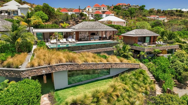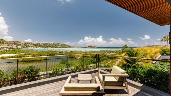 Villa Tourmaline is a splendid three-bedroom property ideally located in Grand-Cul-de-Sac, facing the crystal-clear waters of the lagoon. Along with villas Larimar, Lazuli, and Quartz, these four properties form a luxurious complex with 14 bedrooms, 4 pools, and exceptional views in a very quiet environment. With upscale amenities, bright spaces, and a private fitness room, Tourmaline is the dream villa for an exceptional group stay in St-Barths. Designed over several levels, the villa Tourmaline offers magnificent, bright spaces in a very peaceful setting. Facing the lagoon's crystal-clear waters, the living room features a comfortable air-conditioned lounge with sofas, benches, and an HD TV. The equipped kitchen with a bar and stools topped with wicker pendant lights is located in the same open-plan space. Open onto three sides, this refined living area lets in the soft light, creating an exclusive and very private atmosphere for wonderful, relaxing, and serene moments in the beauty of the Caribbean. At the front, Tourmaline's terrace opens onto the outstanding view over Grand-Cul-de-Sac lagoon and St-Barths' lush vegetation. The 16-meter-long, heated swimming pool sparkles under the sun's rays on the wooden deck, offering a stunning palette of blue from the lagoon. There are sun loungers lined up near the pool for delightful sunbathing sessions in a very private atmosphere. Under the covered part of the terrace, the al fresco dining area accommodates eight guests in a decor of vegetal prints, wood, and crafted beams, providing a unique charm to the setting. An outdoor lounge is also set up under the covered part, the perfect spot to sip a cocktail in the evening. You'll also enjoy the equipped fitness room located below the terrace, accessible via a staircase. The vacation rental Tourmaline consists of three beautiful air-conditioned bedrooms with king-size beds, en-suite bathrooms, and sea views. Two of them are near the living room and are interconnected, while the third one is on the lower level in a separate bungalow accessible via a staircase. All three open onto furnished terraces and offer an exceptional level of comfort in an elegant and refined decor. In the extraordinary beauty of Grand-Cul-de-Sac lagoon, villa Tourmaline is the perfect place to enjoy an exceptional stay in St-Barths with a large group, alongside the three neighbouring villas.