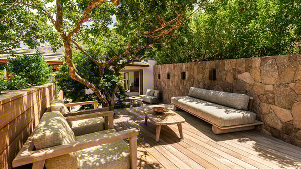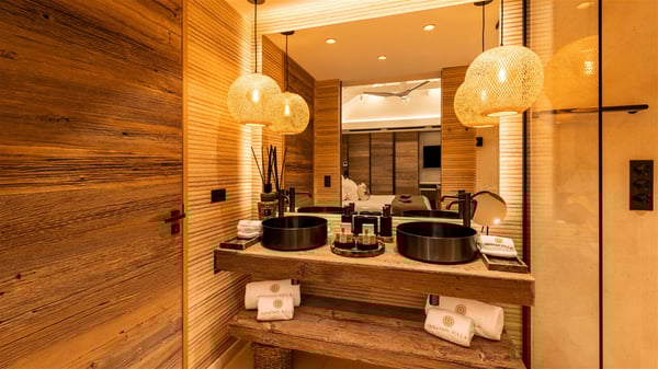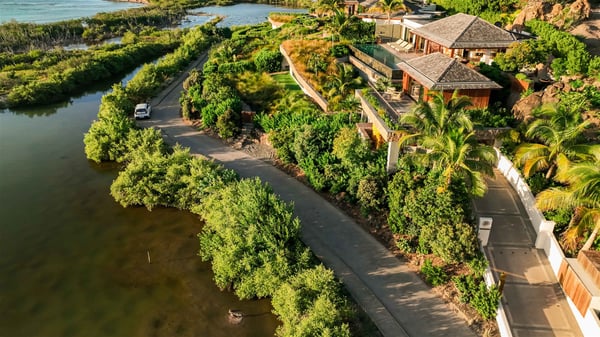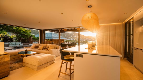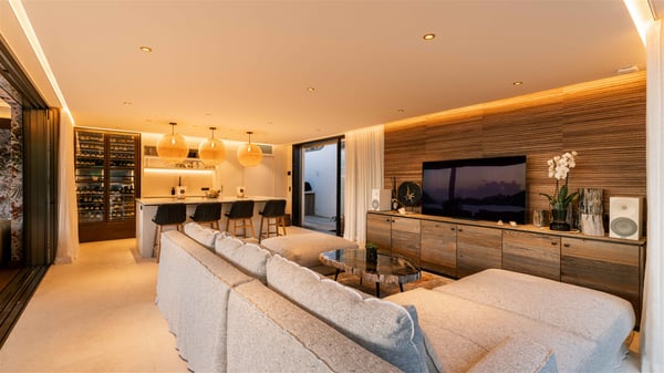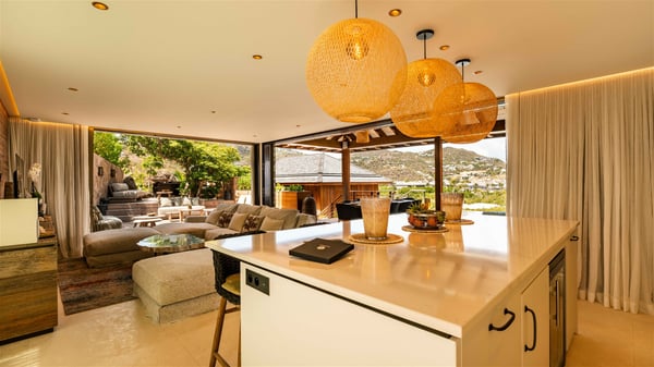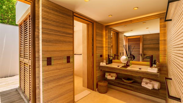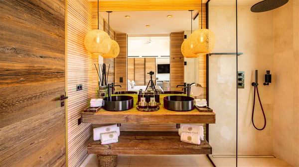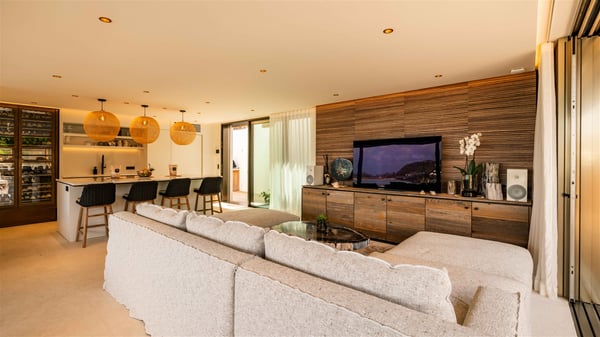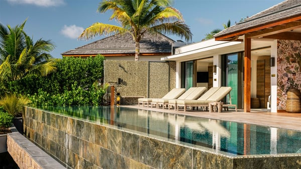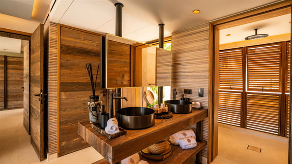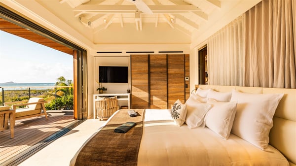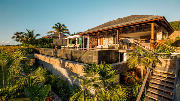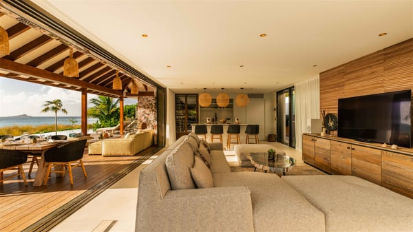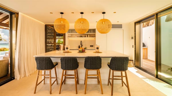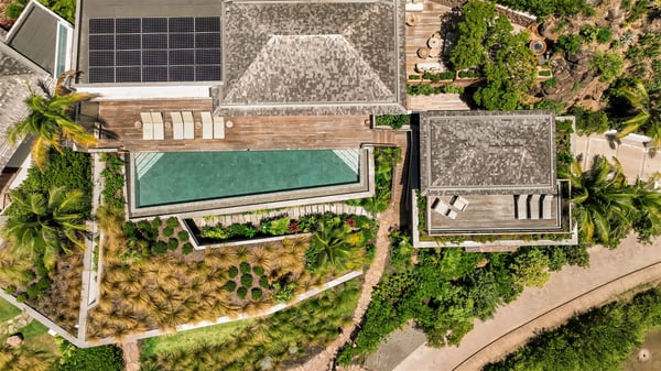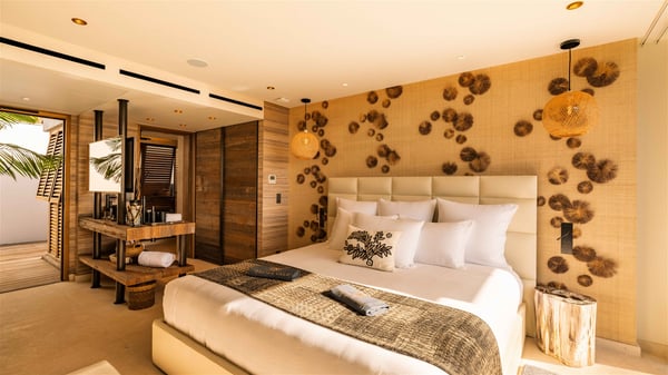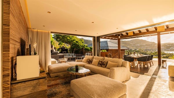 Villa Tourmaline is a splendid three-bedroom property ideally located in Grand-Cul-de-Sac, facing the crystal-clear waters of the lagoon. Along with villas Larimar, Lazuli, and Quartz, these four properties form a luxurious complex with 14 bedrooms, 4 pools, and exceptional views in a very quiet environment. With upscale amenities, bright spaces, and a private fitness room, Tourmaline is the dream villa for an exceptional group stay in St-Barths. Designed over several levels, the villa Tourmaline offers magnificent, bright spaces in a very peaceful setting. Facing the lagoon's crystal-clear waters, the living room features a comfortable air-conditioned lounge with sofas, benches, and an HD TV. The equipped kitchen with a bar and stools topped with wicker pendant lights is located in the same open-plan space. Open onto three sides, this refined living area lets in the soft light, creating an exclusive and very private atmosphere for wonderful, relaxing, and serene moments in the beauty of the Caribbean. At the front, Tourmaline's terrace opens onto the outstanding view over Grand-Cul-de-Sac lagoon and St-Barths' lush vegetation. The 16-meter-long, heated swimming pool sparkles under the sun's rays on the wooden deck, offering a stunning palette of blue from the lagoon. There are sun loungers lined up near the pool for delightful sunbathing sessions in a very private atmosphere. Under the covered part of the terrace, the al fresco dining area accommodates eight guests in a decor of vegetal prints, wood, and crafted beams, providing a unique charm to the setting. An outdoor lounge is also set up under the covered part, the perfect spot to sip a cocktail in the evening. You'll also enjoy the equipped fitness room located below the terrace, accessible via a staircase. The vacation rental Tourmaline consists of three beautiful air-conditioned bedrooms with king-size beds, en-suite bathrooms, and sea views. Two of them are near the living room and are interconnected, while the third one is on the lower level in a separate bungalow accessible via a staircase. All three open onto furnished terraces and offer an exceptional level of comfort in an elegant and refined decor. In the extraordinary beauty of Grand-Cul-de-Sac lagoon, villa Tourmaline is the perfect place to enjoy an exceptional stay in St-Barths with a large group, alongside the three neighbouring villas.