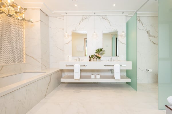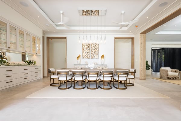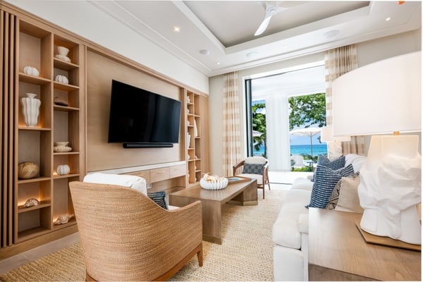 This brand-new, luxurious property redefines modern living with its avant-garde architecture and state-of-the-art luxury. Covering two expansive floors, “One Beachlands” is a showcase of elite architecture featuring top international brands, superior fittings, and the finest materials. The villa’s exterior, characterised by bespoke design and full-height windows, offers unparalleled views of the Caribbean Sea, making it a prime choice for Barbados luxury villas to rent. With six lavish ocean-facing bedrooms, this luxury beachfront vacation villa is an ideal retreat for families or those who delight in entertaining guests, offering an exclusive taste of luxury oceanfront villa living in Barbados. Designed with entertainment and seamless indoor-outdoor living in mind, it boasts an ocean-facing private gym, a state-of-the-art home cinema, and an integrated smart home automation system for the pinnacle of convenience. The outdoor allure is just as impressive, featuring a 75ft long infinity swimming pool with unfettered Caribbean Sea views. Two pavilions flank the pool, providing idyllic spots for relaxation or hosting gatherings. A direct pathway from the garden to the sea invites guests to indulge in tropical snorkeling right at their doorstep. The grand carriage entrance, complete with a unique water feature, sets the tone for the unparalleled luxury that awaits within.