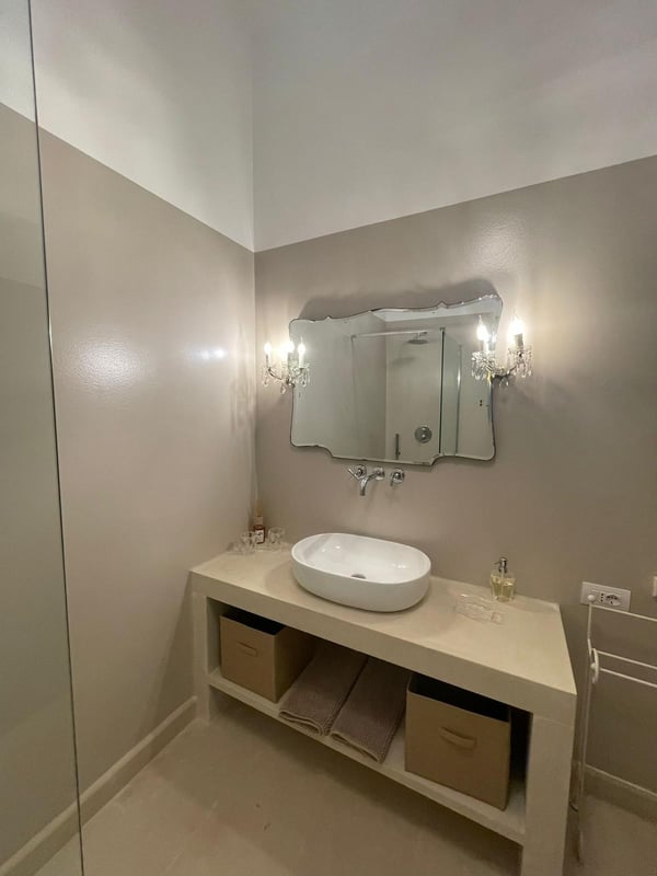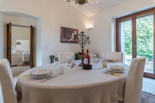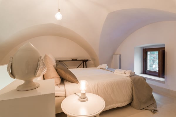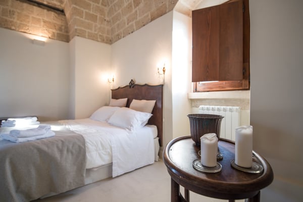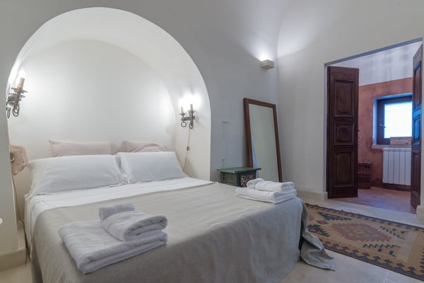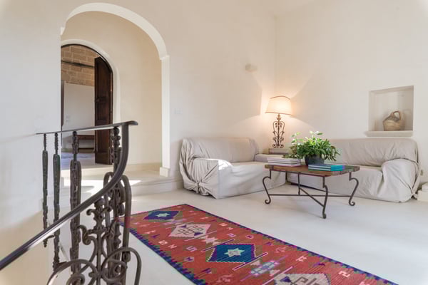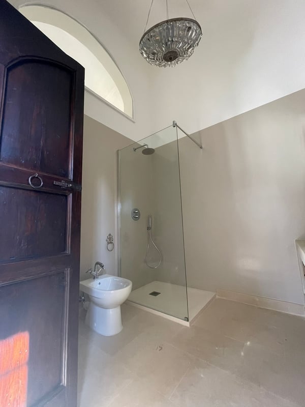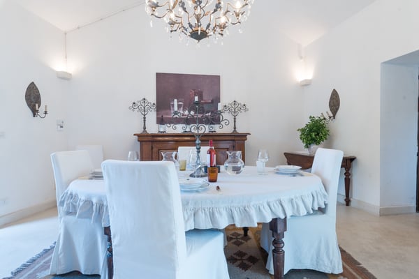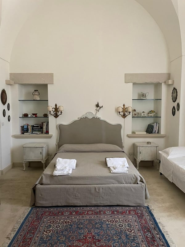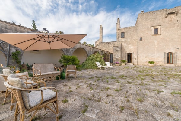 Beautiful and elegant farmhouse with swimming pool located in a large property on the outskirts of the city of Galatina and a few km from the white beaches of Gallipoli, Masseria Lo Scalfo is composed of an ancient nucleus with a tower dating back to 1500 and a traditional “courtyard house. “dated 1800. Today completely renovated to become a charming residence, it is characterized by large and bright rooms finely furnished with an exquisite mix of antique and shabby-chic in which respect for materials and tradition are also evident in the choice of colors, with a prevalence of white, which defines each room. To complete a magical and timeless picture in which to get lost as soon as you cross the gate, the wonderful and well-kept garden that surrounds the entire farm and which thanks to the wealth of trees and plants of all kinds allows you to identify different and naturally separate corners where to get lost , alone, in moments of pleasant relaxation and rest. Large main entrance with wooden door which leads to the living area on the left and the sleeping area on the right. Living area: large double living room furnished with sofas and armchairs, fireplace, TV, windows overlooking the internal courtyard and garden, small secondary entrance, dining room, large fully equipped eat-in kitchen with direct access to the courtyard through a French window, 1 service bathroom and laundry room. Sleeping area: 2 double bedrooms each with en-suit bathroom / shower, mezzanine corridor with 2 single beds, 1 double bedroom on the mezzanine with the possibility of 1 extra single bed, 1 bathroom / shower in the corridor, hallway with staircase leading to leads to the “tower suit” on the first floor consisting of a small living area with sofas and French windows for accessing the large panoramic terrace, 1 large and bright double bedroom (note: this room uses the bathroom on the ground floor which is right next to the stairs). All bedrooms have air conditioning. Square internal courtyard furnished with umbrellas, table and chairs for 12 people, perfect for outdoor lunches and dinners, relaxation corner with wicker sofas and armchairs; Swimming pool 11×5.50 (1.20m deep) recently built in a corner of the property which is almost a small natural quarry, with a solarium area around it equipped with sun loungers and gazebo set up with cushions, sofa and armchairs; very large land of which a part deliberately preserved in its original state while the part closest to the house is characterized by a beautiful partially terraced garden full of trees, flowers and plants typical of the Mediterranean scrub. CIN: IT075029C200041116