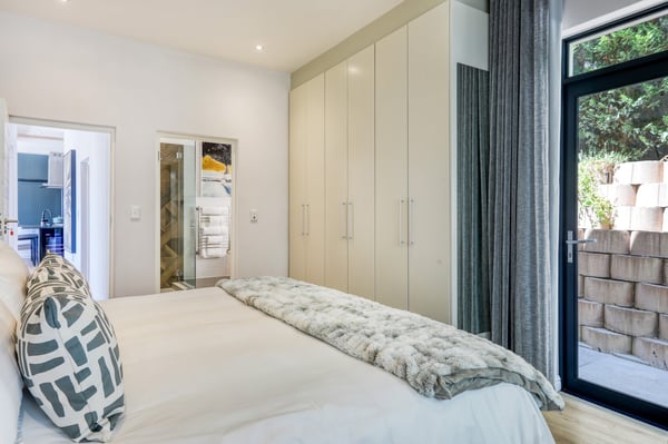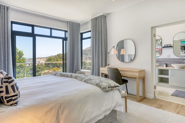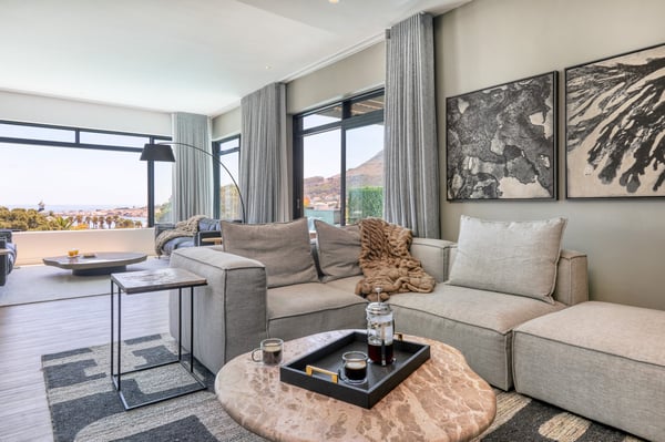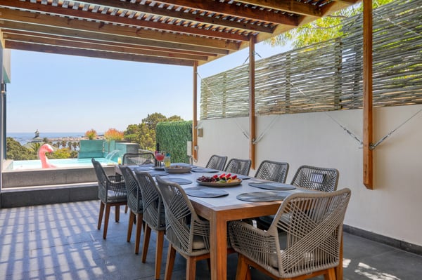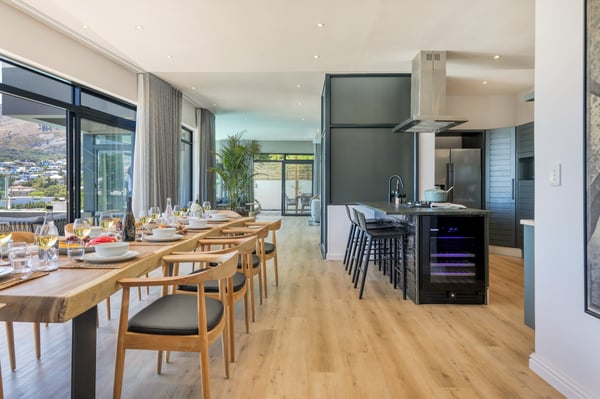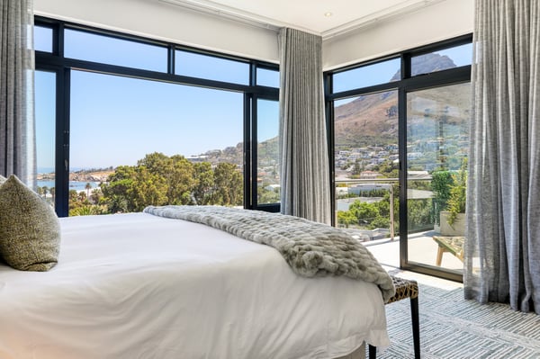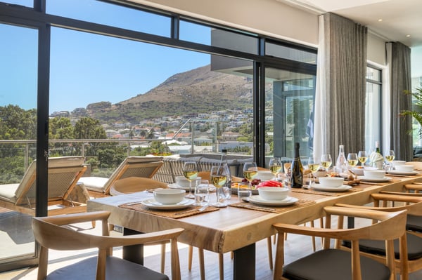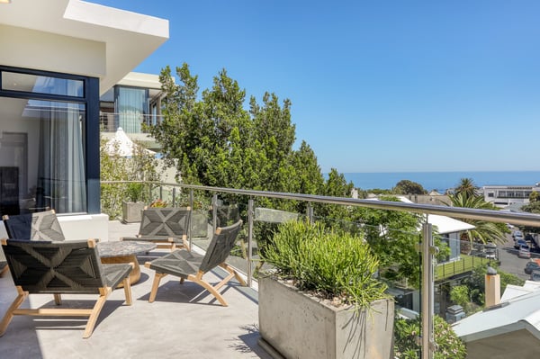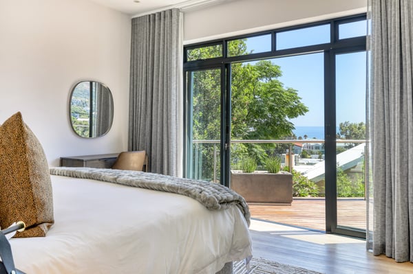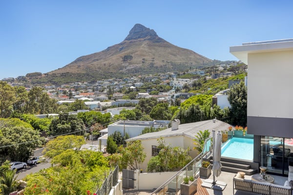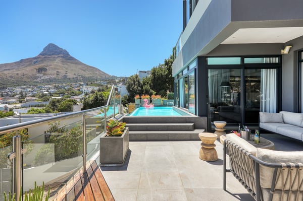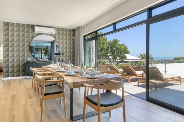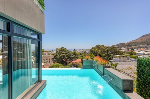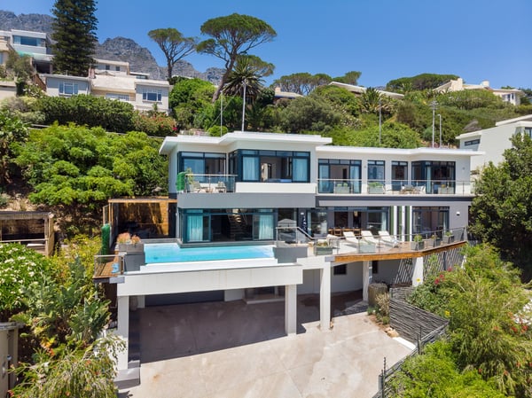 Situated in the heart of Camps Bay just minutes from the palm-lined beachfront, Vista Del Mare is a beautifully designed holiday home that is ideal for families and groups of friends wanting a luxurious ocean-side retreat. Designed to create an elegant and sophisticated seaside escape, this split-level, five-bedroom abode combines five-star style with absolute comfort to create a lavish home away from home. Sumptuously furnished, open-plan living areas overflow onto wide terraces with stunning panoramic mountain and sea views. The entrance level of the house enjoys direct access from the double garage, a state-of-the-art theatre room, and a guest bathroom. A glass elevator and staircase connect all levels of the house and add an element of glamour. Elegantly furnished living areas occupy the second level of the house. Deep-set leather couches, a large dining table for 10-12 people, and a designer kitchen create a chic, open-plan space. Exquisite artworks adorn the walls and a guest bathroom can also be found on this level. These gorgeously furnished living spaces flow onto a wide terrace and pool deck with a wraparound pool and magnificent views of Lion’s Head and the Atlantic Ocean. The sophisticated kitchen houses state-of-the-art appliances, including a fridge/freezer with an ice maker, gas stove, and a bespoke wine fridge, while a sleek breakfast bar seamlessly connects with the open-plan dining area to create the perfect entertaining space. The spacious terrace has a stylish outdoor lounge and alfresco dining for 10 people. The magnificent wraparound infinity pool is the piéce de résistance with breathtaking views of Lion’s Head and the pool deck has sun loungers, a cantilever umbrella, and an outdoor shower. Two beautifully decorated bedrooms are housed on the first level with spacious en-suite bathrooms and air-conditioning. The first bedroom has a standard king-size bed and an en-suite bathroom with a shower and oval bathtub. The second bedroom has a twin-to-king bed and an en-suite bathroom with a shower. The first bedroom opens out onto the pool deck and terrace with ocean views, while the second bedroom has lovely mountain views. The glass elevator or the staircase takes you up to the second floor, where two primary bedrooms and the third bedroom can be found. Elegance and luxury flow through both the primary bedrooms, which boast sumptuous furnishings, creamy tones, and spectacular ocean views. The first primary bedroom has a king extra-length bed and a spacious en-suite bathroom with a large limestone bath and walk-in shower. This room has a large, wall-mounted flat-screen television, a walk-in closet area, a work desk, and access to a large, shared balcony with outdoor seating and spectacular views. The second primary bedroom has a twin-to-king extra-length bed and a spacious en-suite bathroom with an oval bath and a double walk-in shower. This room has a large, wall-mounted flat-screen television, a work desk, and access to the shared balcony with outdoor seating and spectacular views. The fifth bedroom has a queen-sized bed, an en-suite bathroom with a shower and an oval bath, and access to the shared balcony with outdoor seating and spectacular views. Vista Del Mare has a double garage and off-street parking for several cars. The house is fully secure with an alarm and offers a dedicated housekeeper to take care of all your needs. A short drive will take you to the bustling palm-lined beachfront of Camps Bay with its plethora of beach bars, cafés, restaurants, and shops. The Table Mountain Cableway and the V&A Waterfront are just a 15-minute drive away.