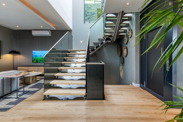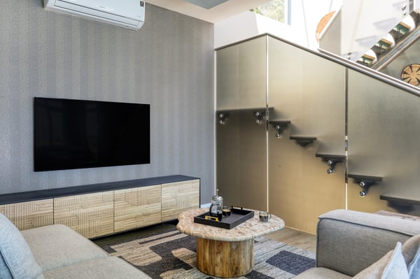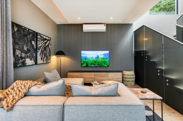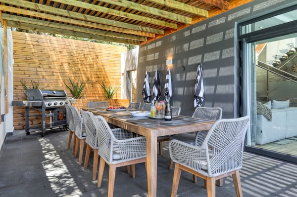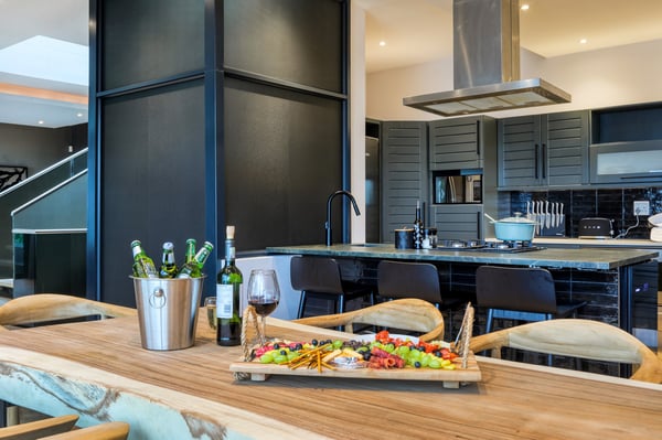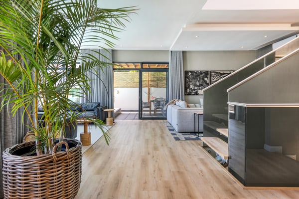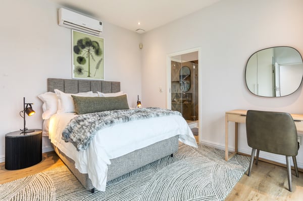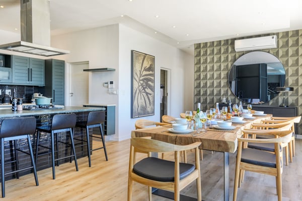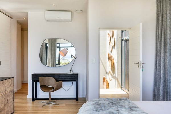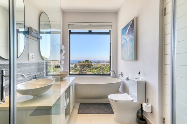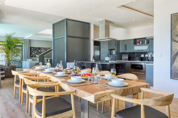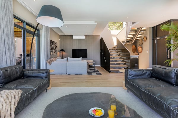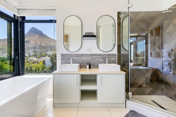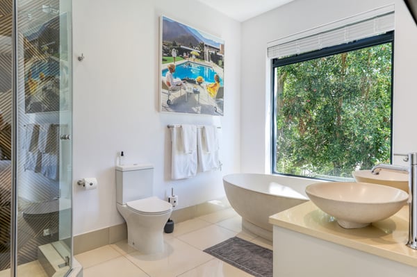 Situated in the heart of Camps Bay just minutes from the palm-lined beachfront, Vista Del Mare is a beautifully designed holiday home that is ideal for families and groups of friends wanting a luxurious ocean-side retreat. Designed to create an elegant and sophisticated seaside escape, this split-level, five-bedroom abode combines five-star style with absolute comfort to create a lavish home away from home. Sumptuously furnished, open-plan living areas overflow onto wide terraces with stunning panoramic mountain and sea views. The entrance level of the house enjoys direct access from the double garage, a state-of-the-art theatre room, and a guest bathroom. A glass elevator and staircase connect all levels of the house and add an element of glamour. Elegantly furnished living areas occupy the second level of the house. Deep-set leather couches, a large dining table for 10-12 people, and a designer kitchen create a chic, open-plan space. Exquisite artworks adorn the walls and a guest bathroom can also be found on this level. These gorgeously furnished living spaces flow onto a wide terrace and pool deck with a wraparound pool and magnificent views of Lion’s Head and the Atlantic Ocean. The sophisticated kitchen houses state-of-the-art appliances, including a fridge/freezer with an ice maker, gas stove, and a bespoke wine fridge, while a sleek breakfast bar seamlessly connects with the open-plan dining area to create the perfect entertaining space. The spacious terrace has a stylish outdoor lounge and alfresco dining for 10 people. The magnificent wraparound infinity pool is the piéce de résistance with breathtaking views of Lion’s Head and the pool deck has sun loungers, a cantilever umbrella, and an outdoor shower. Two beautifully decorated bedrooms are housed on the first level with spacious en-suite bathrooms and air-conditioning. The first bedroom has a standard king-size bed and an en-suite bathroom with a shower and oval bathtub. The second bedroom has a twin-to-king bed and an en-suite bathroom with a shower. The first bedroom opens out onto the pool deck and terrace with ocean views, while the second bedroom has lovely mountain views. The glass elevator or the staircase takes you up to the second floor, where two primary bedrooms and the third bedroom can be found. Elegance and luxury flow through both the primary bedrooms, which boast sumptuous furnishings, creamy tones, and spectacular ocean views. The first primary bedroom has a king extra-length bed and a spacious en-suite bathroom with a large limestone bath and walk-in shower. This room has a large, wall-mounted flat-screen television, a walk-in closet area, a work desk, and access to a large, shared balcony with outdoor seating and spectacular views. The second primary bedroom has a twin-to-king extra-length bed and a spacious en-suite bathroom with an oval bath and a double walk-in shower. This room has a large, wall-mounted flat-screen television, a work desk, and access to the shared balcony with outdoor seating and spectacular views. The fifth bedroom has a queen-sized bed, an en-suite bathroom with a shower and an oval bath, and access to the shared balcony with outdoor seating and spectacular views. Vista Del Mare has a double garage and off-street parking for several cars. The house is fully secure with an alarm and offers a dedicated housekeeper to take care of all your needs. A short drive will take you to the bustling palm-lined beachfront of Camps Bay with its plethora of beach bars, cafés, restaurants, and shops. The Table Mountain Cableway and the V&A Waterfront are just a 15-minute drive away.