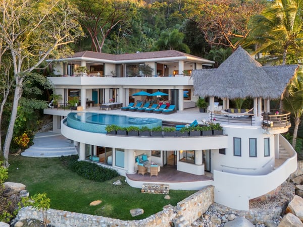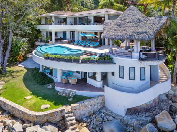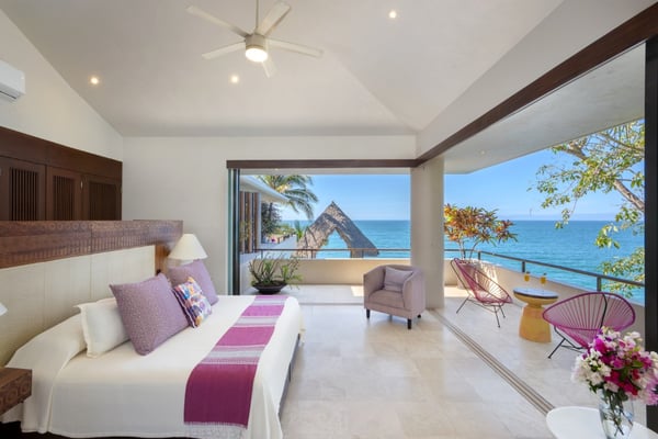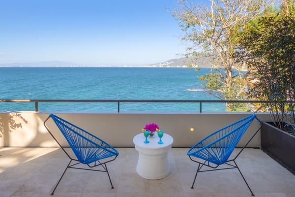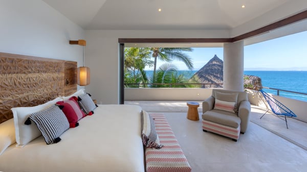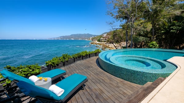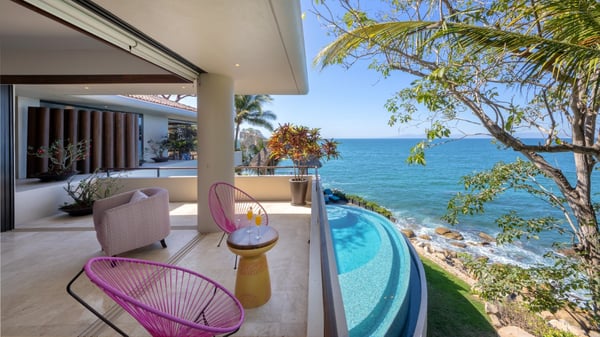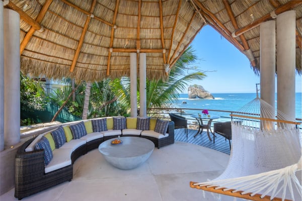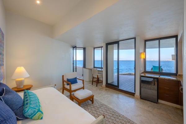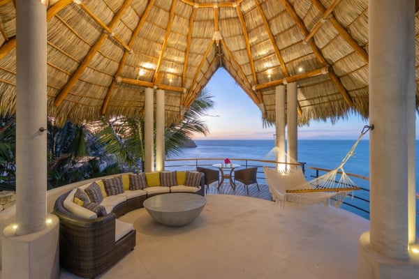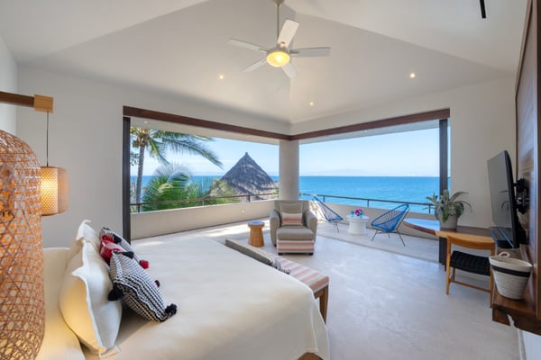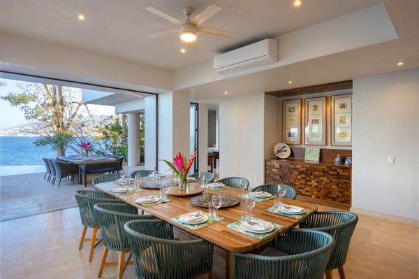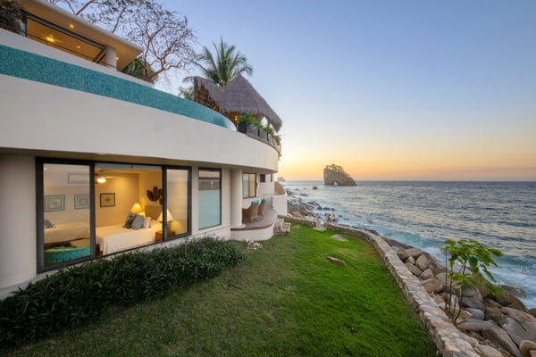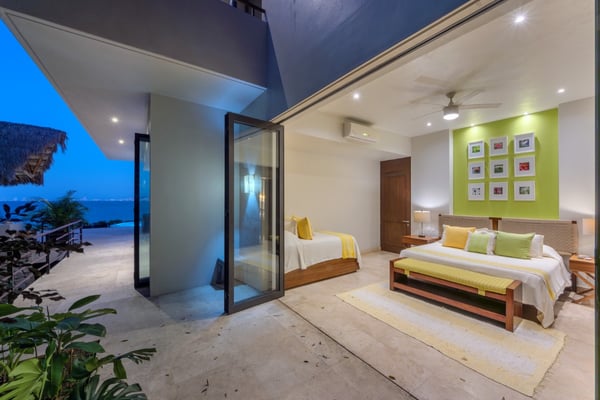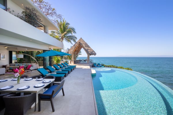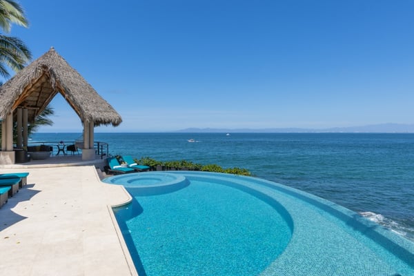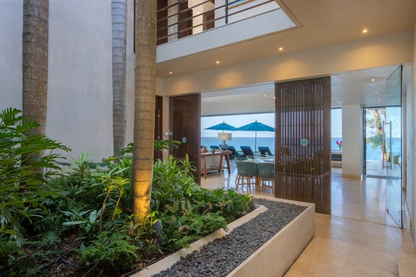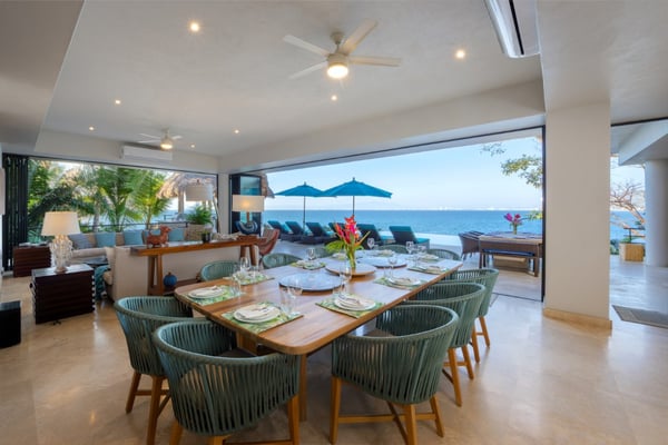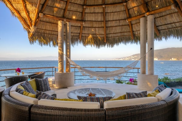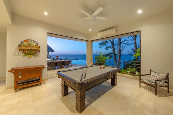 The sun of Puerto Vallarta shines above and the ocean falls gently below in Casa Peña del Mar. Located in Banderas Bay, with panoramic views of the Bay of Bandares and the iconic formations of Los Arcos, this luxury vacation rental is one of the six personalized villas in the exclusive Sierra del Mar in the community of Los Arcos. Completely updated with Modern sleek interior and exterior spaces and a private beach, the property is equally suitable for a relaxed family vacation or a warm weather getaway with friends. The name of the villa translates as "sea rock" and, in fact, you can enjoy the sun as it sets behind the distinctive “Los Arcos” from the row of sun loungers and the heated infinity pool and the jacuzzi on the terrace facing the sea. A palapa provides a breather in the shade of the sun, and a barbecue and an outdoor dining room invite you to stay outside until the afternoon. Of course, there is also a sound system, satellite television and a games room with a pool table and comfortable plush modern couches when its time to move inside. Your stay includes the preparation two meals a day (three can be arranged at a small additional fee) from the villa's chef, the services of other staff and access to the community beach club, the shared pool, the gym, the sauna and the steam room. The exterior spaces are connected to the interiors of the villa by glass walls, which can be folded back to create a perfect living room. Ocean breezes float over the living room, where a spacious section is accentuated by the traditional Otomi cushions and the formal dining room, with capacity for twelve people. The new fully equipped kitchen has a large breakfast bar and state of the art appliances. From the surroundings of the villa in the southern area of Puerto Vallarta, it is a 2 minute walk from the private beach that belongs to the Sierra del Mar in the community of Los Arcos, a 3 minute drive from Playa las Gemelas and fantastic snorkeling in the Los Arcos National Park, and a 10 minute drive from the cafes, shops and historic streets of the charming Romantic Zone of Puerto Vallarta.