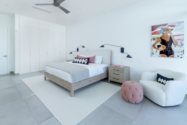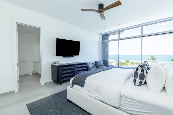Introducing one of four new and exclusive five-bedroom island villas, Bliss Four boasts an impressive oceanfront location on the incomparable Grace Bay beach, a mere five minutes from local shops and amenities. In excess of 10,000 square feet, this peerless property benefits from stunning architecture, a super-luxe interior and vast ocean views as far as the eye can see. Built with the utmost attention to detail, each Bliss villa marries the ease of relaxed open-plan living with soft, neutral fabrics and sparkling mood lighting accented by stone, granite and quartz finishes. Impressive full-height ceilings and picture windows allow natural light to flood through the villa, whilst at the rear, an extensive first-floor balcony, terrace and sun deck ensure the beach and stunning sea views are ever present. State-of-the-art indoor/outdoor kitchens and BBQ are a Chef’s dream, and ideal for effortless in-villa dining and entertaining. A host of exterior relaxation areas combine with the cool waters of an infinity pool, complete with a beachside shower. Bliss Villas offer VIP amenities, Butler & Chef service, a media room, plus a shared gym, pickle ball courts, paddle boards and kayaks. Welcome to Bliss Four Villa – the ultimate Grace Bay experience.