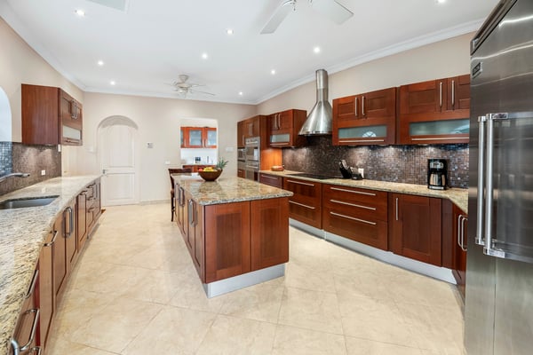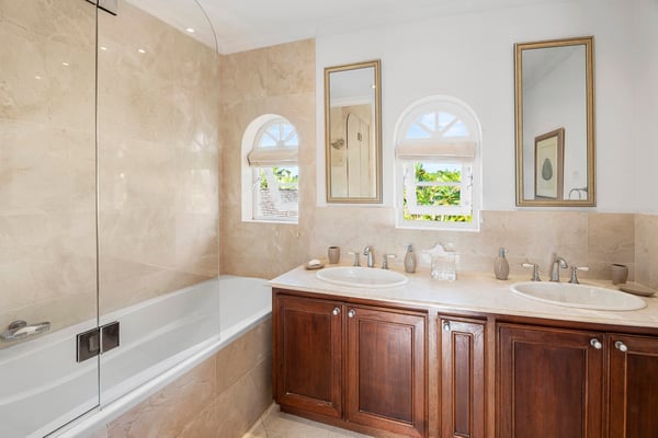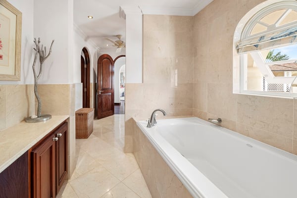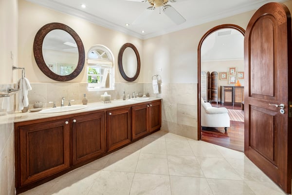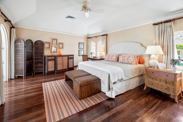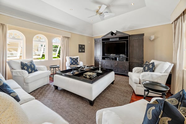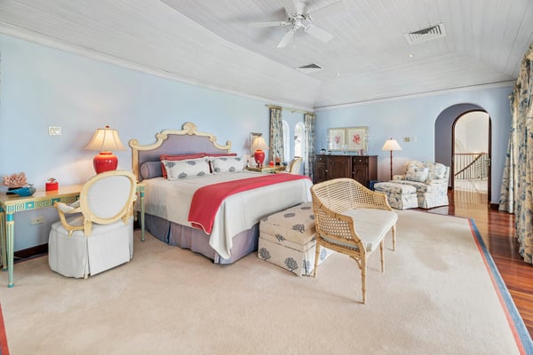 Located in the exclusive Royal Westmoreland Resort, The Royal Westmoreland House is a beautiful three-story villa with picturesque views of the Caribbean Sea. Nestled within the prestigious Royal Westmoreland Resort, The Royal Westmoreland House is a stunning villa offering breathtaking views of the Caribbean Sea. Designed with timeless colonial elegance, this six-bedroom, six-bathroom villa features exquisite mahogany finishes and showcases high ceilings and marble floors in the grand foyer, accessible via a picturesque Koi Pond bridge. The entrance level leads to two identical en-suite cottages, located in the east and west wings of the property. These charming retreats boast king-sized beds, ample closets, and French doors that open to private balconies, each offering serene views of the lush tropical gardens. The second floor is home to two luxurious en-suite master bedrooms, each with a covered, private, and fully furnished terrace, perfect for enjoying panoramic views of the nearby golf course and spectacular sunsets. A cozy entertainment room with a flat-screen TV is also located on this level, providing an ideal space for relaxation. On the lower level, French doors open to an expansive deck, perfect for outdoor entertaining. The deck features a BBQ area, dining space, and an infinity pool as its centerpiece, surrounded by comfortable loungers and umbrellas. Two additional en-suite bedrooms are located on this level, along with a fully equipped kitchen and a spacious living area designed for entertaining guests.