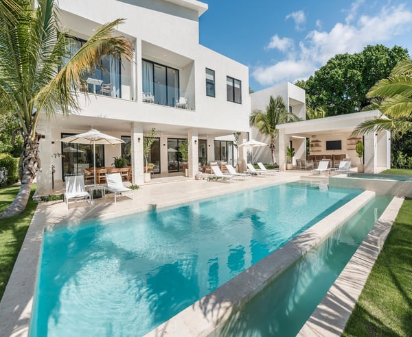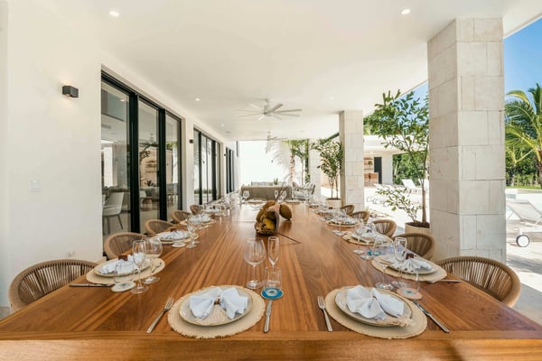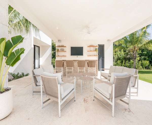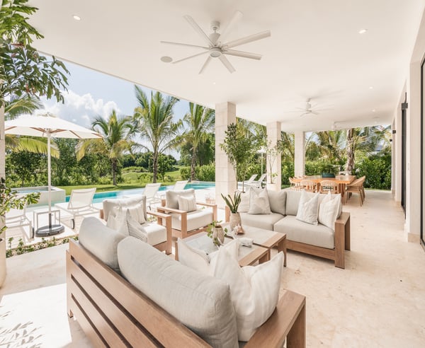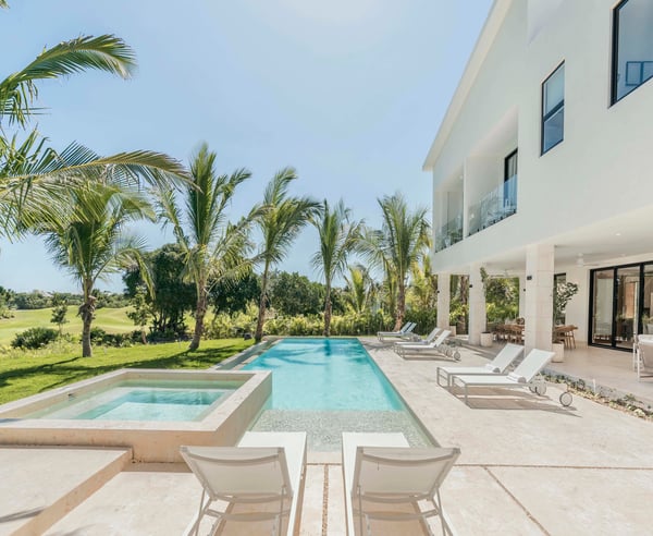 Guests staying within Puntacana Resort & Club will have access to all resort amenities and facilities. Resort amenities and facilities include two golf courses ($), two beach clubs ($), Six Senses Spa ($), restaurants ($), bars ($) and tennis centre ($). This 7-bedroom contemporary golf view villa in Puntacana Resort & Club is a luxurious retreat that offers breathtaking views of the Hacienda golf course and is located just 5 minutes from the beach. Designed with modern architecture, this villa provides a serene and tranquil environment, perfect for a relaxing getaway. As you enter the villa, you are welcoming the living room and studio that connect the main areas of the house, including the main dining room with seating for 14 guests. The living room opens up to a spacious terrace overlooking the golf course, perfect for relaxing and enjoying the scenery. The kitchen is fully equipped with high-end appliances and features a breakfast bar, ideal for quick meals and snacks. The villa boasts seven spacious and elegant bedrooms, each with its own en-suite bathroom & private balconies. The rooms are furnished with comfortable beds, high-quality linens, and large windows that allow plenty of natural light to enter. The primary bedroom is particularly impressive, featuring its own private terrace with golf course views and a large en-suite bathroom. The villa also includes a private outdoor swimming pool and a heated jacuzzi, surrounded by lush tropical gardens. Additionally, there are numerous outdoor lounging areas, where guests can unwind and enjoy the beautiful Caribbean weather.