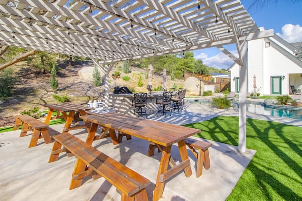Welcome to The Crimson Hollow! A day spent outdoors is a day well spent, especially at this well-landscaped home with every activity under the sun. Challenge your friends to a pickleball match, round of volleyball, or basketball game—and if that isn’t enough fun for you, there’s always putt-putt golf to keep the good times going. There's also a game room that features a pool table, ping pong table, and foosball. Once you’re ready to cool down and unwind, a refreshing pool awaits and an alfresco dining table under string lights offers the perfect setting to indulge in barbecue hot off the grill. Come sundown, there’s no better place to admire the stars than gathered around the fire pit with your group. Cheers! There’s a lot to see in this town and even more to drink. Our suggestion? A tour at one of the local wineries so you and your group can sample a diverse range of local flavors. For something less intoxicating but equally fun, visitors can berry-pick at local farms and taste the fruits of their labor. Hot air-ballooning is a stunning way to see the rolling hills of Southern California wine country from every angle and is one of Temecula’s most sought-after attractions. Local Attractions: Old Town Temecula, Hot Air Balloon Tours, Wilson Creek Winery, Bluewater Grill, Vindemia Vineyard & Estate Winery, The Goat & Vine, Trattoria Toscana, Bottaia Winery, The Restaurant at Ponte. Parking Details: The driveway accommodates 6 cars. The owner's field next door can fit an additional 8 cars but be sure to use it at your own risk. No street parking. STR Permit No: RVC-1536