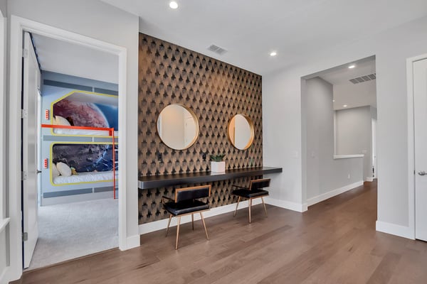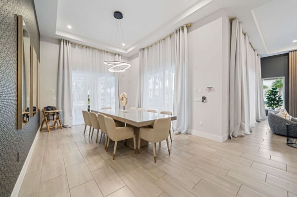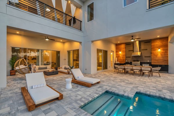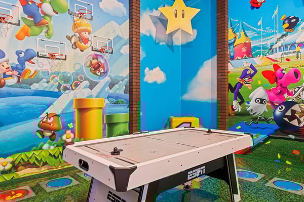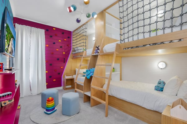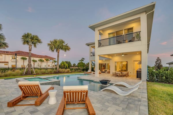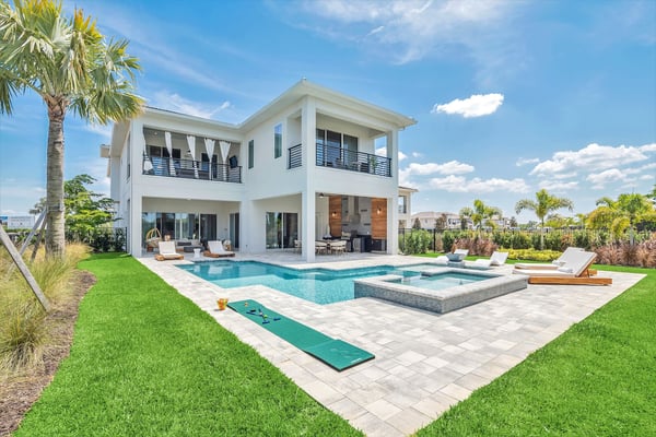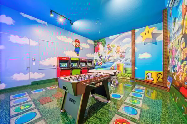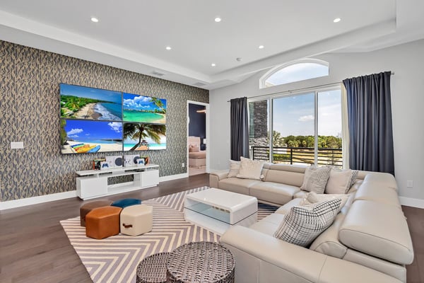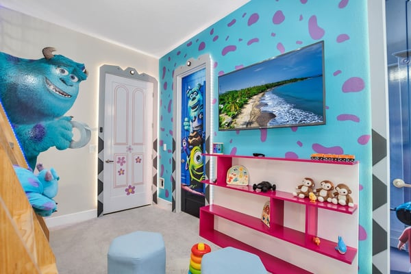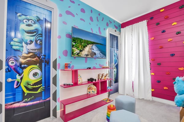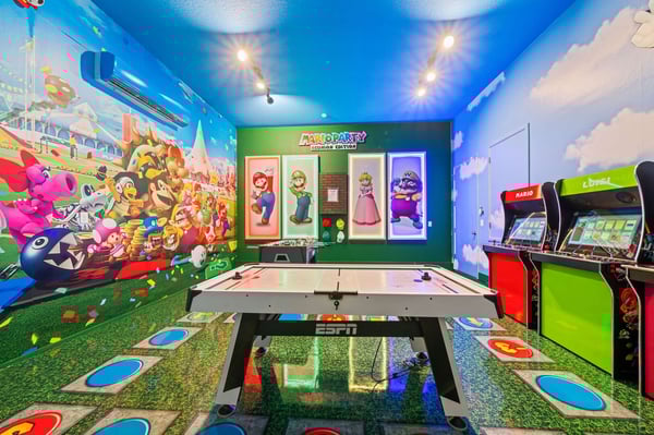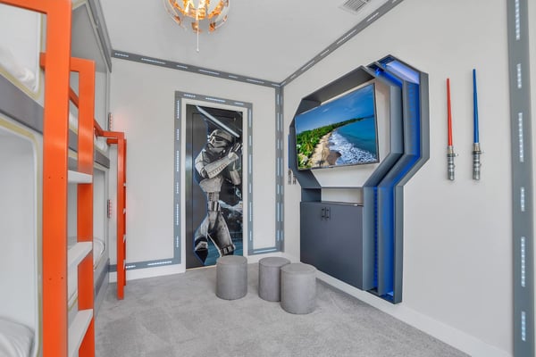 Step into a lavish estate where sophistication meets family-friendly fun! This beautifully designed retreat is adorned with elegant gold accents and features a spacious open-concept layout, perfect for bringing everyone together. Relax in the inviting living area, complete with two plush sofas and chic accent chairs—ideal for cozy chats and quality time. The chef’s kitchen is a showstopper, featuring a stunning marble island with seating for four and a large dining table that comfortably accommodates ten guests. With room for up to 18 people, the estate includes two luxurious king suites on the main floor and three additional suites upstairs, offering plenty of privacy and comfort for all. Children will be thrilled by the imaginative themed bedrooms—one whisking them off to a galaxy far, far away and another filled with delightful, friendly monsters sure to inspire giggles and play. Entertainment abounds, from the private home theater perfect for movie marathons to the balcony game area equipped with a combination pool and ping pong table. Outside, soak up the Florida sunshine on the expansive private deck, where a sparkling swimming pool and relaxing spillover spa await. Fire up the outdoor summer kitchen’s grill for alfresco feasts, then gather around the fire pit for s’mores and stargazing. Here, upscale comfort blends seamlessly with joyful experiences—creating the ultimate destination for unforgettable memories.