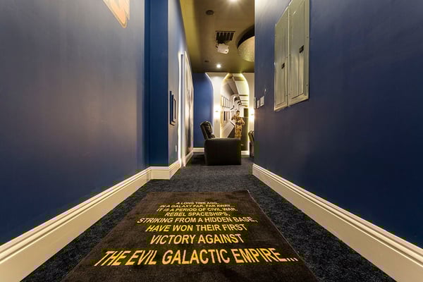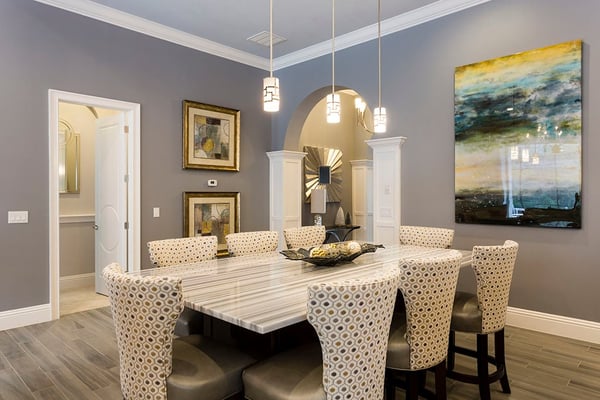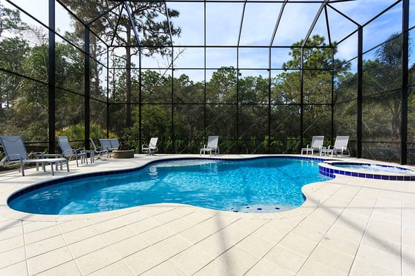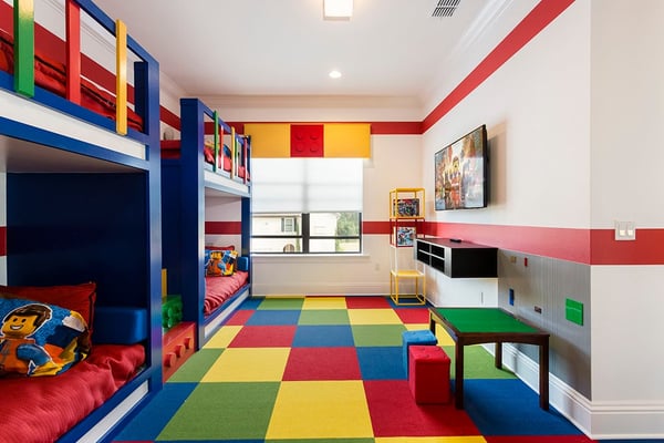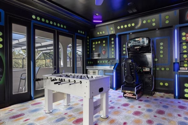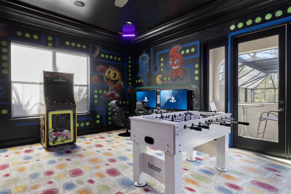 Why settle for a standard hotel suite when your family and friends can have the luxury and privacy of this stunning vacation home? Step through the grand front hallway into a bright, open living area where elegance meets comfort. Accented with art deco touches, the main gathering space features plush gray and yellow seating—perfect for watching TV, playing board games, or simply relaxing and socializing. The light-filled, open-concept kitchen boasts upgraded appliances, ample cabinetry and counter space, and a convenient breakfast bar. Just steps away, an elegant eight-seat dining table invites you to enjoy more formal vacation meals together. Entertainment options abound! Kids (and kids at heart) will love the vibrant, video game-themed game room, complete with foosball, air hockey, a multi-arcade video game machine, an arcade racing game, and a PlayStation console. For a more laid-back movie night, head to the Galactic-inspired home theater, where graduated cinema seating offers the ultimate film experience. The spacious, beautifully styled bedrooms feature luxurious en suite bathrooms with stunning architect-designed soaking tubs as focal points. Two whimsical bunk rooms—one Lego-themed and the other inspired by an Ice Princess—each offer four cozy bunk beds, perfect for younger guests. Step outside to the screened-in porch and discover your private oasis: a sparkling pool and spa overlooking lush golf course views. An outdoor kitchen with a built-in grill and fridge makes dining al fresco a must, while evenings are best spent gathered around the fire pit, planning tomorrow’s adventures.