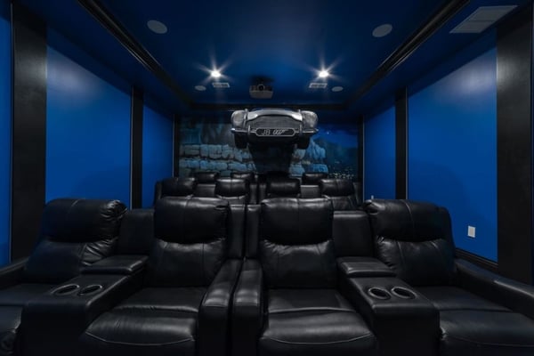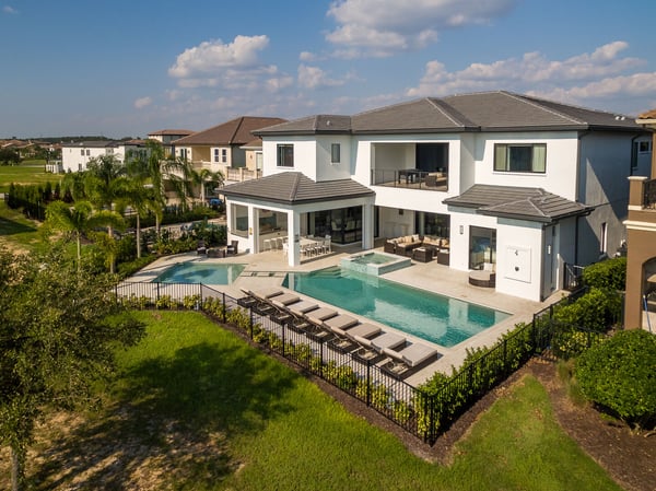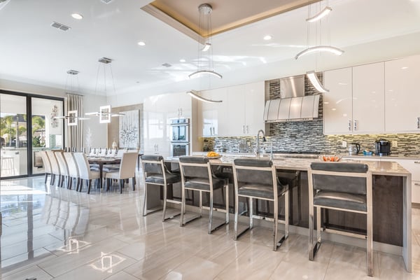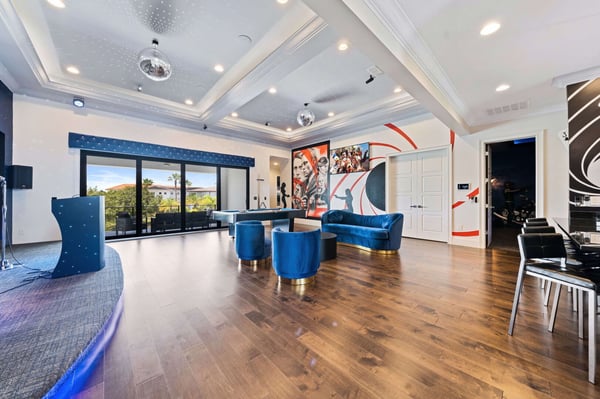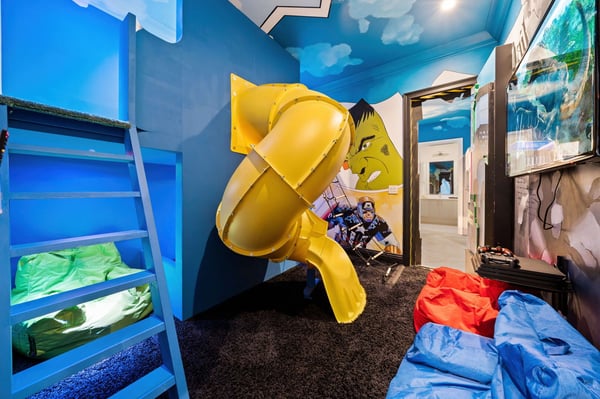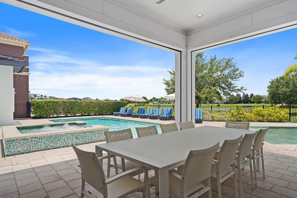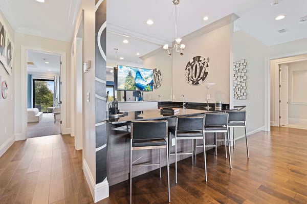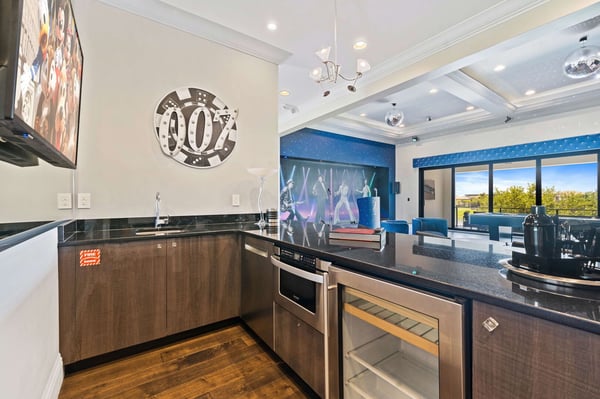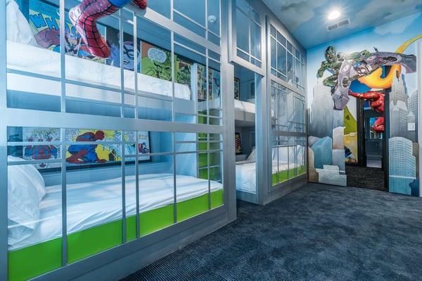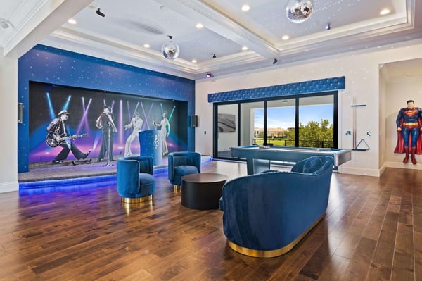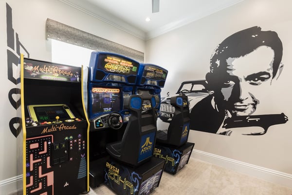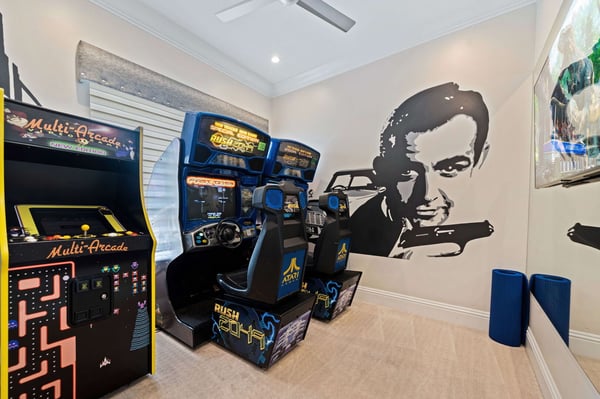Step into modern luxury with this stunning vacation home, where sleek design and high-end amenities create an unforgettable escape. Every inch of this estate is rafted with contemporary elegance, offering a seamless blend of style and comfort. The open living room is a showcase of modern design, featuring a sophisticated palette of champagne and silver tones. Cutting-edge lighting illuminates the space, highlighting the plush, minimalist seating that invites relaxation. Imagine sipping a perfectly crafted martini as you unwind in this chic, serene environment. The state-of-the-art kitchen is a culinary dream, equipped with premium appliances, a spacious refrigerator, a wine cooler, and a stylish breakfast bar with four modern stools. The adjacent dining area, with a sleek table seating 12, is perfect for hosting gourmet meals in an atmosphere of refined elegance. This home is designed for entertainment, surpassing expectations with its array of amenities. The karaoke lounge, outfitted with the latest multimedia technology, is the perfect spot for lively evenings of music and fun. The game room, featuring multi-arcade video games, offers a nod to classic and contemporary gaming, set against a backdrop of sleek decor that honors the legacy of James Bond with subtle sophistication. The centerpiece of the home’s entertainment offerings is the multi-level home theater, an immersive space dedicated to cinematic experiences. The room is a modern marvel, with a replica of Bond’s iconic Aston Martin suspended from the ceiling, setting the stage for epic movie nights. The bedrooms are the epitome of modern luxury, each designed with clean lines and sumptuous materials. King- and Queen-sized beds are set against walls adorned with quilted padding in rich, contemporary fabrics, creating a serene retreat for rest. The en suite bathrooms are masterpieces of modern design, featuring dual sinks, expansive showers, and luxurious soaking tubs. Glamorous, well-lit vanities provide a touch of Hollywood glamour, perfect for preparing for an evening out or simply indulging in a bit of pampering. The second-floor balcony extends the living space outdoors, offering a sleek seating area and a modern foosball table for casual entertainment. For the younger guests, two themed bedrooms offer a modern twist on superhero decor, with custom-designed bunk beds and wall art that brings their favorite heroes to life. The design is both playful and sophisticated, appealing to all ages. The outdoor space is a private oasis of modern luxury, featuring a west-facing pool deck that’s perfect for taking in the breathtaking Florida sunsets. The dual infinity pool and spa are stunningly positioned on the edge of a serene, man-made lake, providing a tranquil setting for relaxation. The patio is an entertainer’s dream, with a modern summer kitchen, a sleek dining table for 10, a chic bar with six stools, a flat-screen TV, and multiple contemporary seating areas. Thoughtfully designed lighting enhances the ambiance for evening gatherings or a peaceful midnight swim under the stars. This estate redefines modern luxury, offering an unparalleled experience that blends sophisticated design with top-tier amenities, all in the heart of your own private paradise.