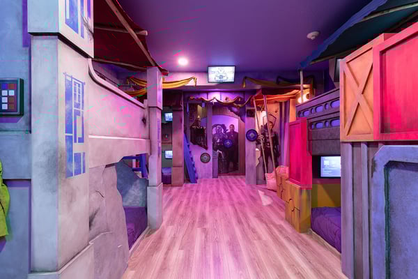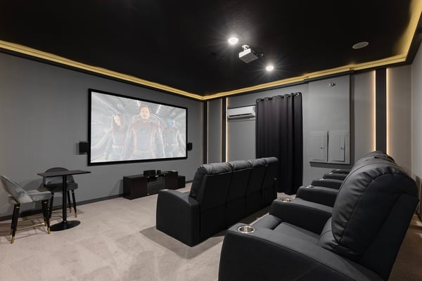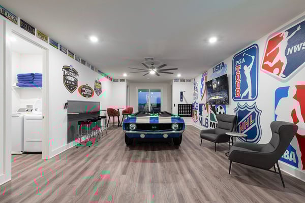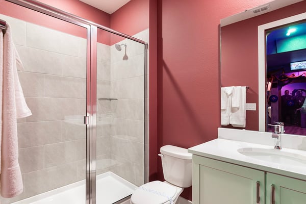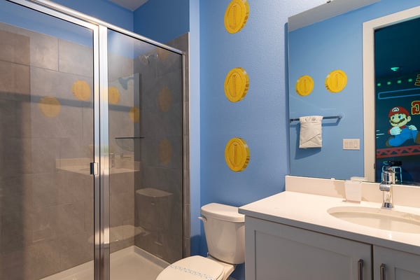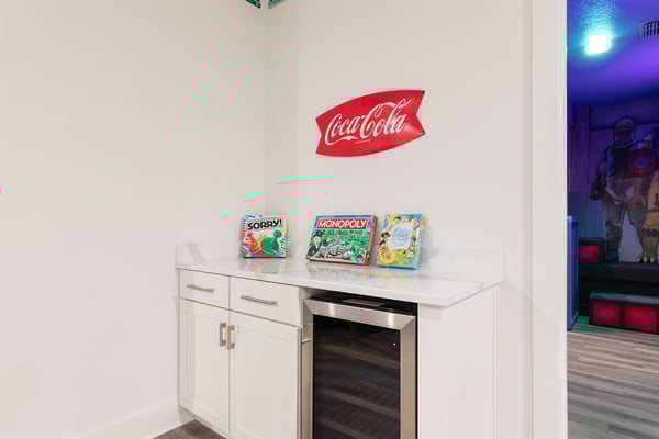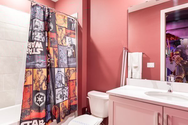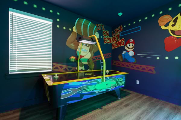 This luxurious home is the perfect haven for your ultimate Orlando vacation, offering everything you and your family need for an unforgettable stay. The expansive open living area serves as the heart of the home, designed for family gatherings and relaxation. With plush seating, including a comfortable sectional and two stylish accent chairs, it's the ideal spot to unwind and share stories from the day’s adventures. The fully equipped gourmet kitchen, featuring a four-seat breakfast bar and dining space that accommodates up to 16 guests, ensures that every meal is a delightful experience, from casual breakfasts to grand dinners. Accommodating up to 24 guests, this home provides spacious and elegantly appointed bedrooms across two floors. The ground floor includes three opulent king-sized suites and a bedroom with two full-sized beds, complete with a private connecting bathroom. On the second floor, you’ll discover three additional king-sized suites, as well as two galactic-themed bedrooms that ignite the imagination. One room offers two sets of bunk beds (four twin-sized beds) with a connecting bathroom, while the other features three sets of bunk beds (six twin-sized beds) and a connecting bathroom, creating a truly immersive experience for younger guests. Outside, the private outdoor deck invites you to bask in Florida’s glorious sunshine. A shimmering swimming pool and spillover spa provide the perfect retreat, while the fire pit offers a cozy setting for roasting s’mores under the stars. The BBQ area is fully equipped for all your grilling needs, making outdoor dining an absolute pleasure. Entertainment abounds in this home, with a video game-themed games room that includes an air hockey table and classic arcade games. The upper-floor loft area, equipped with a pool table and video game console, offers hours of friendly competition. When it’s time to relax, the home theater provides a cinematic experience with a large projection screen and plush theater-style seating, perfect for binge-watching your favorite movies in ultimate comfort.