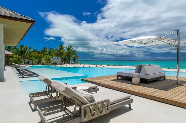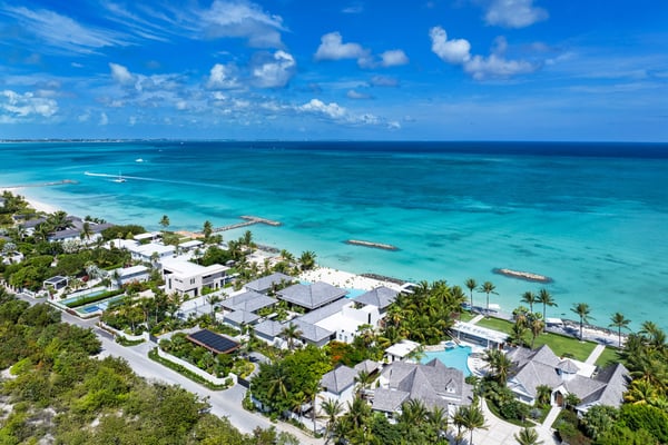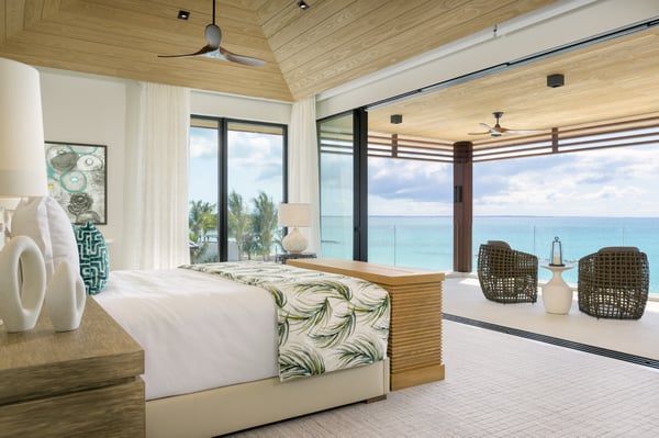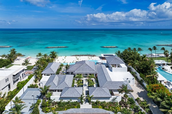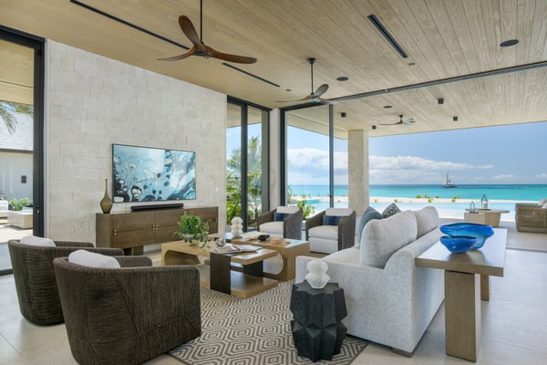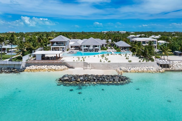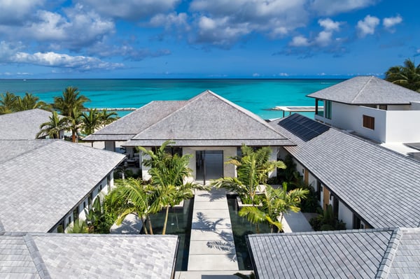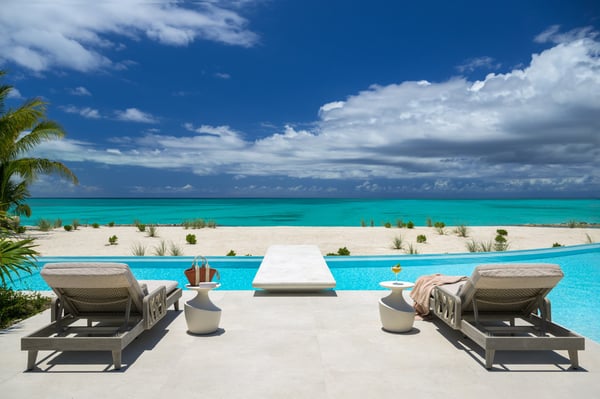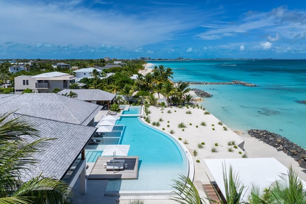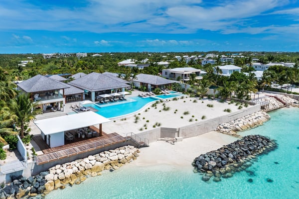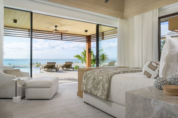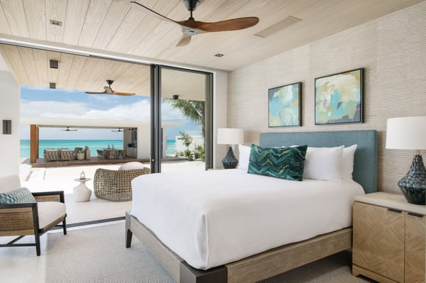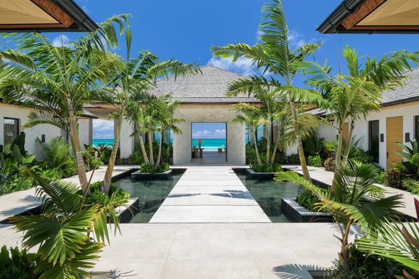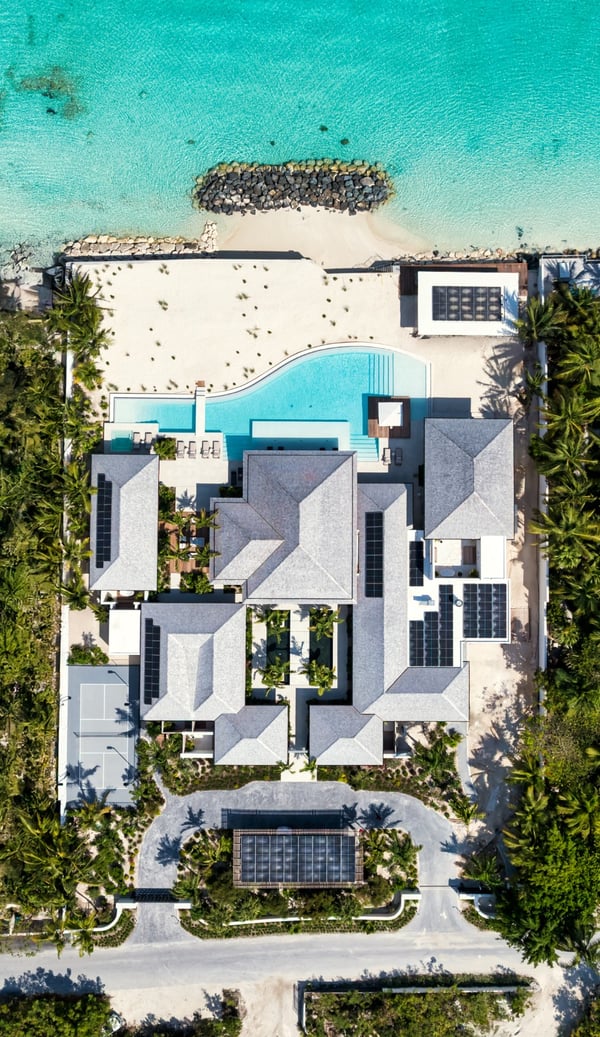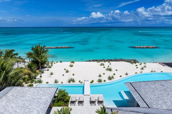 Designed around a palm- and pond-filled courtyard, offering ocean views from every bedroom, this property is the epitome of understated glamour. With a prime beachfront position, an abundance of space indoors and out, and the perfect balance of privacy and connection, Footprints is ideal for sophisticated group getaways. Composed of multiple buildings – including the main house, a standalone Principal bedroom, a self-contained two-bedroom guesthouse, and two further independent bedrooms accessed from the courtyard – this property offers grand proportions and luxe amenities throughout. Set a few feet above the white sands of Grace Bay, the expansive pool terrace remains out of sight of beachgoers, while steps provide easy access to the ocean. The extra-large perimeter overflow pool – with a tanning ledge, hot tub, and space to swim laps – is the centre of the action during the day, with indulgent day beds, covered seating areas, and a cabana providing a welcome retreat from the tropical sun. Meanwhile, the outdoor living area, firepit, floodlit pickleball, and half-basketball court come into their own after dark. High ceilings, large windows, and muted, earthy colour palettes throughout embrace the beachfront location, while the rich textures, premium materials, and unique artworks create a cocoon of quiet luxury. The main gathering area is an exquisitely decorated space that opens directly onto the pool terrace and houses a modern kitchen, bar, dining space for parties of 16, and a relaxed seating area. Complementing this is a media room, a separate, commercial-grade kitchen where a professional chef whips up culinary masterpieces, and a covered, alfresco dining space. Meticulously designed so that every bedroom offers perfectly-framed ocean vistas, all are restful retreats, furnished with king-size beds and extra-deep mattresses, automated blinds and drapes, and indoor and outdoor showers. Some suites feature private terraces, extravagant outdoor baths, and coffee stations. Elevating the experience further still is a fully-equipped gym and a spa treatment room with massage and hair salon facilities.