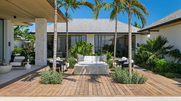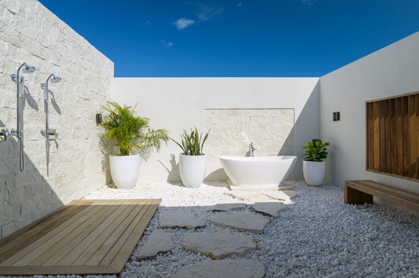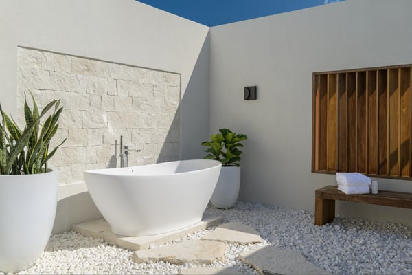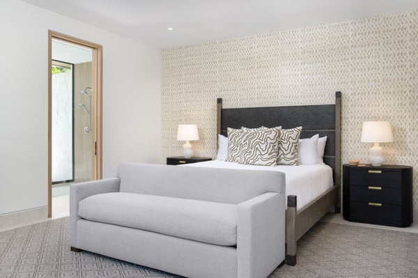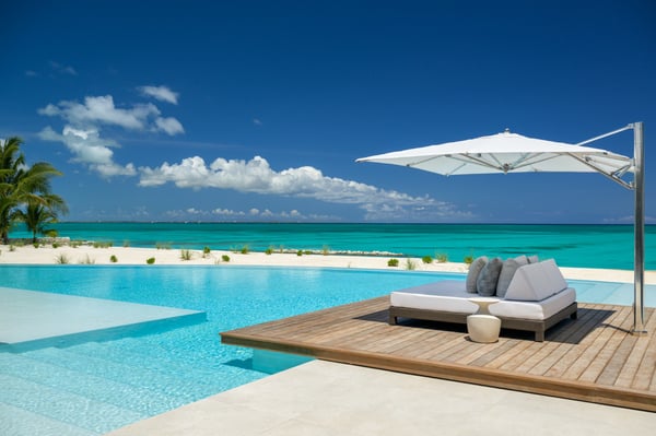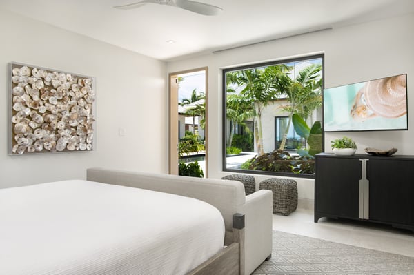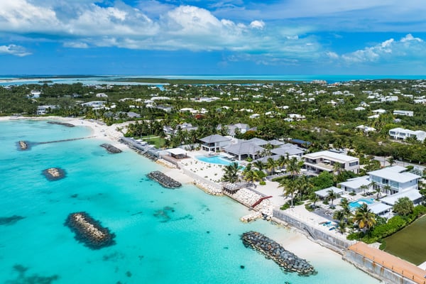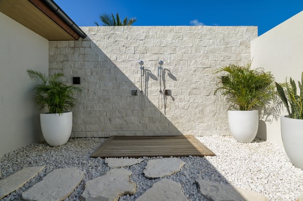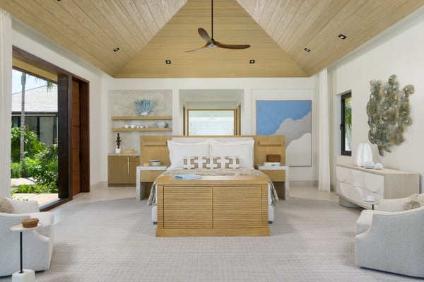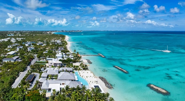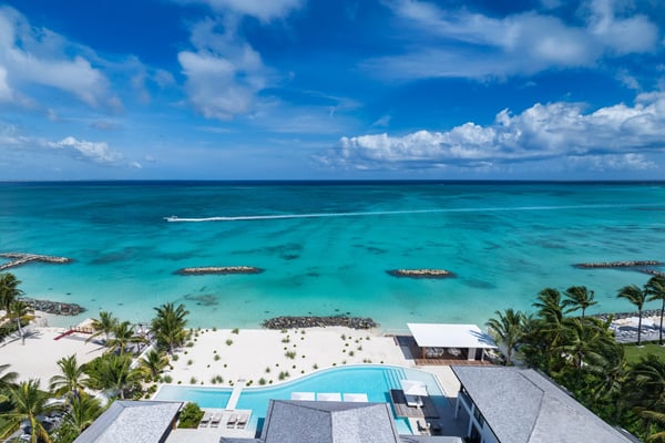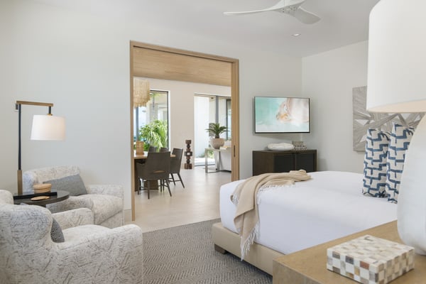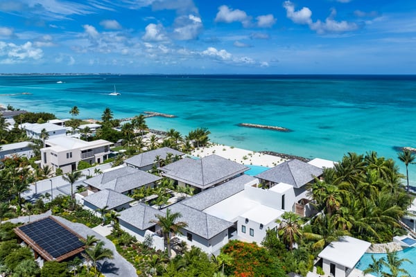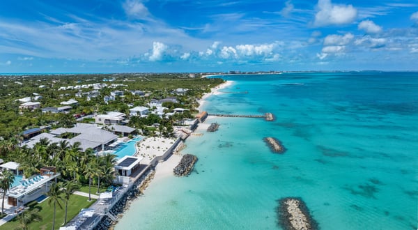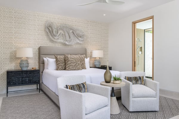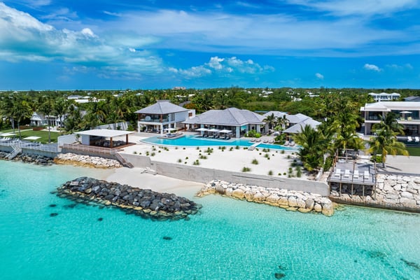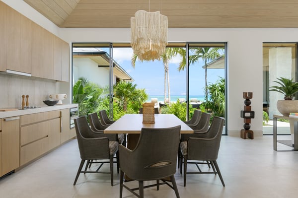 Designed around a palm- and pond-filled courtyard, offering ocean views from every bedroom, this property is the epitome of understated glamour. With a prime beachfront position, an abundance of space indoors and out, and the perfect balance of privacy and connection, Footprints is ideal for sophisticated group getaways. Composed of multiple buildings – including the main house, a standalone Principal bedroom, a self-contained two-bedroom guesthouse, and two further independent bedrooms accessed from the courtyard – this property offers grand proportions and luxe amenities throughout. Set a few feet above the white sands of Grace Bay, the expansive pool terrace remains out of sight of beachgoers, while steps provide easy access to the ocean. The extra-large perimeter overflow pool – with a tanning ledge, hot tub, and space to swim laps – is the centre of the action during the day, with indulgent day beds, covered seating areas, and a cabana providing a welcome retreat from the tropical sun. Meanwhile, the outdoor living area, firepit, floodlit pickleball, and half-basketball court come into their own after dark. High ceilings, large windows, and muted, earthy colour palettes throughout embrace the beachfront location, while the rich textures, premium materials, and unique artworks create a cocoon of quiet luxury. The main gathering area is an exquisitely decorated space that opens directly onto the pool terrace and houses a modern kitchen, bar, dining space for parties of 16, and a relaxed seating area. Complementing this is a media room, a separate, commercial-grade kitchen where a professional chef whips up culinary masterpieces, and a covered, alfresco dining space. Meticulously designed so that every bedroom offers perfectly-framed ocean vistas, all are restful retreats, furnished with king-size beds and extra-deep mattresses, automated blinds and drapes, and indoor and outdoor showers. Some suites feature private terraces, extravagant outdoor baths, and coffee stations. Elevating the experience further still is a fully-equipped gym and a spa treatment room with massage and hair salon facilities.