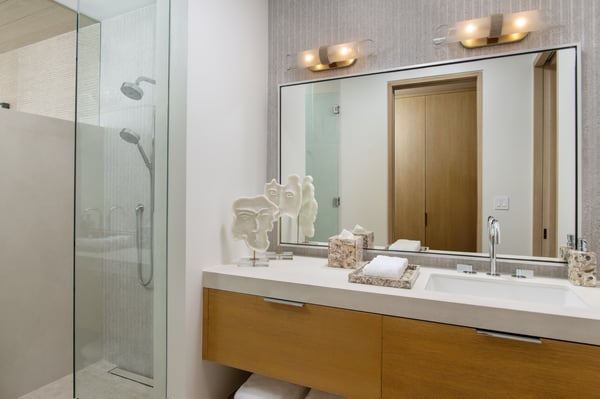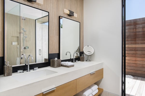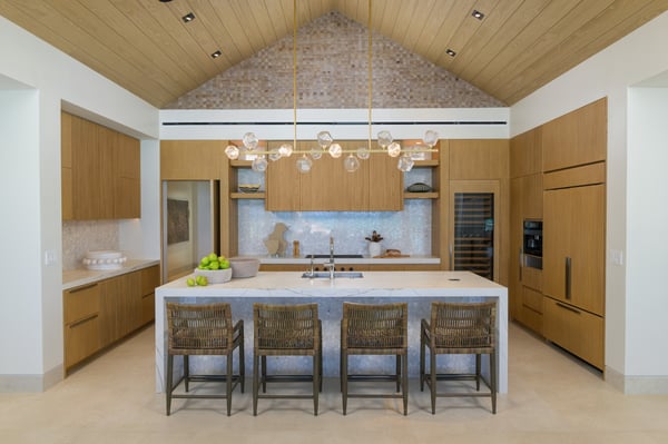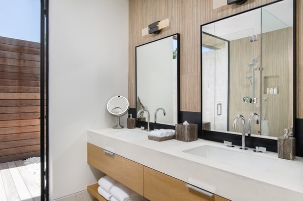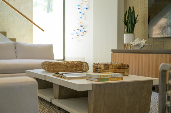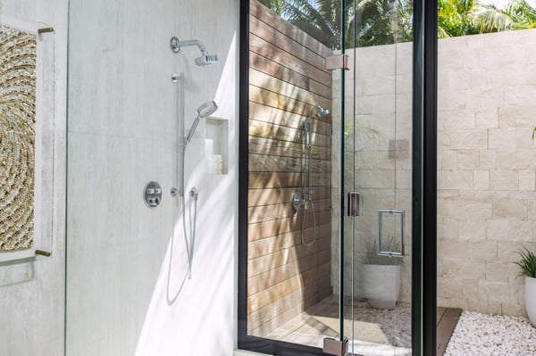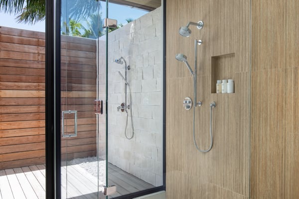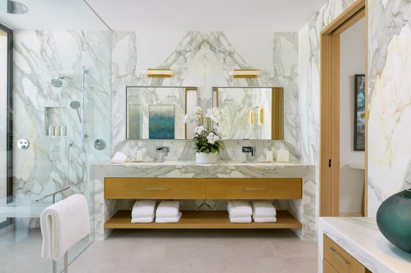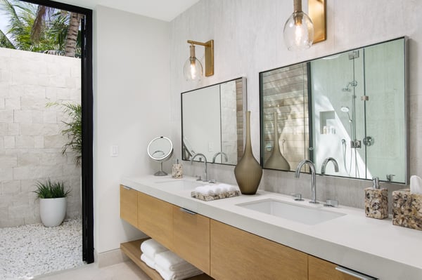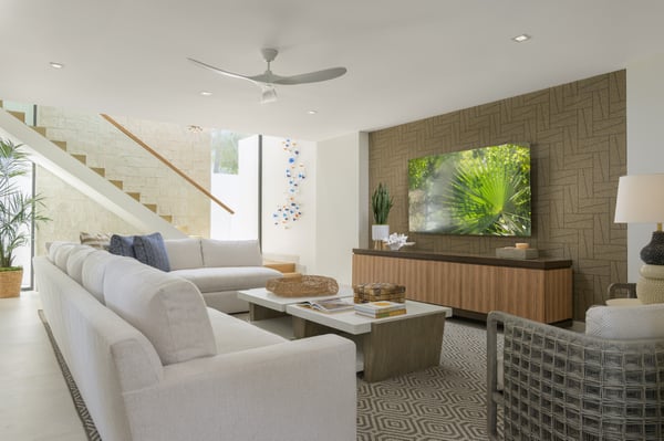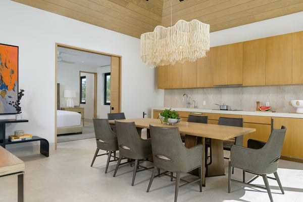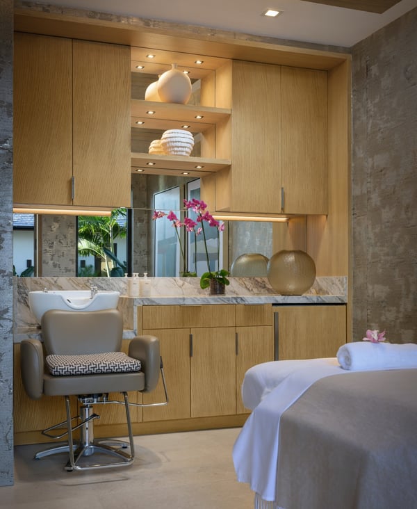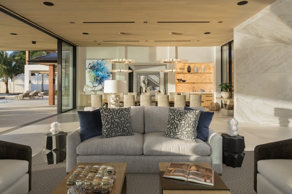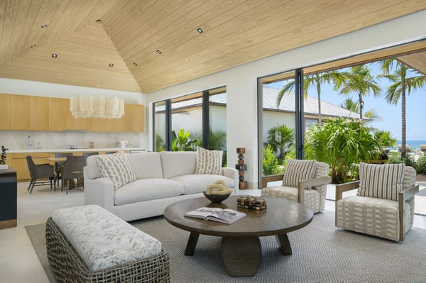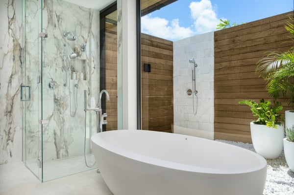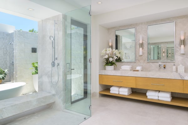 Designed around a palm- and pond-filled courtyard, offering ocean views from every bedroom, this property is the epitome of understated glamour. With a prime beachfront position, an abundance of space indoors and out, and the perfect balance of privacy and connection, Footprints is ideal for sophisticated group getaways. Composed of multiple buildings – including the main house, a standalone Principal bedroom, a self-contained two-bedroom guesthouse, and two further independent bedrooms accessed from the courtyard – this property offers grand proportions and luxe amenities throughout. Set a few feet above the white sands of Grace Bay, the expansive pool terrace remains out of sight of beachgoers, while steps provide easy access to the ocean. The extra-large perimeter overflow pool – with a tanning ledge, hot tub, and space to swim laps – is the centre of the action during the day, with indulgent day beds, covered seating areas, and a cabana providing a welcome retreat from the tropical sun. Meanwhile, the outdoor living area, firepit, floodlit pickleball, and half-basketball court come into their own after dark. High ceilings, large windows, and muted, earthy colour palettes throughout embrace the beachfront location, while the rich textures, premium materials, and unique artworks create a cocoon of quiet luxury. The main gathering area is an exquisitely decorated space that opens directly onto the pool terrace and houses a modern kitchen, bar, dining space for parties of 16, and a relaxed seating area. Complementing this is a media room, a separate, commercial-grade kitchen where a professional chef whips up culinary masterpieces, and a covered, alfresco dining space. Meticulously designed so that every bedroom offers perfectly-framed ocean vistas, all are restful retreats, furnished with king-size beds and extra-deep mattresses, automated blinds and drapes, and indoor and outdoor showers. Some suites feature private terraces, extravagant outdoor baths, and coffee stations. Elevating the experience further still is a fully-equipped gym and a spa treatment room with massage and hair salon facilities.