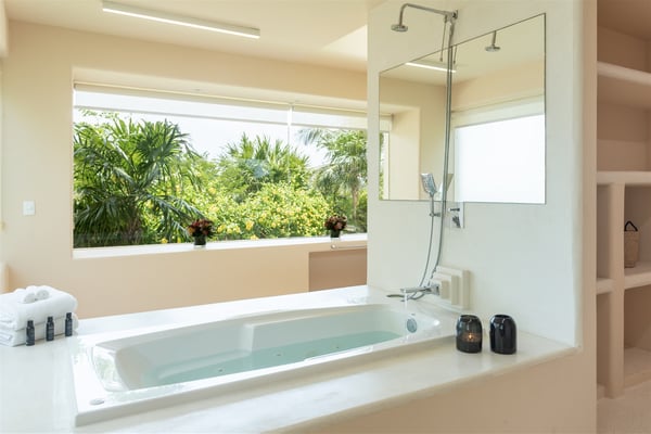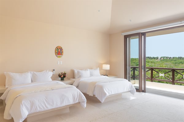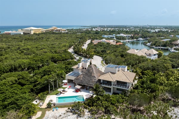 Nestled in the tranquil Caleta area of Puerto Aventuras, Casa Cangrejo Feliz is a beautiful zen-style villa that offers the perfect blend of modern comfort and serene, natural beauty. This spacious open-plan home is designed to seamlessly integrate with its surroundings, offering stunning views and plenty of light-filled spaces. With its soothing atmosphere and sleek, minimalist aesthetic. Located on the shores of Puerto Aventuras Caleta with the Mayan Ruin Chac Hal Al, you are a short distance by car from Central Park, with it’s wonderful nature trails, outdoor gym and restaurants. The Puerto Aventuras Marina has boutiques, restaurants, aquatic activities and more. Playa del Carmen with it’s iconic 5th Avenue is 15 minutes by car. Akumal is 15 minutes south and Tulum Beach is 30 minutes away. Casa Cangrejo Feliz’s 5 bedrooms with en-suite bathroom offer ample space for 16 guests. The villa interior is tastefully decorated with a zen style combining indoor and outdoor living, creating a sooth ambiance that welcomes you from the moment you step inside. The villa is equipped with all the amenities you need for a comfortable stay, including WIFI, Smart TVs, gourmet kitchen, large indoor dining table, The villa features elegant open living spaces, expansive terraces, and a private pool, perfect for unwinding in style. Whether you’re enjoying a quiet evening on the patio or basking in the sun by the pool, the home’s tranquil setting promises a truly rejuvenating experience. Casa Cangrejo Feliz’s direct access to the Caleta is a peaceful retreat that is ideal for those seeking relaxation, privacy, and luxury.