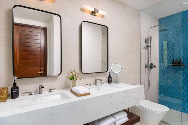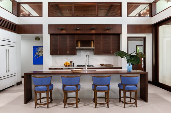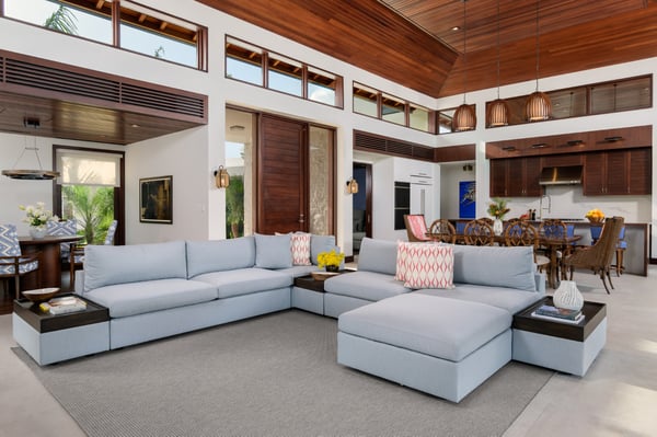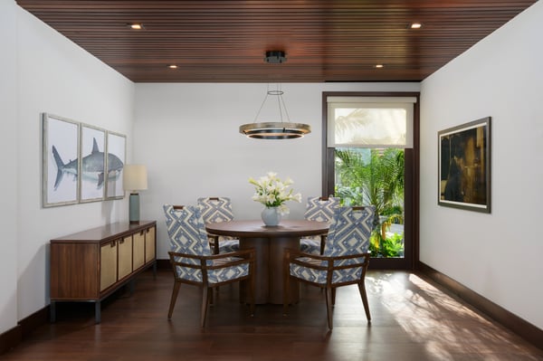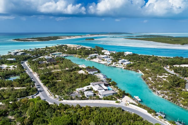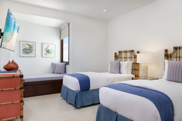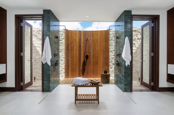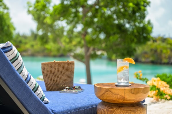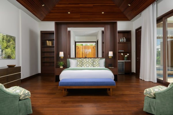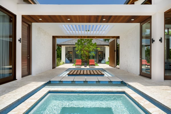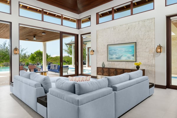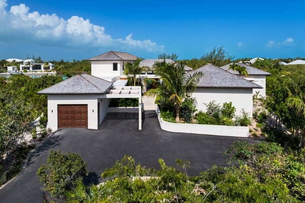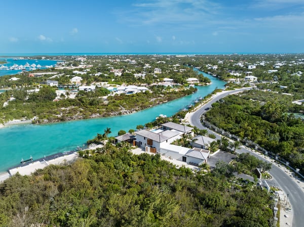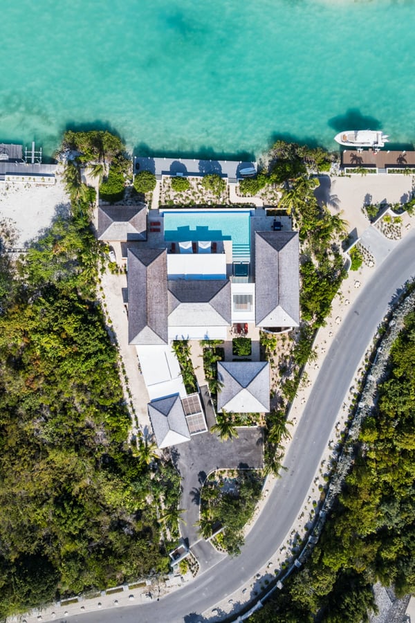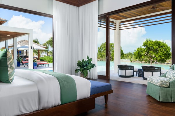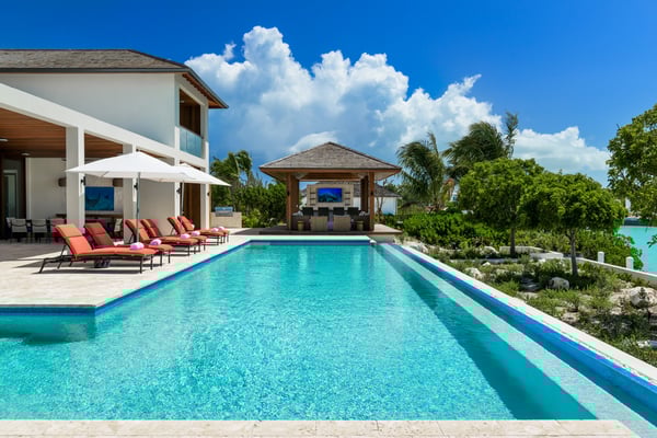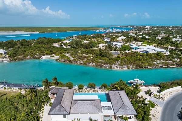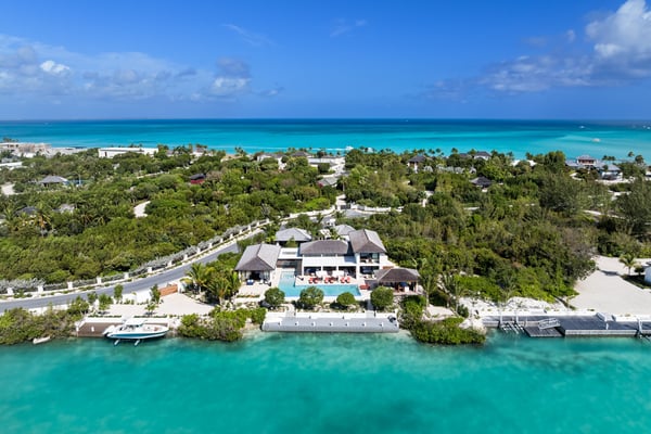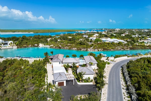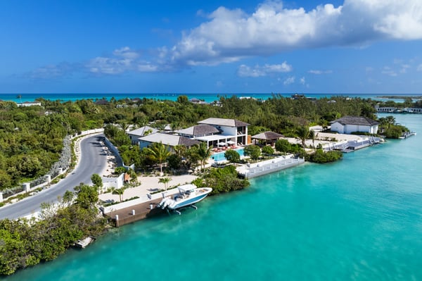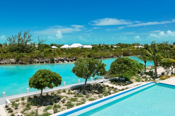 A vibrantly decorated canal-front property with a large pool and private dock, Sundance is the essence of fun under a tropical sun. Tucked away in the prestigious neighbourhood of Leeward, this newly built six-bedroom villa was designed for carefree days, relaxed outdoor living and easy access to water sports. Blending architectural elegance with seamless outdoor living, the well-considered layout is ideal for families, friends and multi-generational groups. The heart of the property is the stunning outdoor space overlooking the tranquil blue waters of the Leeward canals. Here, a large L-shaped pool wraps around two sides of the property, with space for swimming laps, relaxing in the hot tub and sipping cocktails in the shaded shallow section. A separate pavilion housing an outdoor kitchen, barbecue and comfortable seating area makes cooking casual meals a breeze, while a covered deck adjacent to the great room ensures ample space to spread out and dine looking out over the water. Beyond the pool deck, a private dock enables guests to paddle out on kayaks and SUPs, be picked up for boat charters, or launch jet skis directly from the property. Pitched ceilings, natural wood floors and ceilings, and colourful fabrics create an inviting ambience that captures the warmth of the Caribbean. Six-bedroom suites are spread across various buildings, ensuring privacy for all. The main house features three suites (two kings, one twin) over two floors, with two more independent king-size suites beyond the shallow pool, and a generous canal-view primary suite situated in an independent building, with a private terrace and spacious indoor-outdoor bathroom. An expansive great room, with a kitchen, dining and seating area plus a games den, all open directly onto the pool deck, providing effortless indoor-outdoor living, while a well-equipped gym ensures fitness routines need not be interrupted.
