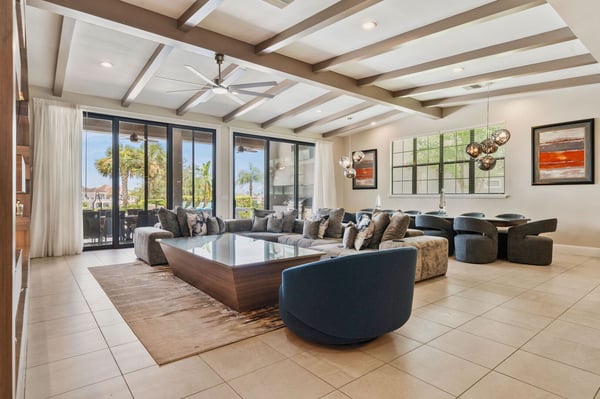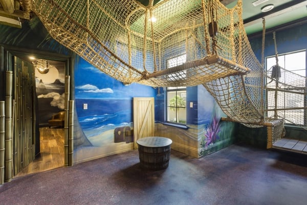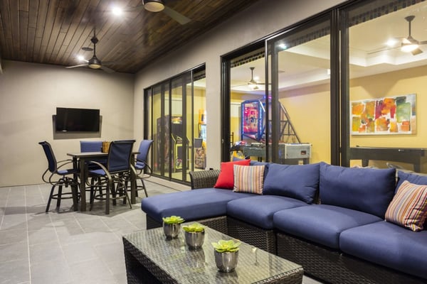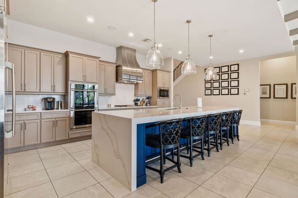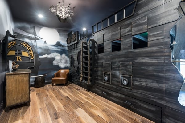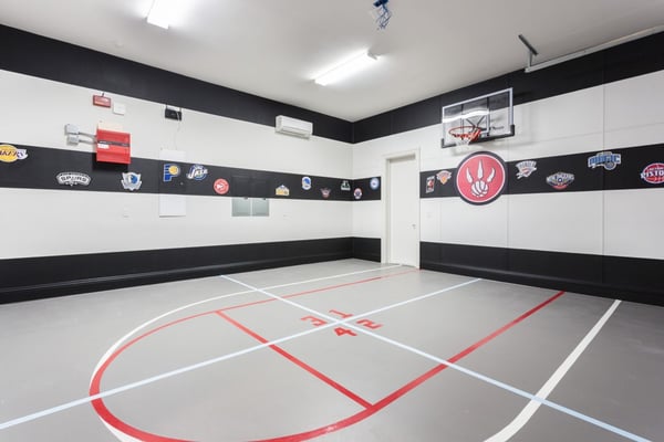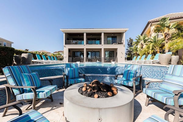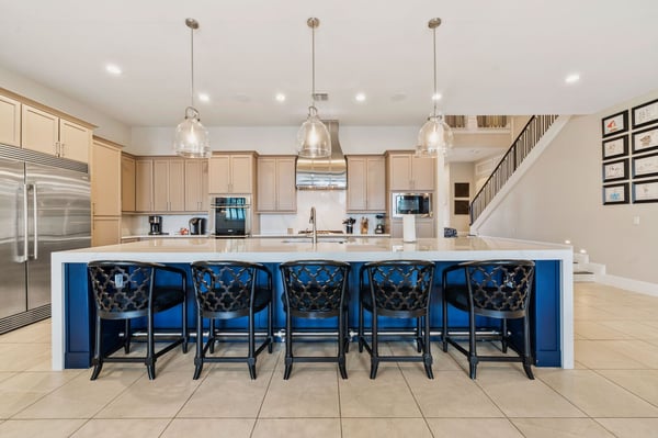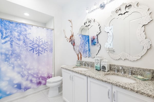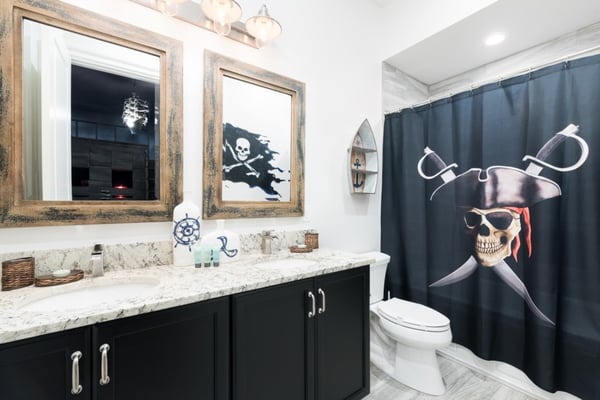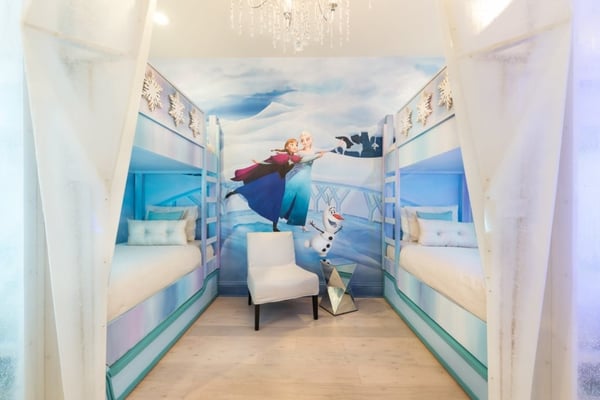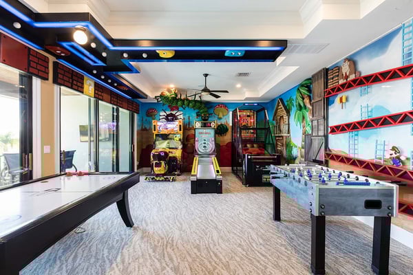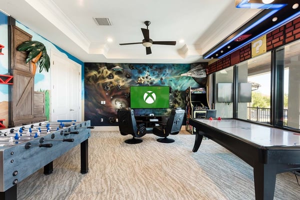 From the entranceway to every corner of the house, this exquisitely designed blend of Contemporary and French Country style creates the perfect paradise for the entire family to enjoy time together. The main living area features two plush L-shaped couches and a large flat-screen TV, ideal for cozy family movie nights. The adjacent open kitchen is a chef’s paradise, beautifully appointed with exquisite tile and granite, innovative lighting, top-of-the-line stainless steel appliances, rich wood cabinetry, an enormous fridge, and a five-seat breakfast bar. For more formal dining, the 16-seat table is perfect for those lively, memorable meals together. For movie lovers, the home theatre is a true sanctuary, with 12 luxurious leather chairs and a grand projection screen, complete with elegant curtains for a cinematic experience. Kids will find their own kind of magic with an interactive treasure hunt, following hidden clues inside and outside the property for endless adventure. The fun doesn’t stop there: younger kids will be captivated by the pirate-themed playroom, featuring a rope bridge and slide, while older guests can enjoy the spacious game loft, equipped with various arcade games, skeeball, basketball, and football and hockey tables. For those who like to stay active, the in-home basketball court is ready for some serious competition When it’s time to cool off, the stunning outdoor pool and spa await, offering the perfect spot for swimming and sunbathing. Surrounding the pool, you’ll find several comfortable seating areas, a large summer kitchen with a flat-screen TV, and best of all, an entire game and recreation lawn adjacent to the property, complete with a putting green. As night falls, the glow of the fire pit, combined with the exquisite mood lighting and the breathtaking Florida sky, creates a magical ambiance. Bedtime is a luxurious affair in the home’s beautifully designed bedrooms, each with en suite bathrooms featuring enormous tiled showers, dual vanities and sinks, and eye-catching soaking tubs that are perfect for melting away any stress. Your children may find bedtime a bit too exciting in two of the most extraordinary themed bedrooms. One room features a pirate ship that doubles as a quartet of bunk beds, while another offers an icy retreat with four more bunks draped in sheer white curtains, beneath a chandelier that sparkles like luxe icicles. Both rooms have en suite baths that carry through the playful themes, making bath time an adventurous delight. This luxurious retreat offers everything you need for an unforgettable vacation, where every moment is designed to indulge, entertain, and create lasting memories.