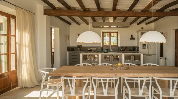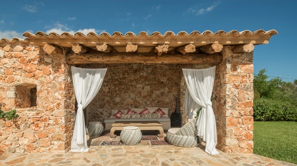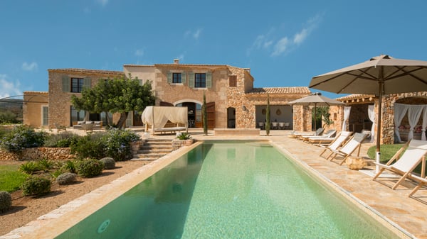 This stunning five-bedroom villa seamlessly blends bohemian flair with rustic elegance. Traditional Mallorcan stonework, exposed wooden beams, and terracotta tiles exude authentic charm, while tree-trunk tables, driftwood chairs, and artistic touches add a playful, modern twist. Set amidst manicured lawns, ancient olive trees, and fragrant gardens, the villa is a private sanctuary in southeast Mallorca’s scenic countryside. Just minutes from the breathtaking Mondragó Nature Reserve and its pristine beaches, the location is perfect for exploring or unwinding. The five serene bedrooms combine neutral tones with natural textures like jute rugs and wicker lampshades. The primary suite boasts a king-size bed, a luxurious ensuite with a freestanding tub, and a walk-in shower. Each bedroom has its own bathroom, with a pergola-accessible ground-floor room and a cozy bunk room for kids. A shimmering infinity pool, cushioned loungers, a canopied Bali bed, and a bubbling hot tub ensure ultimate relaxation. For a touch of fun, enjoy the bocce ball court or relax in the shaded stone pool hut. A chic country-style kitchen offers everything needed to create your own meals, complemented by an outdoor summer kitchen with a wood-fired barbecue. The semi-outdoor dining area is perfect for leisurely meals under the Mediterranean sun. For dining out, explore nearby villages or the vibrant Cala d’Or resort. Discover the perfect balance of tranquility and indulgence in this enchanting villa. License Number: ETV/12182