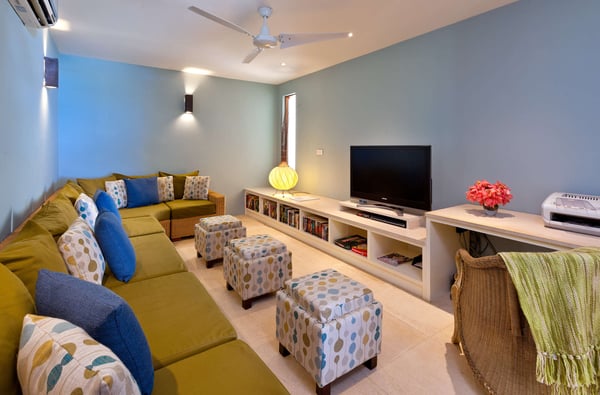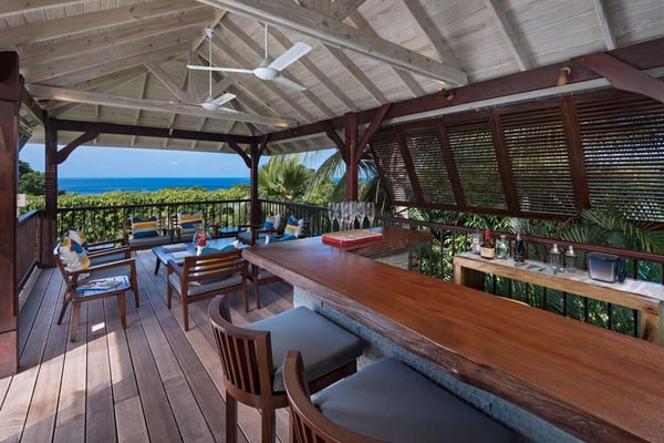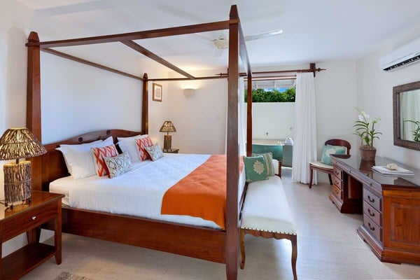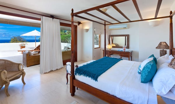Tom Tom is a well-appointed five-bedroom luxury vacation rental located in Westmoreland St. James, overlooking the exclusive West Coast of Barbados. The large wooden front door of the villa leads to an exquisite interior of natural coral stone walls and wooden floors, furnished with beautiful custom-made furniture imported directly from Indonesia and Bali with Caribbean influences. The spacious formal living room features handmade Balinese stone carvings and opens up to an outdoor terrace complete with a large infinity-edge pool and uninterrupted views of the Caribbean Sea. When lit up at night, Tom Tom's pool deck transforms into a magical private setting, perfect for an evening of cocktails, a midnight swim, or stargazing. The open-plan, well-equipped kitchen flows through to the dining area situated on the terrace and offers alfresco dining with wonderful views. There is also a barbeque grill on the terrace for more casual culinary moments! The master bedroom is upstairs and has floor-to-ceiling windows, providing stunning views of the Caribbean Sea and Barbados' West Coast. Four of the luxurious bedrooms are on the ground floor; all offer privacy and relaxation with high degrees of comfort and spaciousness. Two of the suites feature four-poster beds and their own outdoor tub in a tropical courtyard that creates a spa-like atmosphere. The fifth suite has a courtyard and twin beds. Hidden away from the main living area is the cosy media room, where you can curl up with a good book or watch your favourite movie in air-conditioned comfort.
