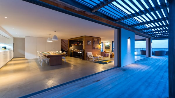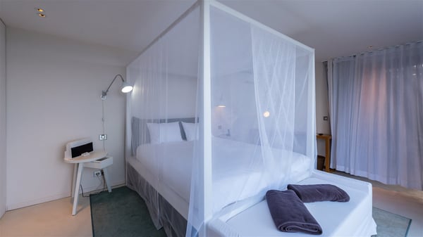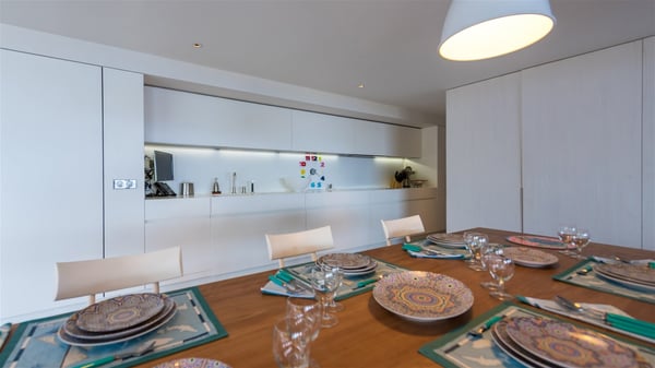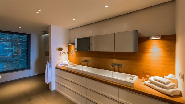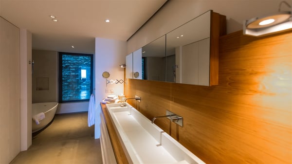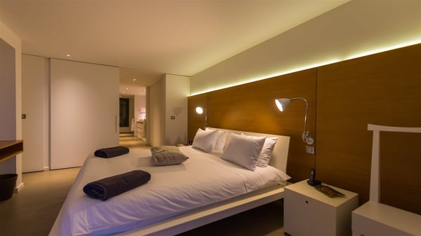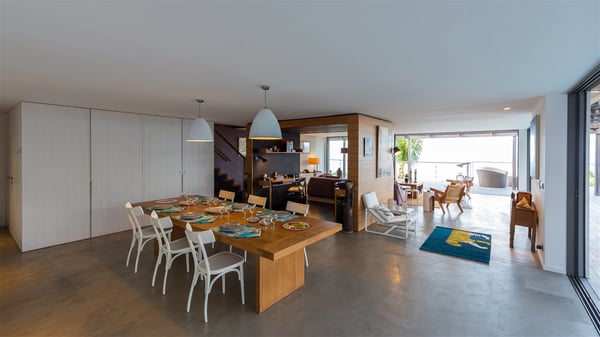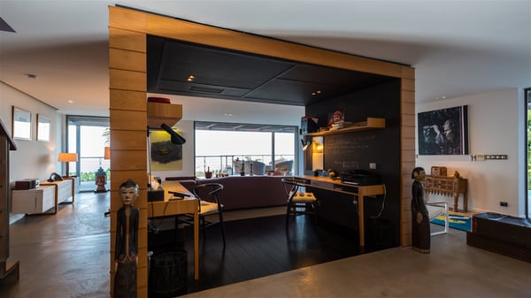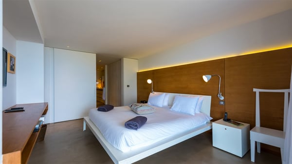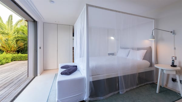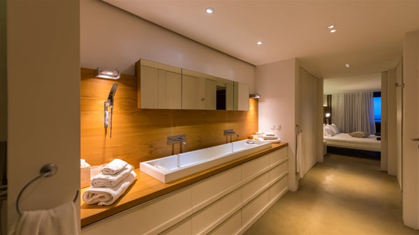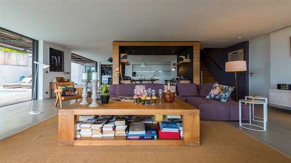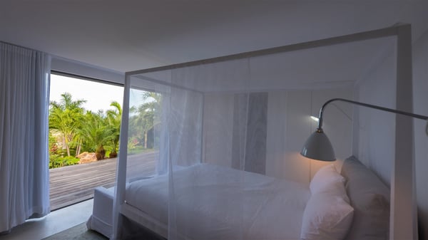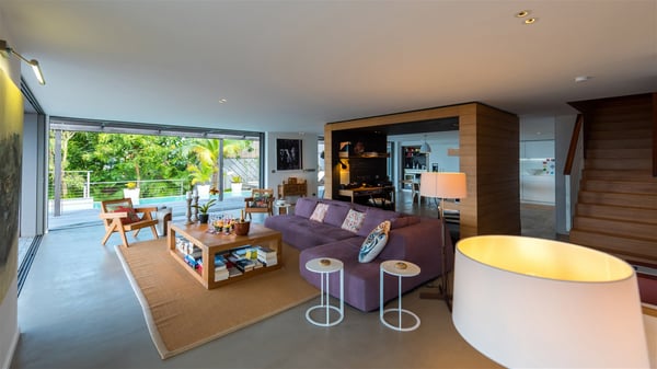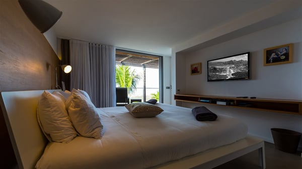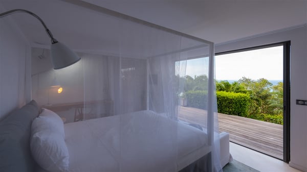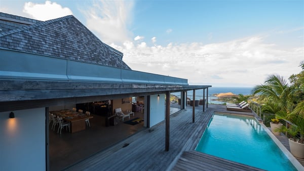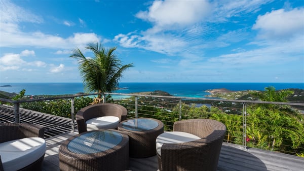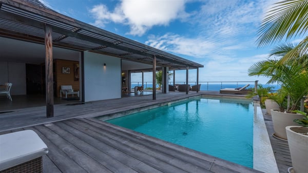 Looking out from a hillside in Vitet, the luxurious vacation rental property Casa Tigre opens onto a wide vista over the clear waters of the Atlantic Ocean, the Caribbean Sea, and the bay of Grand-Cul-de-Sac. This cozy four-bedroom home is the ideal spot for a family or friends travelling together to St-Barths. Silky materials and modern furnishings make this vacation home a true haven of peace, combining tradition and refined modernity. Hidden from the road, this beautiful vacation villa in St-Barths is built in a local architectural style on several levels, with perfect privacy for all. On the main level there is a large air-conditioned living room with shimmering colours and soft sofas. A semi-enclosed office space separates the spacious living area from the dining room, which welcomes you and your guests around its rectangular wooden table near the well-equipped kitchen. All this great room is air-conditioned and can be closed by the large glass windows but you can also enjoy the open airy atmosphere with the cool St-Barths breezes. On the expansive terrace, guests enjoy a panoramic view over the ocean, next to the heated infinity swimming pool. Facing the wonderful St-Barths sunsets, the terrace is the very perfect place for a drink in the outdoor lounge, or on the deck chairs. The luxurious villa Casa Tigre offers the most comfortable settings for a large family or a vacation with friends. The villa has just been completely renovated and expanded to a total of four air-conditioned luxury suites with ocean views. All are located on different floors in order to ensure privacy and enjoy the quiet surroundings. Two equivalent bedrooms are located on the upper floor of the villa, while the master bedroom overlooks the outdoor terrace from the main level. The fourth bedroom is on the lower floor; it is an independent apartment with a fully-equipped kitchen, a living area and a bedroom opening onto the panoramic view. On the same level, there is an air-conditioned room equipped to enjoy a movie at night on the big screen, equipped with french or American satellite networks.