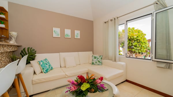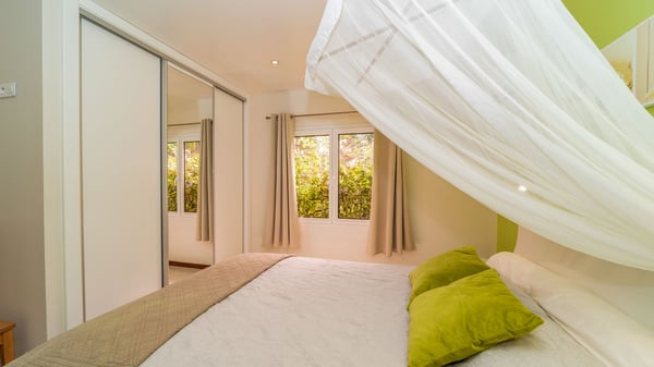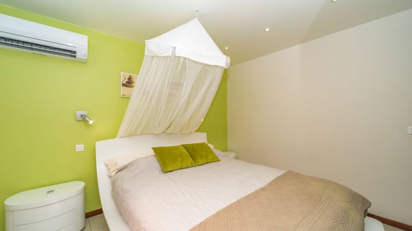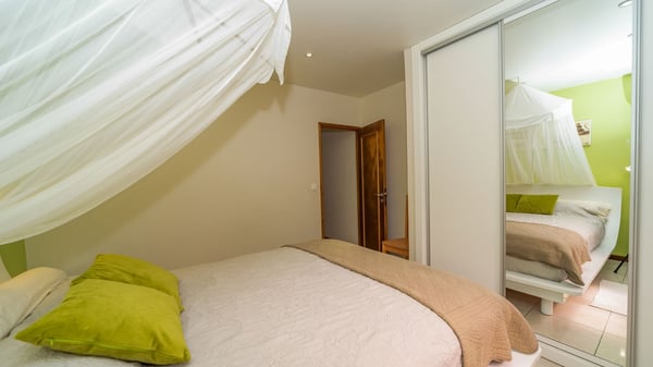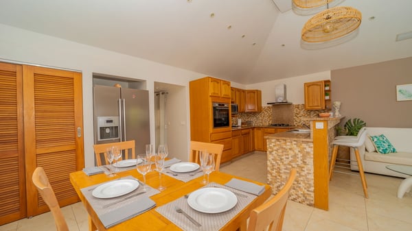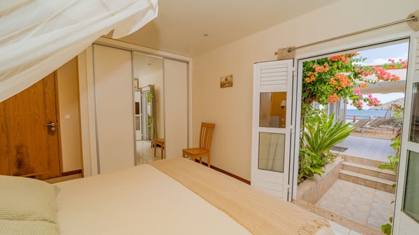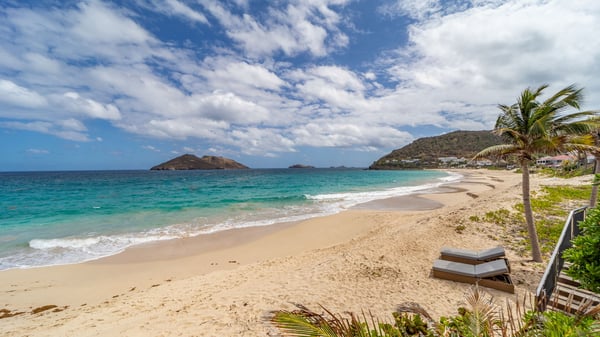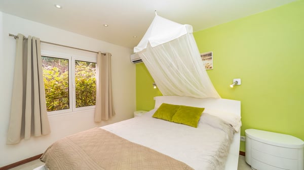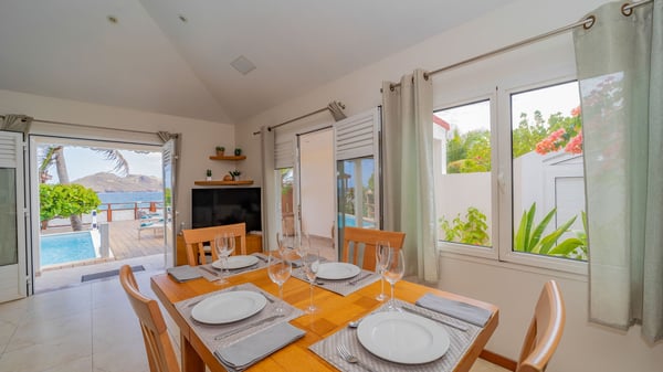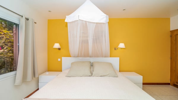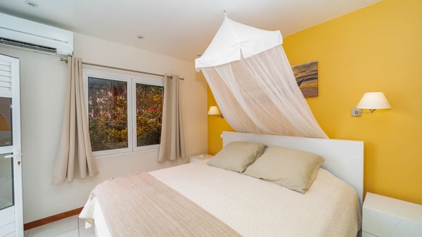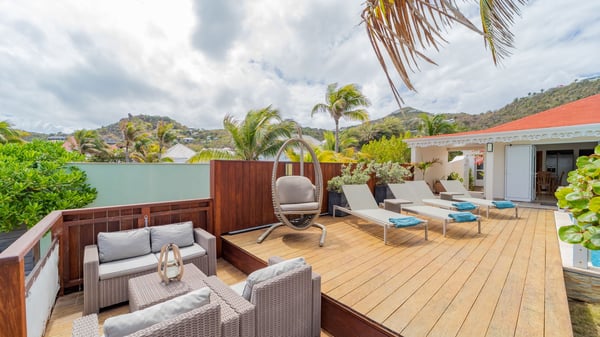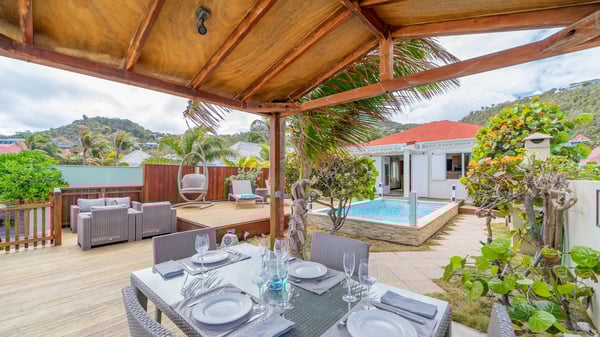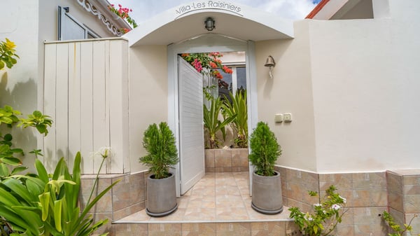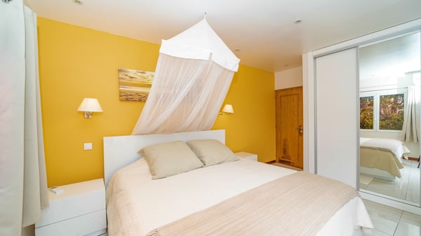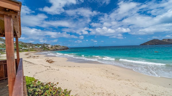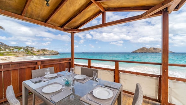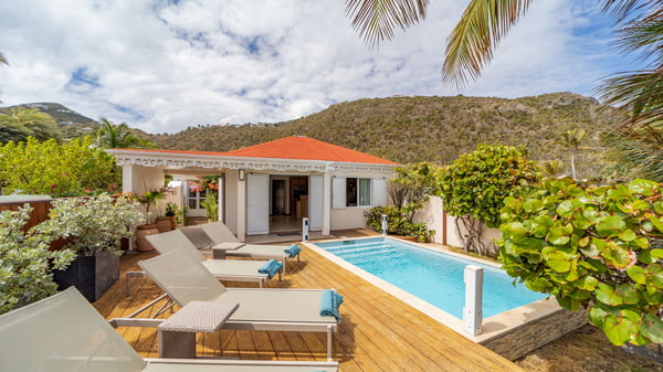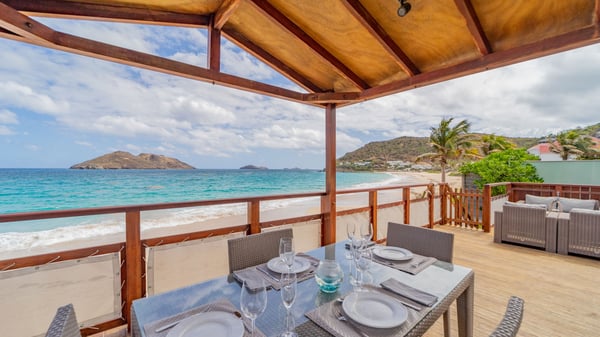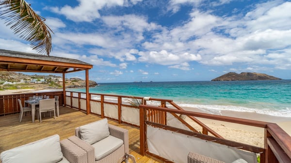 The vacation rental Les Raisiniers is a charming Caribbean-style property ideally located on Flamands beach in a heavenly atmosphere. With its two bedrooms, sparkling swimming pool and wide spaces, villa Les Raisiniers is the perfect place for two couples travelling together for a fantastic vacation in St-Barths. Built on one level, the beachfront villa Les Raisiniers welcomes guests in a charming environment. The spacious living room features a sitting area with a bright natural light through the large window, a comfy dining area for four people and a fully-equipped wooden kitchen with a breakfast bar. The vaulted ceiling creates a pleasant sense of volume, as the ocean view draws an idyllic background in this cozy space. At the front of villa Les Raisiniers, the terrace features many charming areas to either have a rest, swim or chat while watching the stunning ocean view. In the center, the swimming pool shines under the Caribbean sun, the perfect place to relax in the gentle trade winds. Facing the ocean, there are deck chairs and an outdoor lounge made of woven fibres with a fine sofa and armchairs covered with cushions. As an idyllic scenery under the gazebo, you’ll find the al fresco dining room with a view over the deep-blue ocean. There are also local shrubs on this charming deck made of light wood. What’s more, a wooden staircase leads directly to Flamands beach, where you’ll love walking along the beach and breathing in the salty sea wind. Villa Les Raisiniers consists of two air-conditioned bedrooms with en-suite bathrooms. Both have king-size beds and light curtains in a peaceful atmosphere. One of them leads to the ocean view terrace after a few steps, and the second one opens onto a relaxing view over the property's lush garden. The soothing yellow tones provide a delightful quiet feeling that you'll enjoy after days exploring the many hidden treasures of St-Barths’ island. Built on the fantastic Flamands Beach, the beachfront holiday rental Les Raisiniers welcomes two couples looking for a romantic getaway in St-Barths.