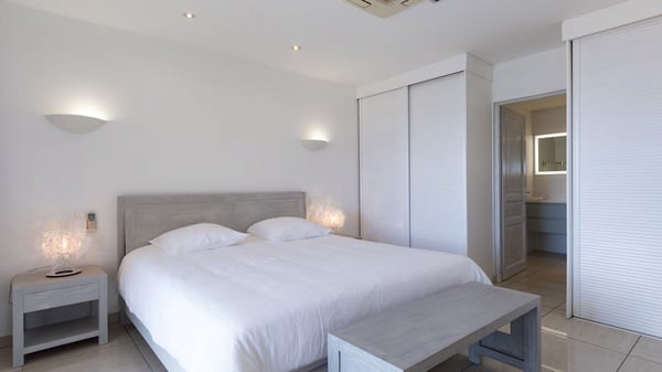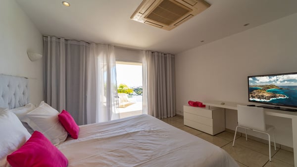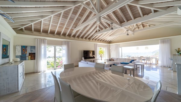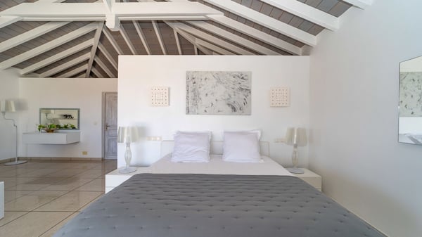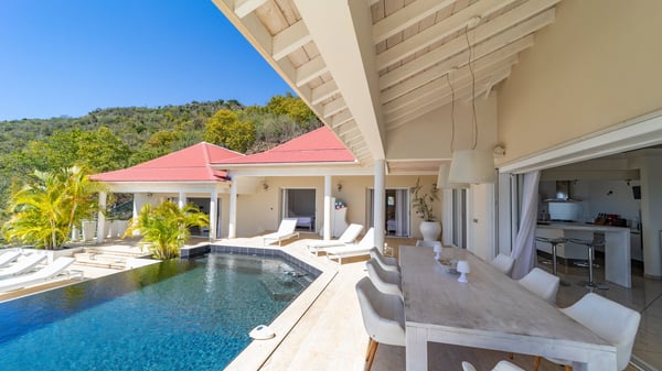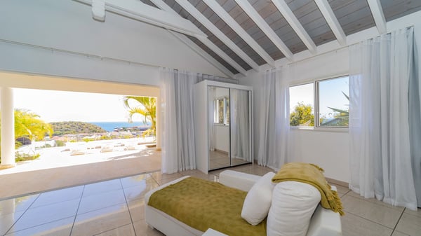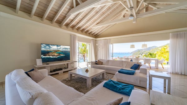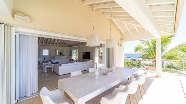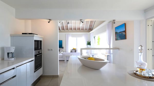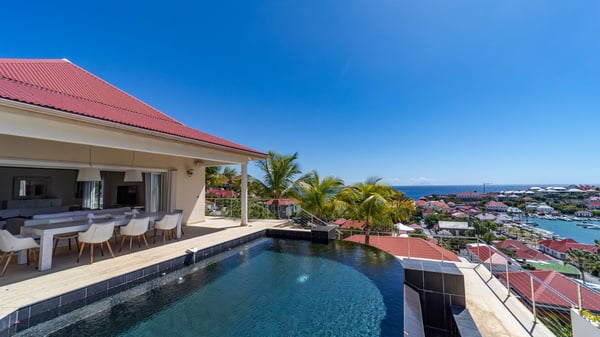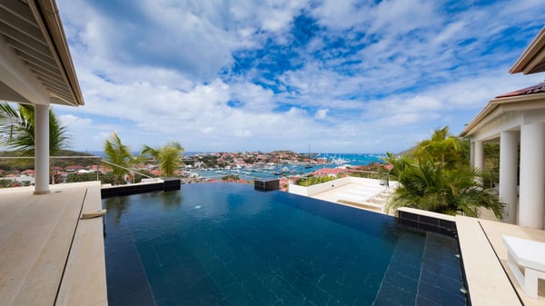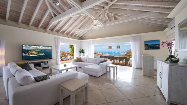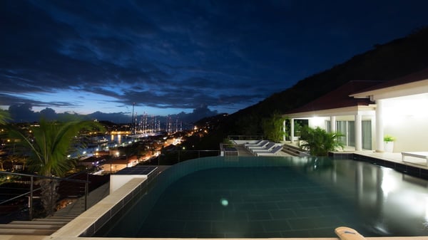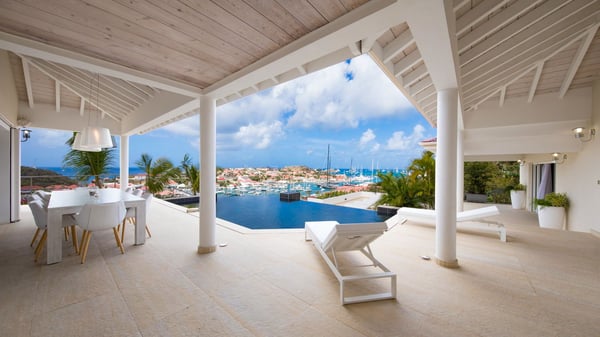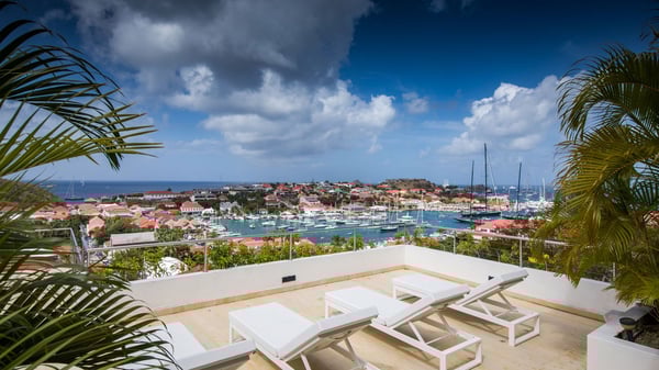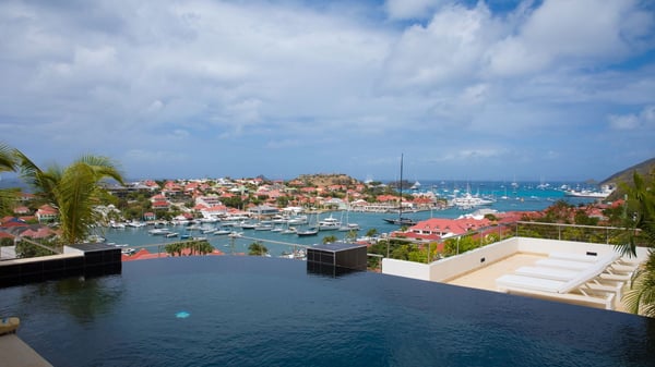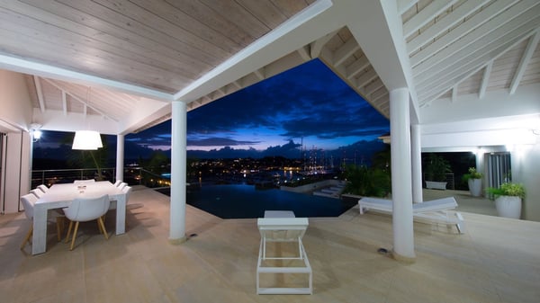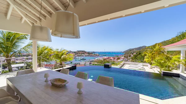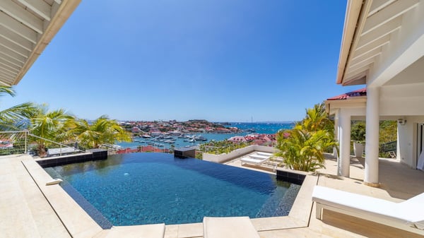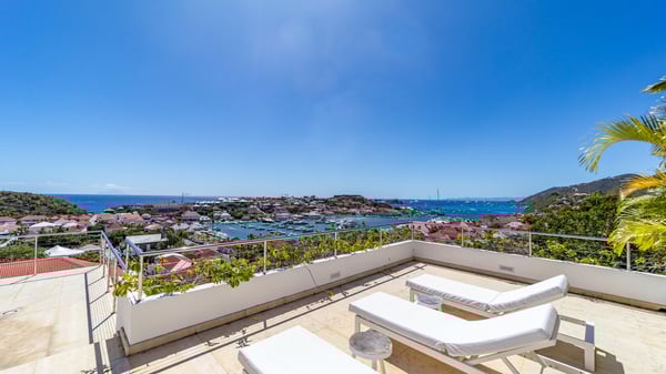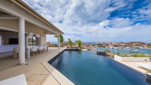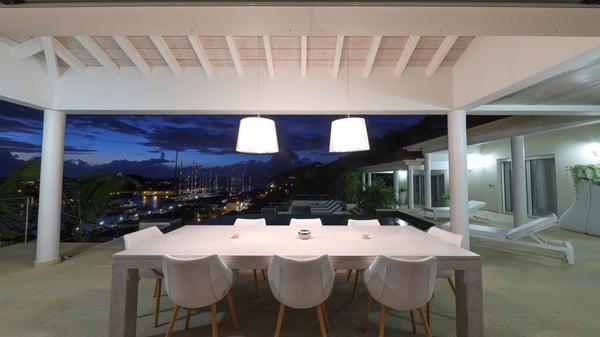 Ideally located on the heights of Gustavia, the rental villa Prestige is an exceptional property with splendid views over the harbour and yachts, the ocean, as well as the fabulous Caribbean sunsets. This three air-conditioned bedroom rental is the perfect vacation spot for a group of friends wishing to enjoy the city’s lively atmosphere while enjoying the luxury and comfort of this sumptuous vacation home in St. Barths. Villa Prestige is centrally located, allowing guests to walk in Gustavia and enjoy shops, restaurants and strolls around the harbour. Newly built and tastefully decorated in a both minimalist and elegant style, Prestige is a spacious property with a large, open and comfortable living room facing the panorama over the ocean and the harbour. White and cream-colour hints create a bright atmosphere perfect for relaxing. The indoor dining room can accommodate up to six guests around the beautiful white table for meals prepared in the lovely well-equipped kitchen. You may prefer to dine alfresco around the outdoor dining table for eight guests in the gentle island breeze, enjoying the exceptional light of St. Barths. At the front, the large terrace is furnished with a beautiful swimming pool where you’ll enjoy relaxing at any time. Sun loungers are harmoniously set up on the large deck facing the view over the harbour, the yachts and the perfect horizon. In the evening, a true light show takes place with the glowing sunsets mixed with the fairy city lights. The rental villa Prestige welcomes you in three beautiful air-conditioned bedrooms with private bathrooms and view over the harbour. Two of them feature king-size beds while the third one is equipped with twin beds. Colours are soft in a mineral palette of white and gray in soothing light. All rooms open onto the view and the large terrace, to enjoy the outdoor living spaces at any time. Only a few steps away from Shell Beach, the vacation villa Prestige is a charming property elegantly combining the lively city way of life with upscale amenities, for an unforgettable stay in St. Barts.