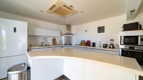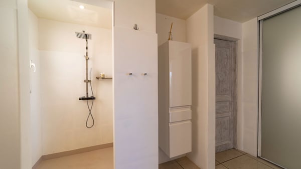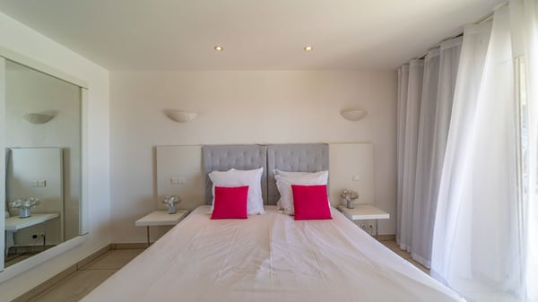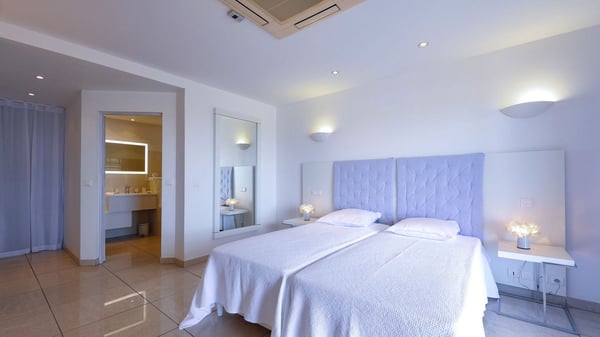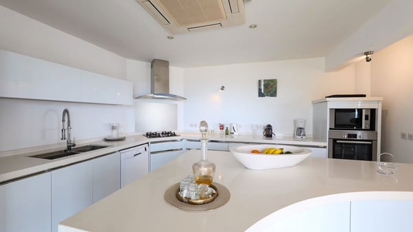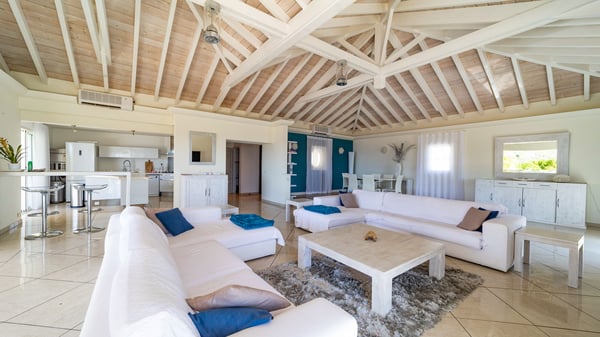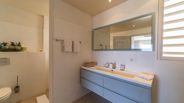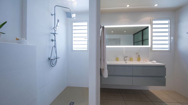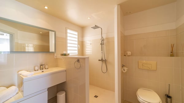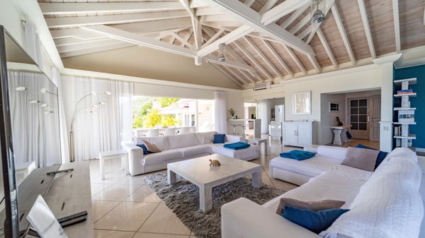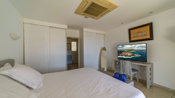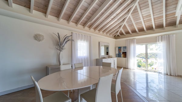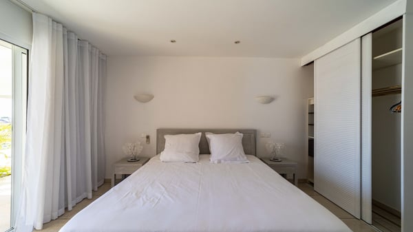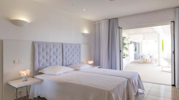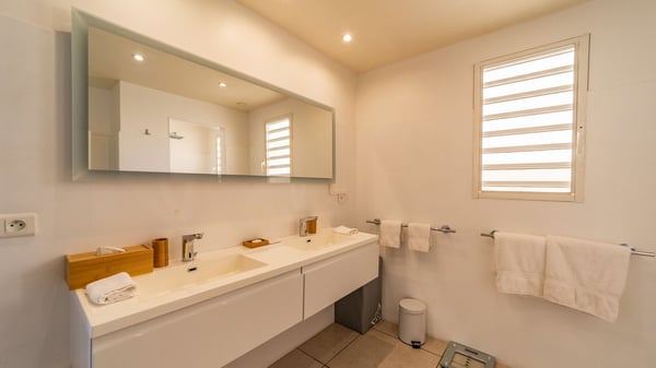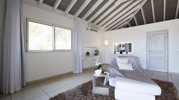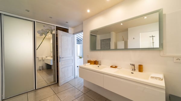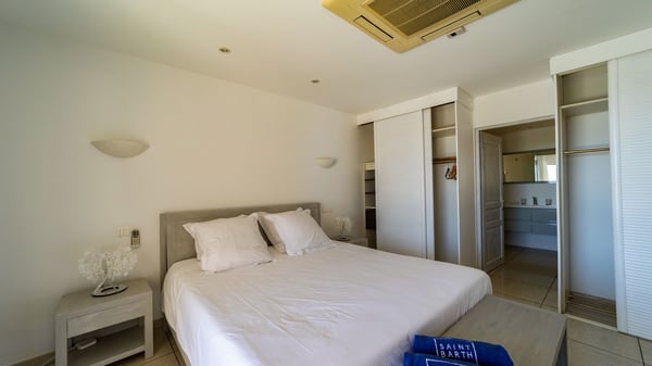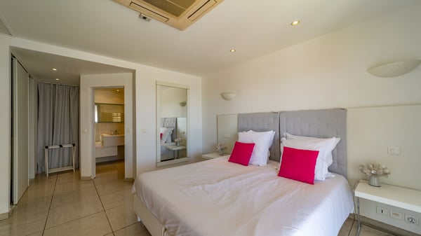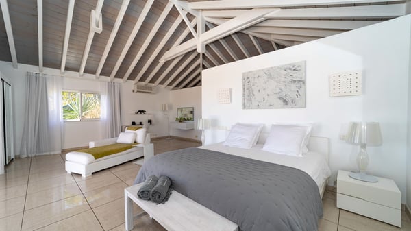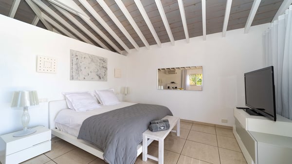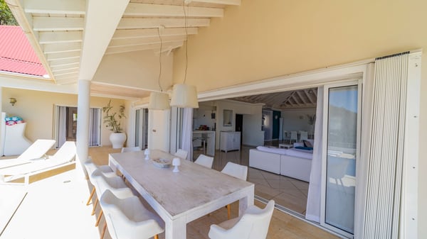 Ideally located on the heights of Gustavia, the rental villa Prestige is an exceptional property with splendid views over the harbour and yachts, the ocean, as well as the fabulous Caribbean sunsets. This three air-conditioned bedroom rental is the perfect vacation spot for a group of friends wishing to enjoy the city’s lively atmosphere while enjoying the luxury and comfort of this sumptuous vacation home in St. Barths. Villa Prestige is centrally located, allowing guests to walk in Gustavia and enjoy shops, restaurants and strolls around the harbour. Newly built and tastefully decorated in a both minimalist and elegant style, Prestige is a spacious property with a large, open and comfortable living room facing the panorama over the ocean and the harbour. White and cream-colour hints create a bright atmosphere perfect for relaxing. The indoor dining room can accommodate up to six guests around the beautiful white table for meals prepared in the lovely well-equipped kitchen. You may prefer to dine alfresco around the outdoor dining table for eight guests in the gentle island breeze, enjoying the exceptional light of St. Barths. At the front, the large terrace is furnished with a beautiful swimming pool where you’ll enjoy relaxing at any time. Sun loungers are harmoniously set up on the large deck facing the view over the harbour, the yachts and the perfect horizon. In the evening, a true light show takes place with the glowing sunsets mixed with the fairy city lights. The rental villa Prestige welcomes you in three beautiful air-conditioned bedrooms with private bathrooms and view over the harbour. Two of them feature king-size beds while the third one is equipped with twin beds. Colours are soft in a mineral palette of white and gray in soothing light. All rooms open onto the view and the large terrace, to enjoy the outdoor living spaces at any time. Only a few steps away from Shell Beach, the vacation villa Prestige is a charming property elegantly combining the lively city way of life with upscale amenities, for an unforgettable stay in St. Barts.