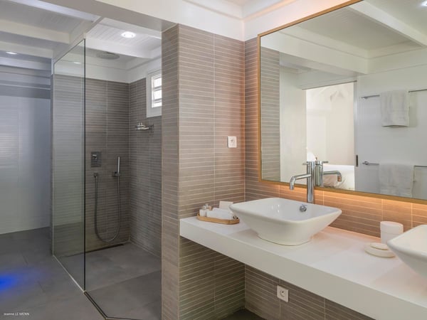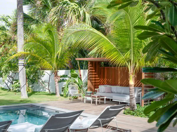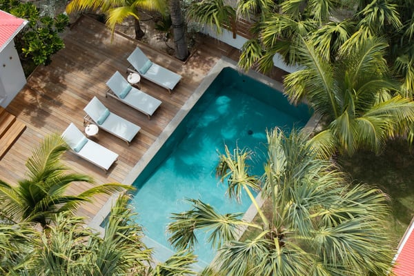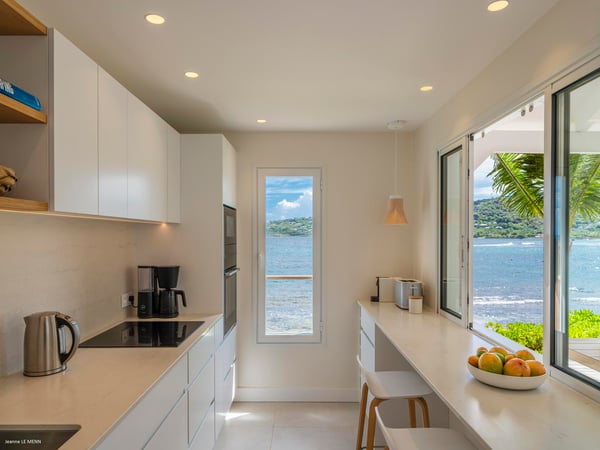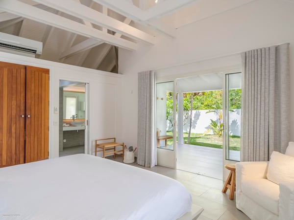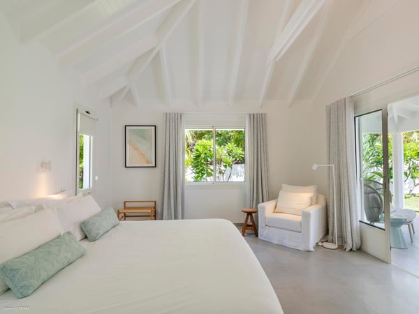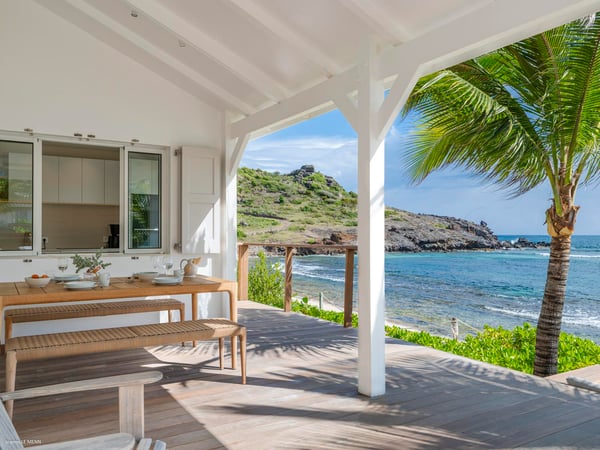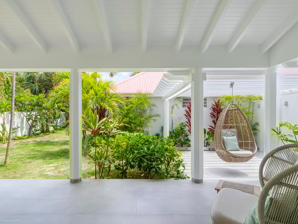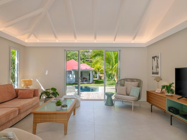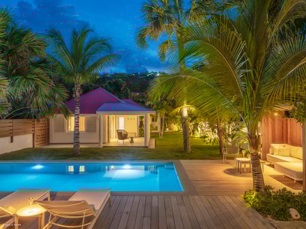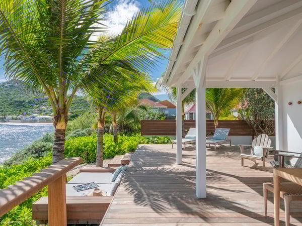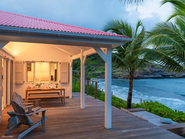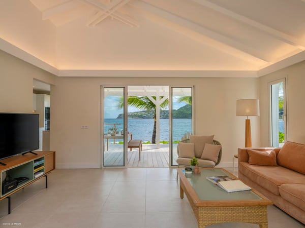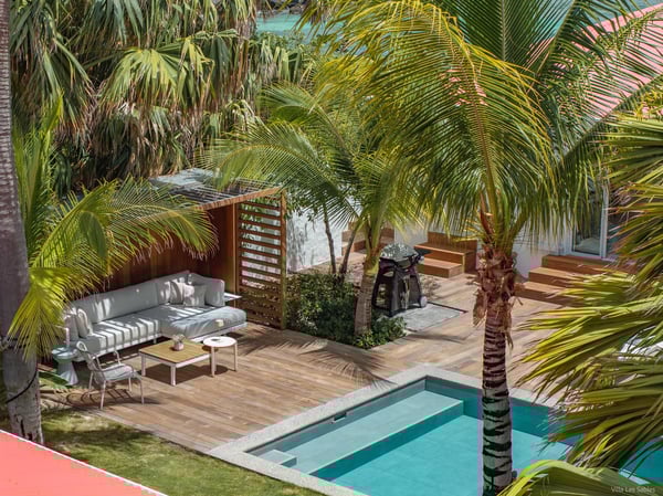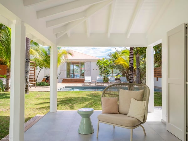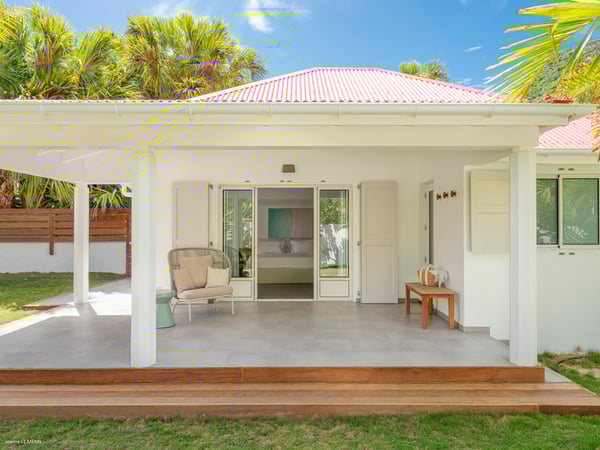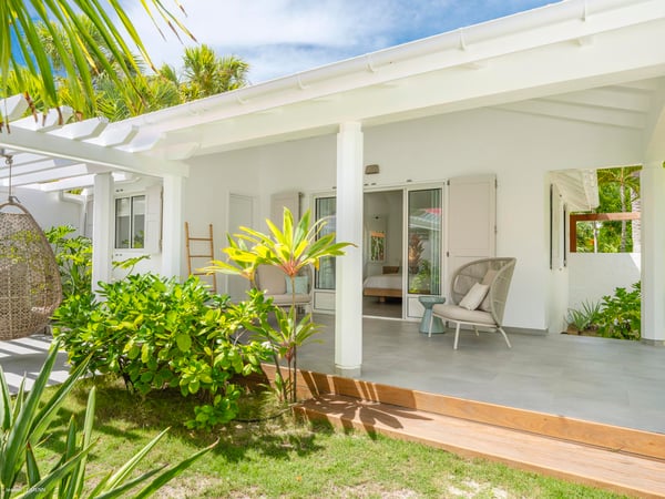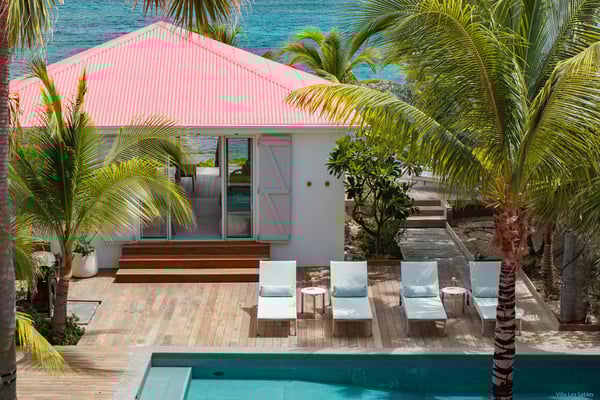 Villa Les Sables indulges its guests with the best of all worlds: a terrace just steps from the sea, green lawns and swaying palms, a refreshing pool, and classic Caribbean comfort. This property's charm and convenient Lorient location make it ideal for both couples and families. Villa Les Sables is composed of separate bungalows set back from the road, each bungalow with its own kitchenette in addition to the main kitchen. The bedrooms are similar in size and accommodation. The living room is in a separate bungalow and opens toward the beach on one side and to the deck and pool on the other.