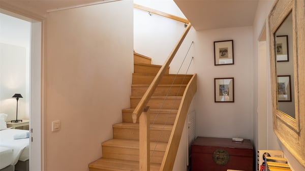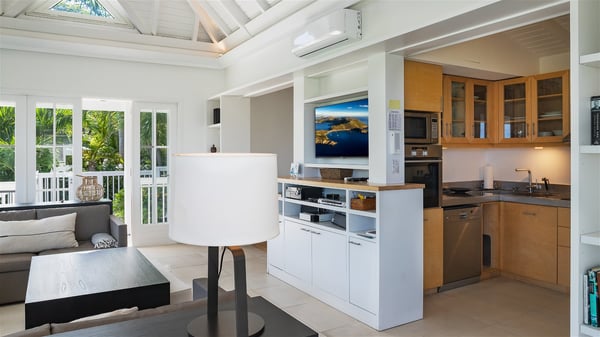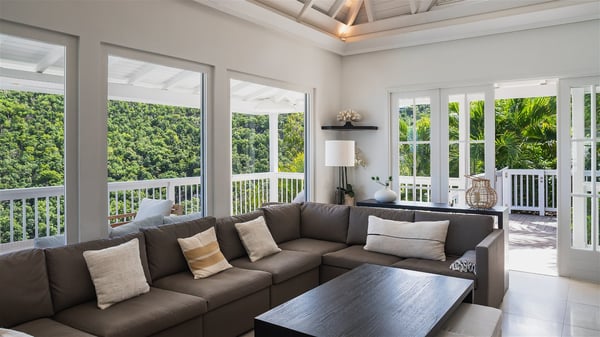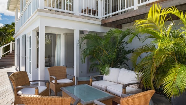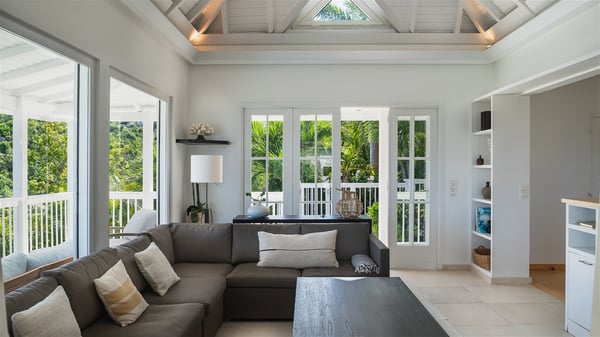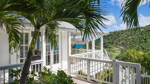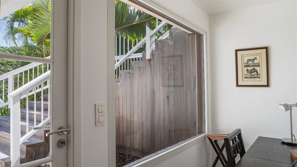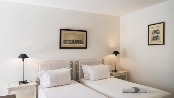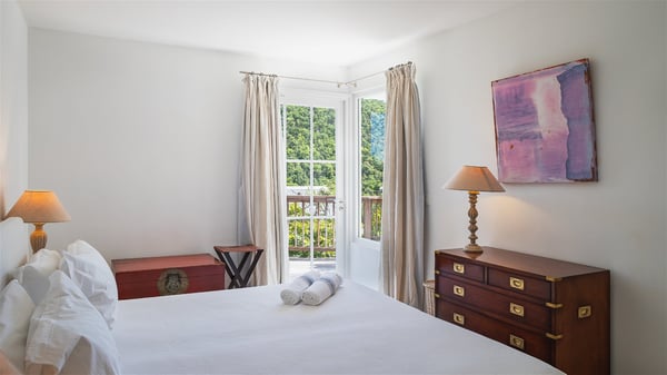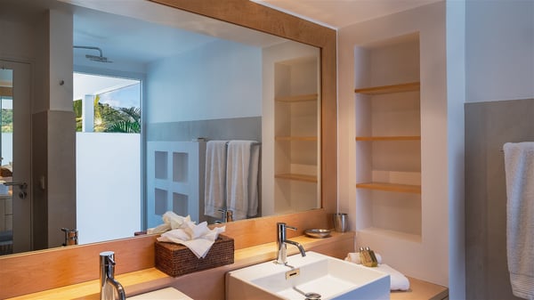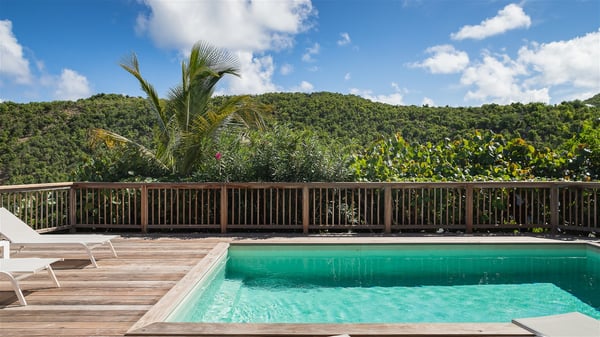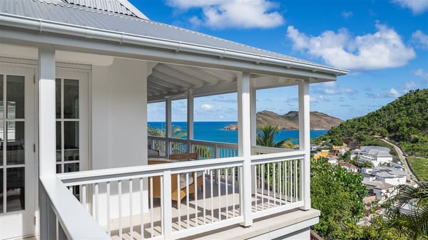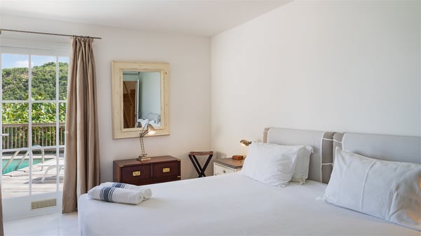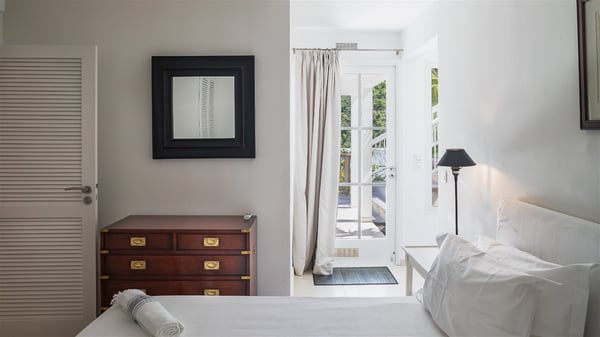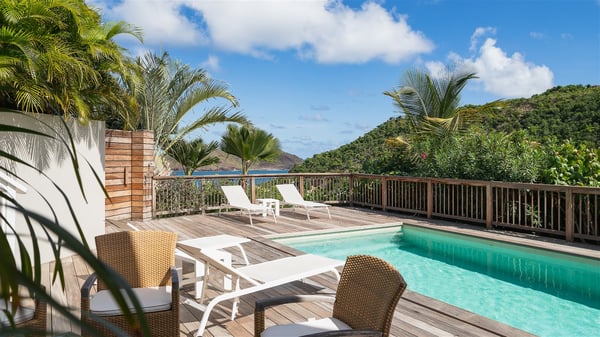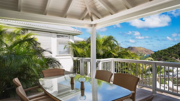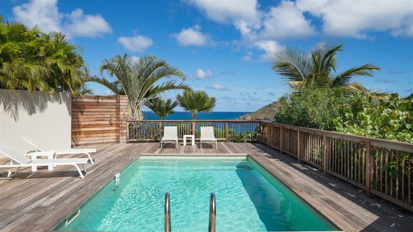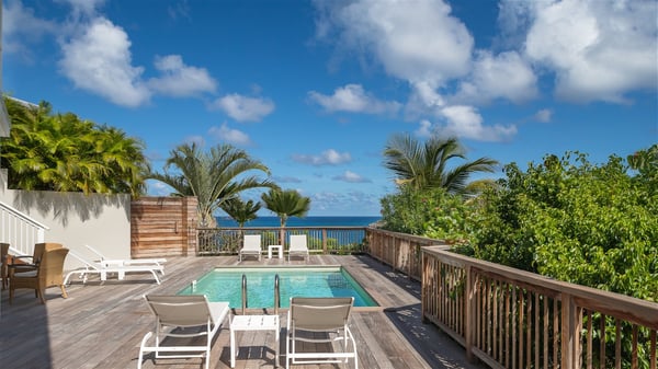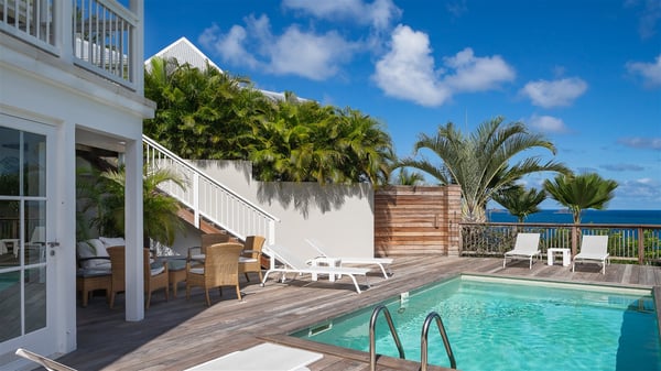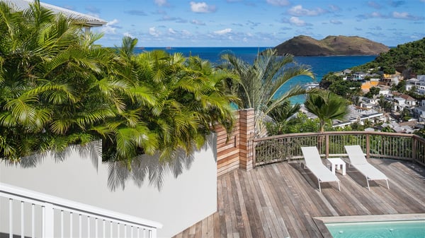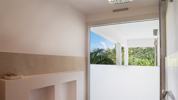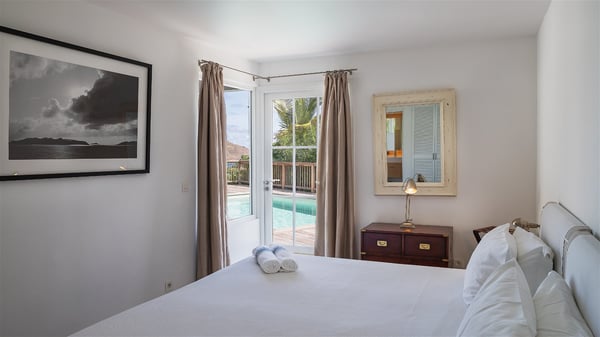 Located only a few steps away from the beautiful Flamands beach, the charming vacation rental Art offers a splendid view over the ocean, the beach and the surrounding islands. Located in the private domain of Roc Flamands, the property is built on two levels and features comfortable and modern spaces, in an architecture in perfect harmony with nature and tropical vegetation. On the first floor, the bright, fully glazed and air-conditioned living room features modern and comfortable furniture with a large sofa covered with cushions and a coffee table under a mansard ceiling providing a pleasant sense of volume. The kitchen is well equipped for meals preparation that can be enjoyed under the covered terrace with a large dining table in rattan and glass for six guests. A space with high stools welcomes you next to the gas barbecue for delightful gastronomic evenings. A little further along this outdoor gallery facing the view, there is a lovely space perfect for talking comfortably installed in the outdoor lounge. Take a few steps below via the indoor or outdoor staircase, and you’ll find the magnificent terrace with a fantastic view over Flamands Beach and the ocean. The large heated lagoon-coloured swimming pool is surrounded by lounge chairs for relaxing moments. Coming with wooden floor and garden furniture, this terrace is a true dream place in the heart of a green and lush environment. On the lower level of villa Art, three beautiful air-conditioned rooms welcome you for a stay with family or friends in St. Barths. All three have a king-size bed that can be converted into twin beds upon request. The first bedroom has its own private bathroom while the other two share a comfortable one with double sinks and rain shower. The clean and bright decoration creates a quiet and serene atmosphere for your stay in Saint-Barthelemy.