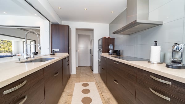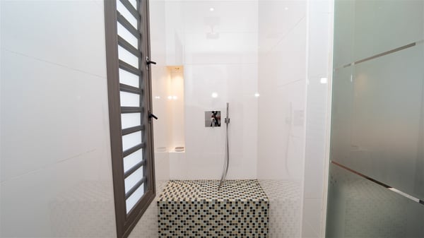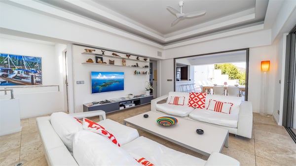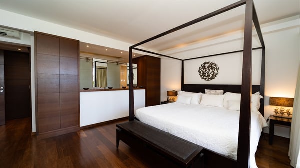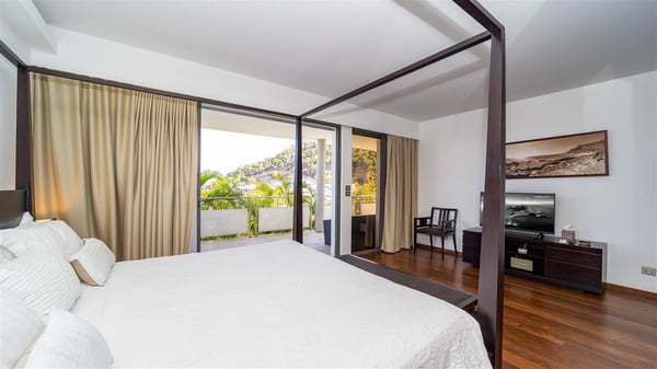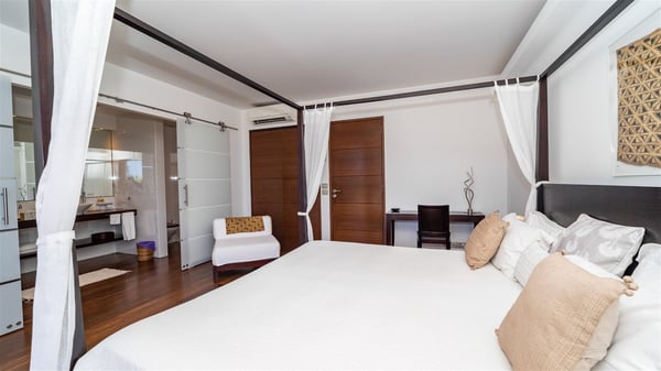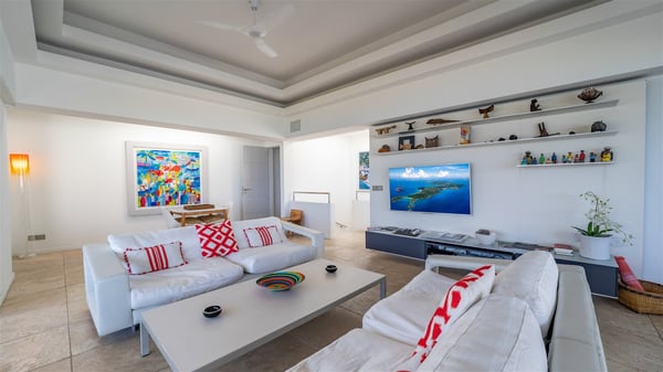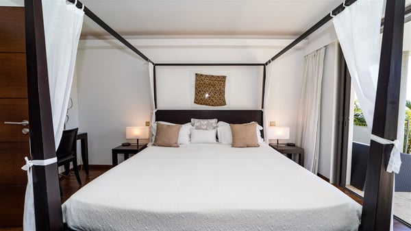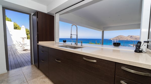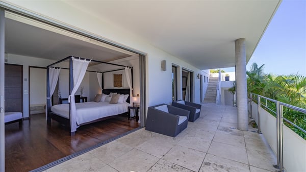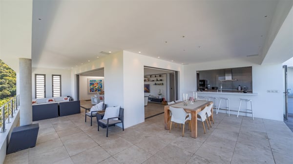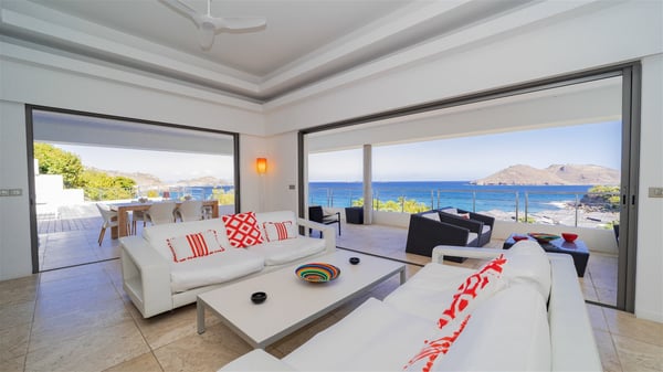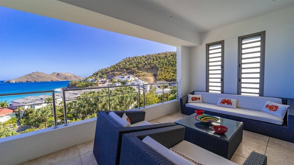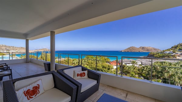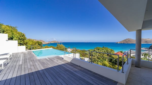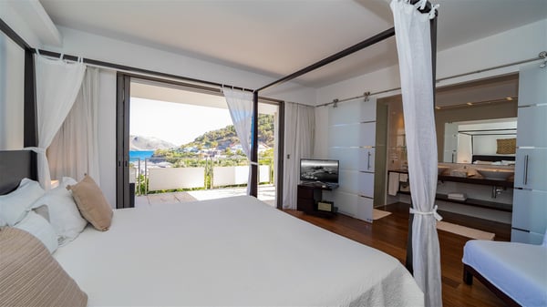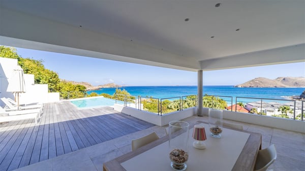 Built on the hills of Flamands, the sumptuous rental villa Matajagui offers a high range of services in a refined and modern atmosphere. Located only a few steps away from the Flamands beach, this charming property is built over two storeys and has an open-air and sleek design, making it the ideal place for unforgettable holidays in St-Barths. As soon as you get in the house, you will be mesmerized by the sweeping view over the ocean and the island of Bonhomme. Everything melds nicely in a perfect harmony of elements between indoor and outdoor spaces. The light and uncluttered decoration lets your mind escape for a total change of scenery in St-Barthelemy. The living room furnished with comfortable white leather sofas faces the terrace and the pool, overlooking the Flamands Bay. This large room entirely opens onto the outside, in the gentle trade winds. This is also the perfect place to enjoy a movie or just relax in the couches. The contemporary and well-equipped kitchen has a bar through which you can have breakfast under the covered terrace, a few steps from the pool. Outside, the large terrace gracefully merges with the indoor living room. The dining room can accommodate up to six guests around a woven fibre table, facing the panorama of Flamands Bay and the neighbouring islands. In the heart of the hills, the Saint-Barth wooded landscape is stunningly beautiful. At the front, there is a splendid heated infinity swimming pool for delicious moments of swimming and relaxing. You’ll also enjoy the outdoor living room on the gallery, as well as the lounge chairs lined up on the terrace along the white walls of this contemporary vacation home, facing the horizon. Ideal for a family or two couples travelling together, the rental villa Matajagui has two beautiful air-conditioned bedrooms located on the lower level of the villa. Each room has a king-size four-poster bed, a private bathroom and a stunning ocean view. Dark wood, cream-coloured textiles, selected objects, soft cushions: the atmosphere of the rooms is elegant and cozy. A well-equipped fitness room is also at your disposal whenever you wish to do some exercises. The nearby road may sometimes make villa Matajagui a noisy place.
