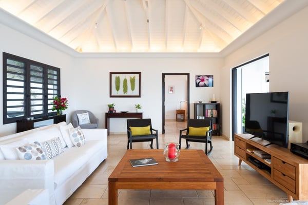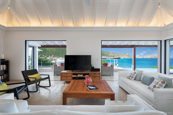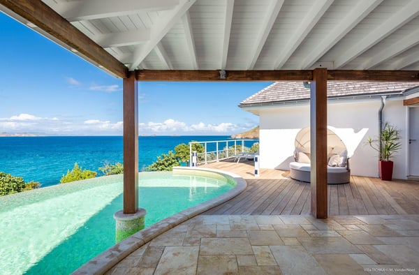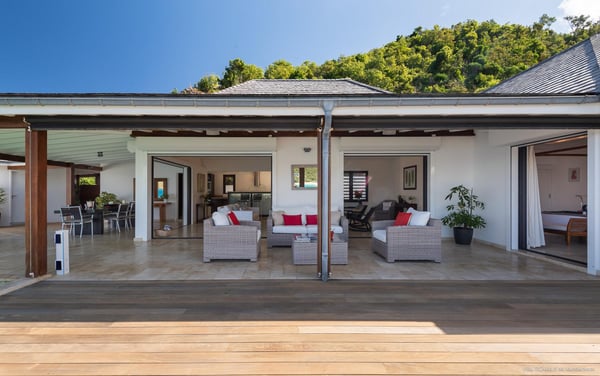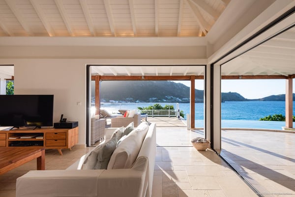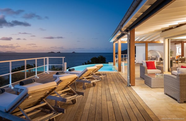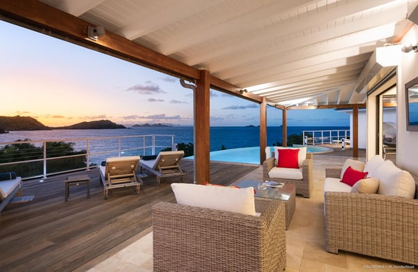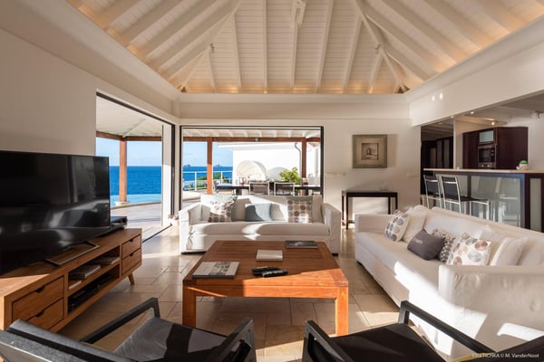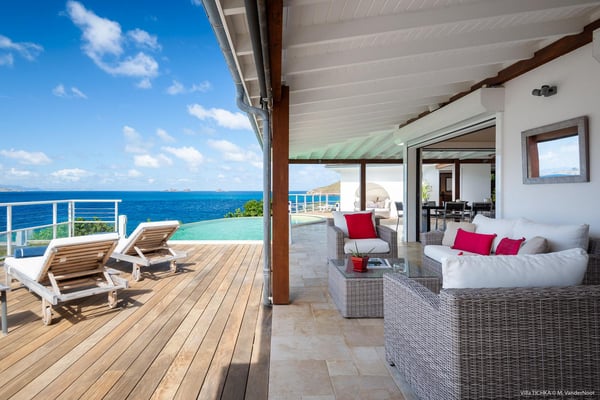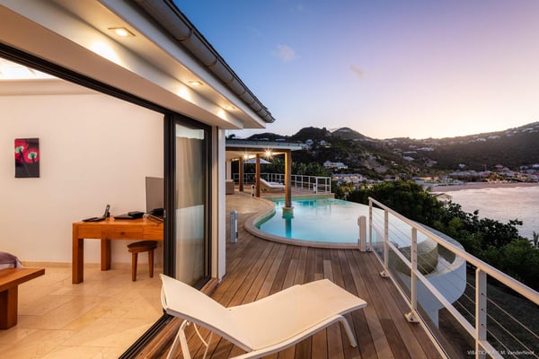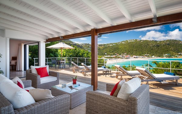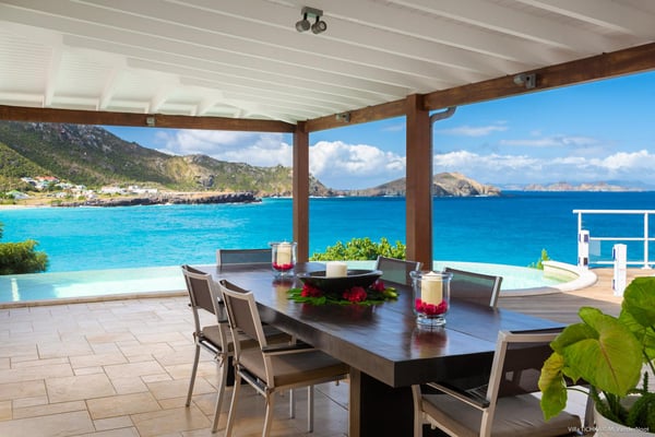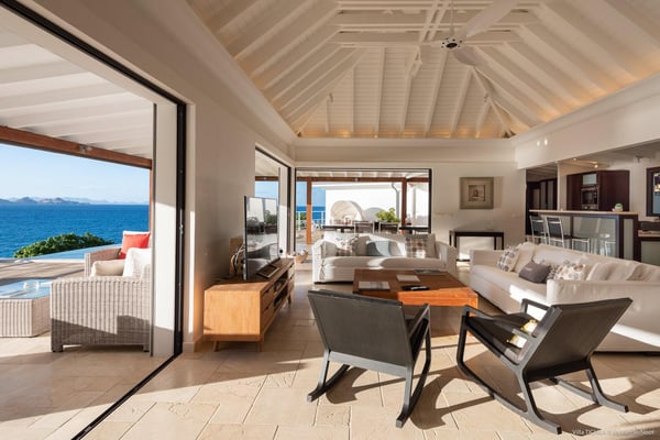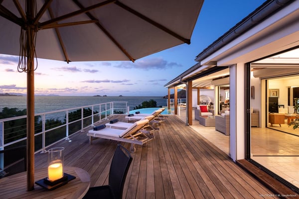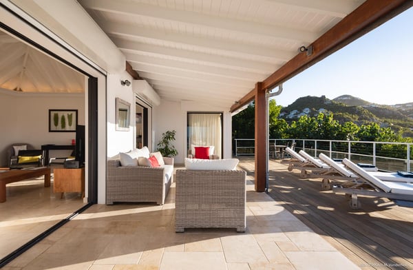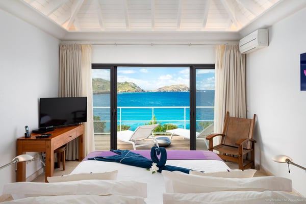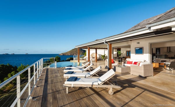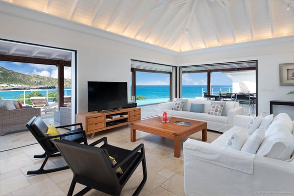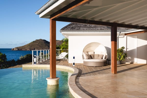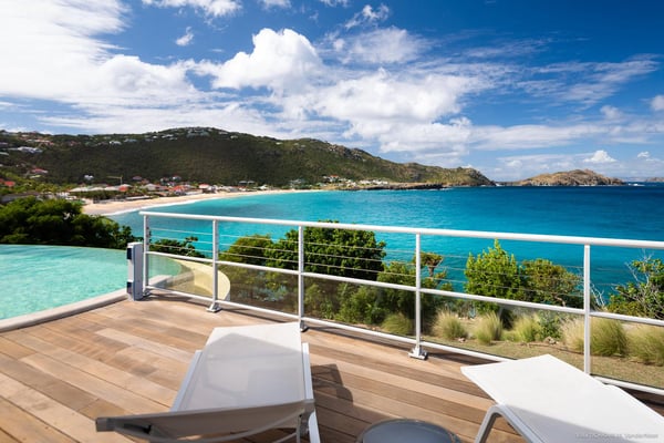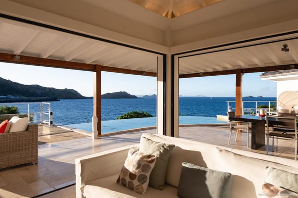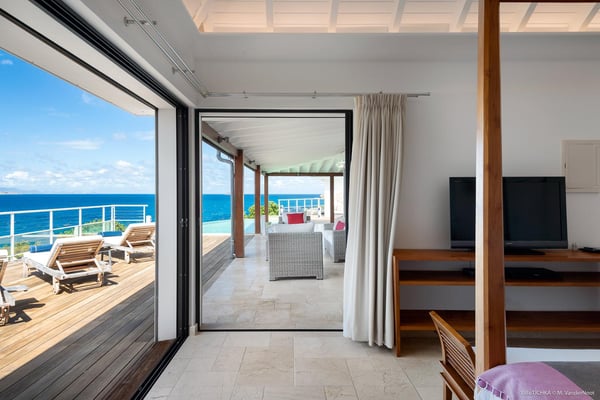 It is perfectly located above Flamands beach of facing the sunset … Not too near the beautiful beach, just enough to give you a privacy, but at a feet distance to go down the stairs in stone in the garden from the beach… From the villa you could walk to the beach restaurants of “Isle de France” or “La Langouste”, you could make your jogging on the beach every morning, or just jump on the ocean… and then come back to the villa. Maybe the perfect villa to stay to recharge your batteries… The ocean view encircles all the beach, and the ocean towards the islands of Bonhomme, Fourchue, St. Martin, and Anguilla… A large sun deck and the infinity pool are overlooking the beach of Flamands. The living room and the bedrooms have a direct view on the beach, and the ocean.