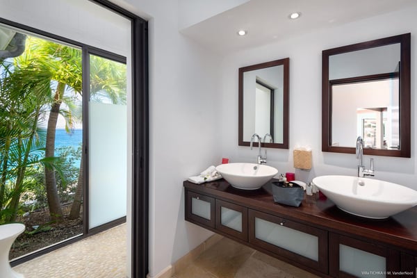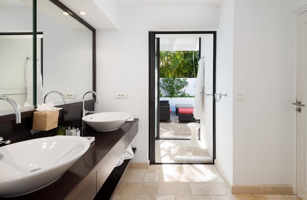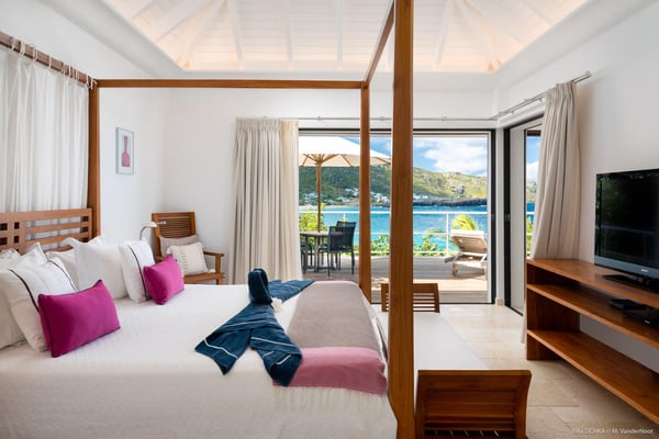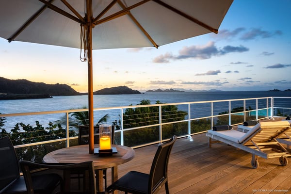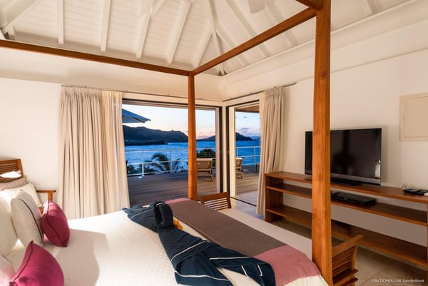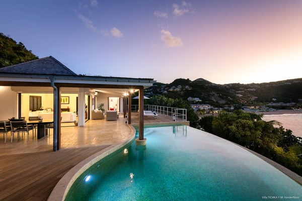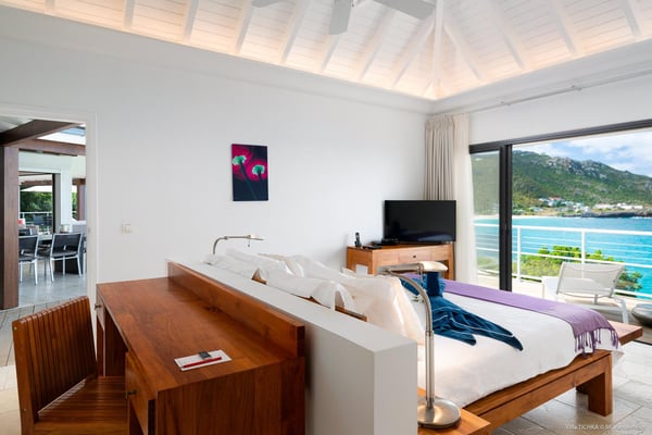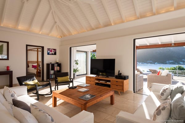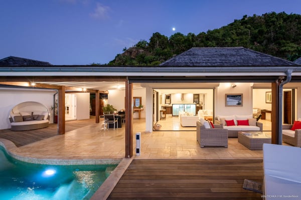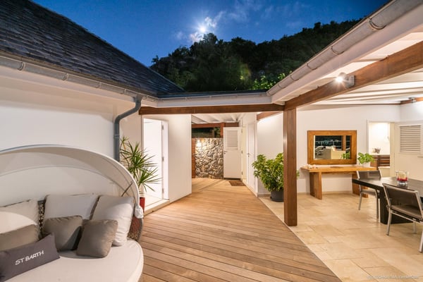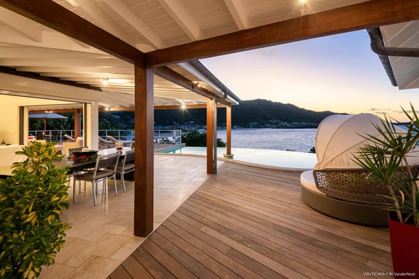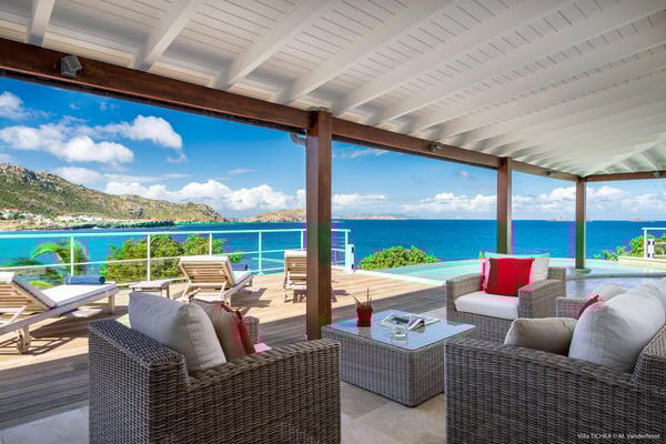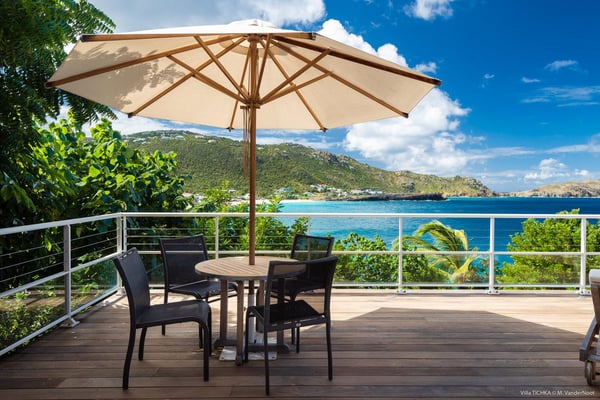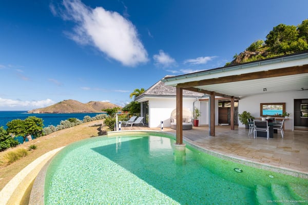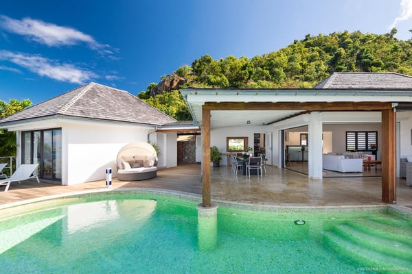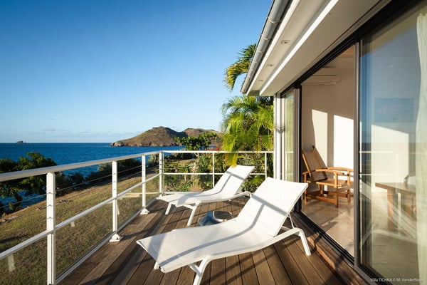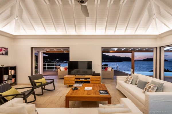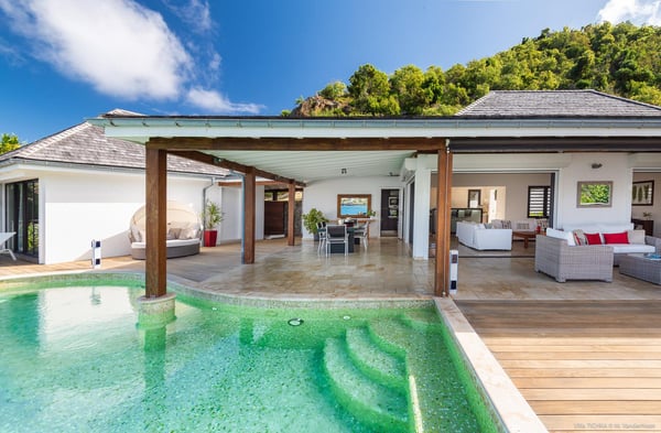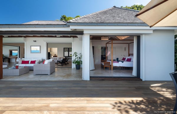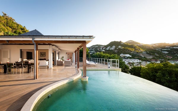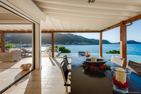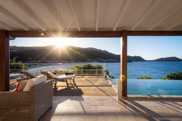 It is perfectly located above Flamands beach of facing the sunset … Not too near the beautiful beach, just enough to give you a privacy, but at a feet distance to go down the stairs in stone in the garden from the beach… From the villa you could walk to the beach restaurants of “Isle de France” or “La Langouste”, you could make your jogging on the beach every morning, or just jump on the ocean… and then come back to the villa. Maybe the perfect villa to stay to recharge your batteries… The ocean view encircles all the beach, and the ocean towards the islands of Bonhomme, Fourchue, St. Martin, and Anguilla… A large sun deck and the infinity pool are overlooking the beach of Flamands. The living room and the bedrooms have a direct view on the beach, and the ocean.